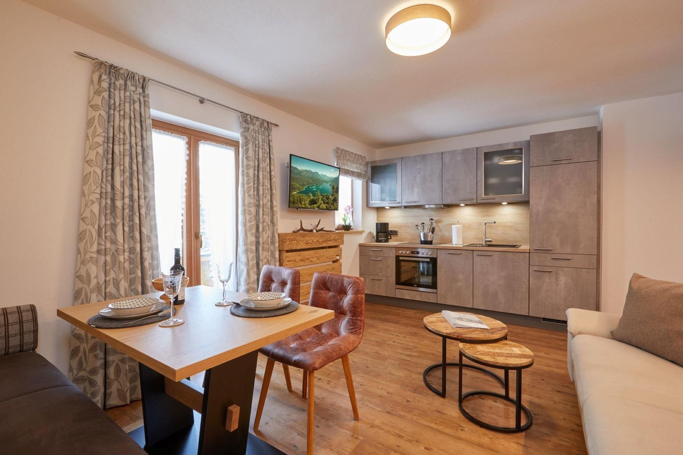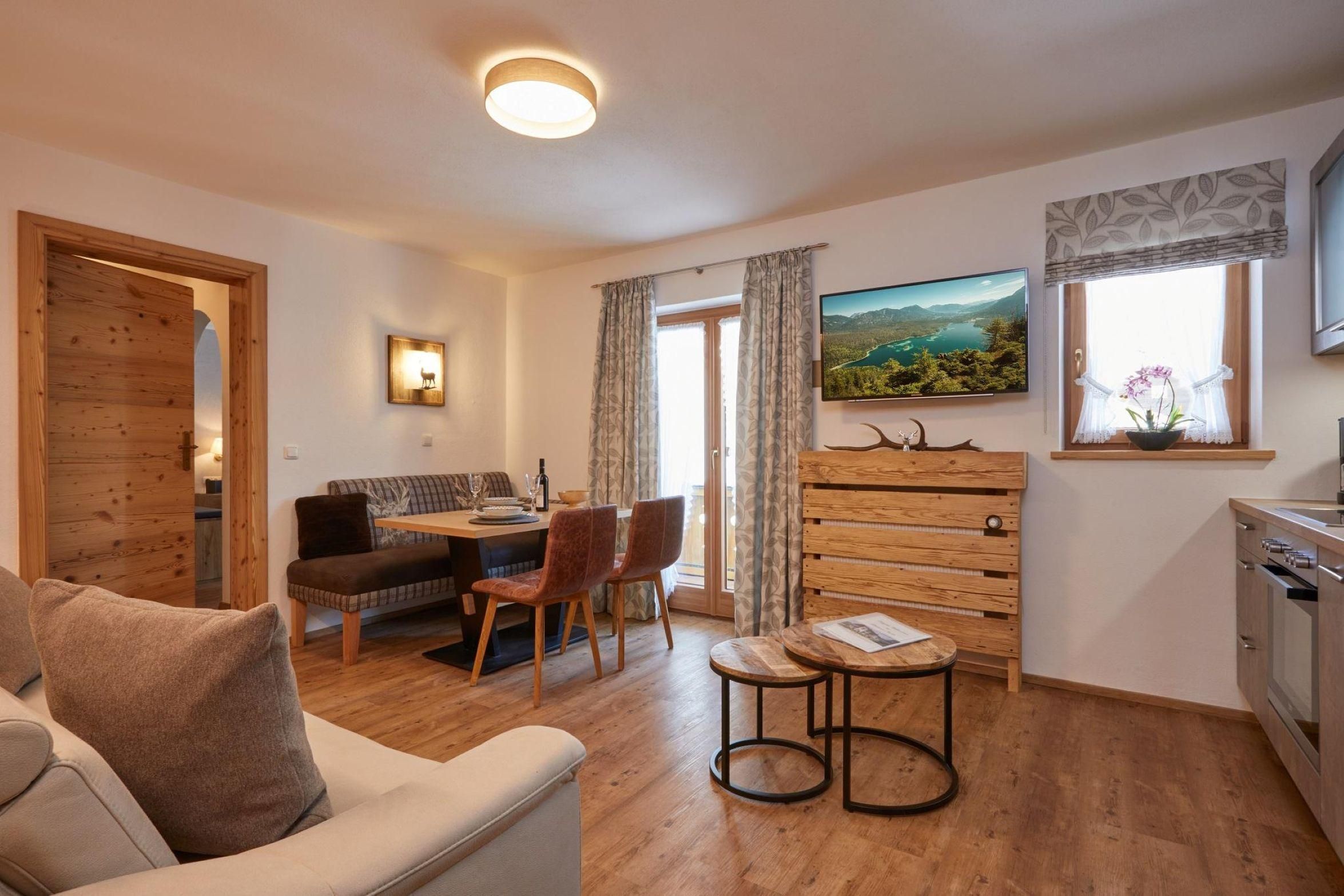 Hochwertige Ausstattung, Wohnung im 1. Stock mit möblierten Ostbalkon, ca. 47 qm mit Blick auf das Karwendelgebirge
