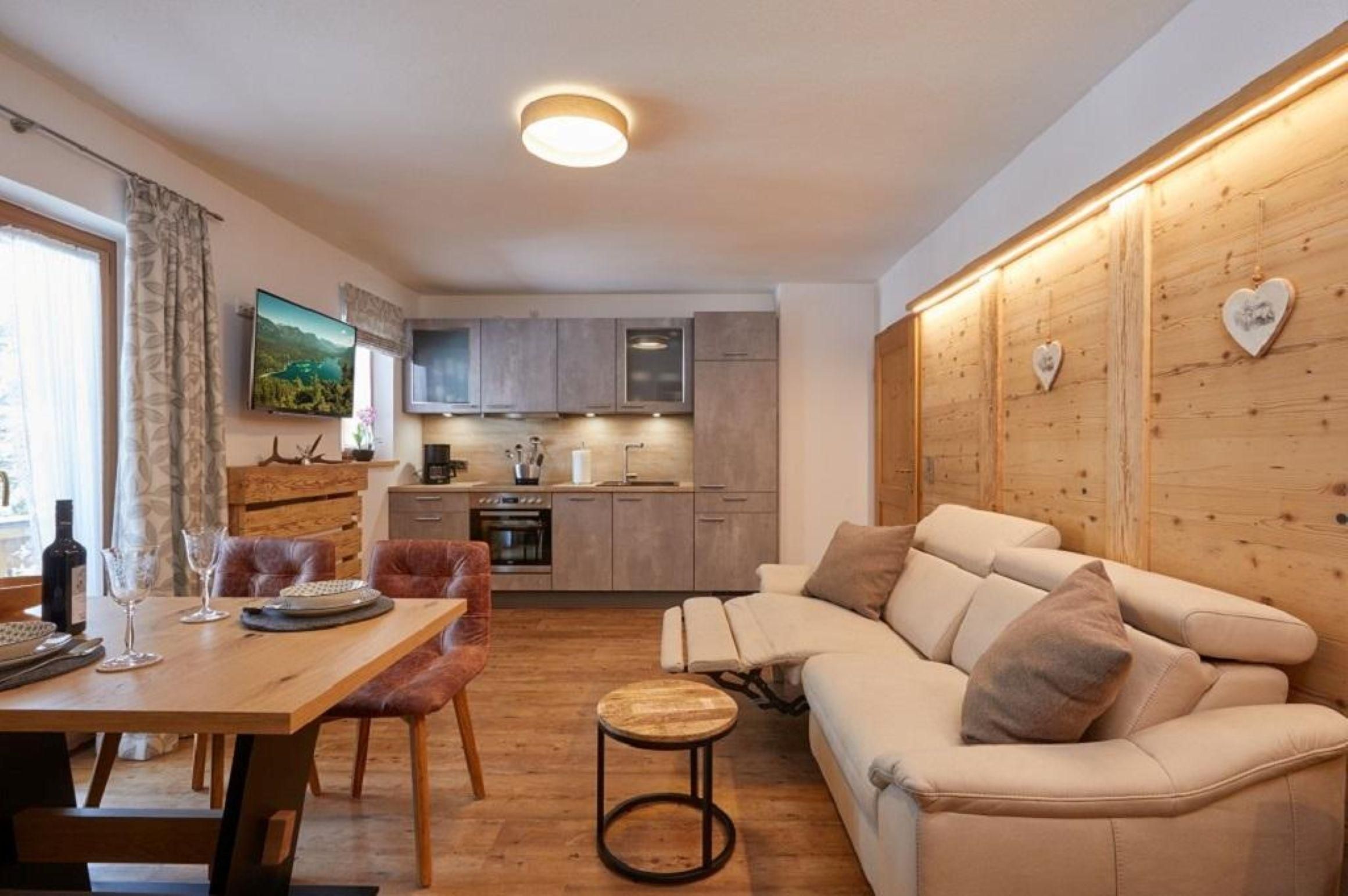 Wohnküche mit Küchenzeile, Spülmaschine, Backofen mit Ceranfeld, elektr. Geräte. Kabel-TV mit Videotext, Digitalradio, Zimmersafe, Granderwasser (belebtes Wasser) W-LAN kostenlos, Sitzbank mit Tisch und Stühle, Funktionssofa elktr. verstellbar, Holzvinylboden, Altholzwand