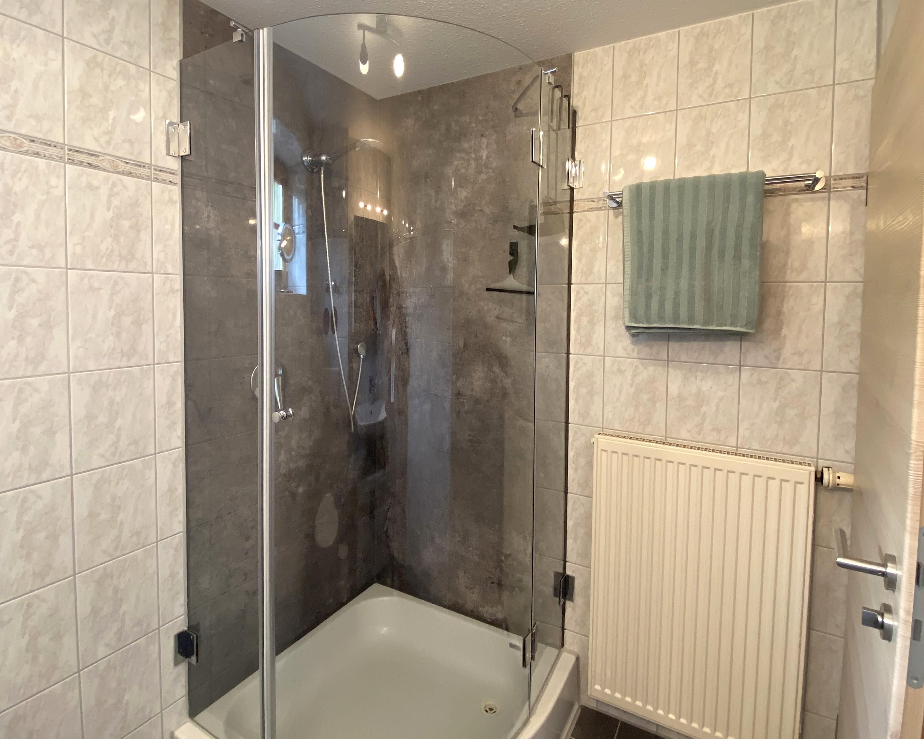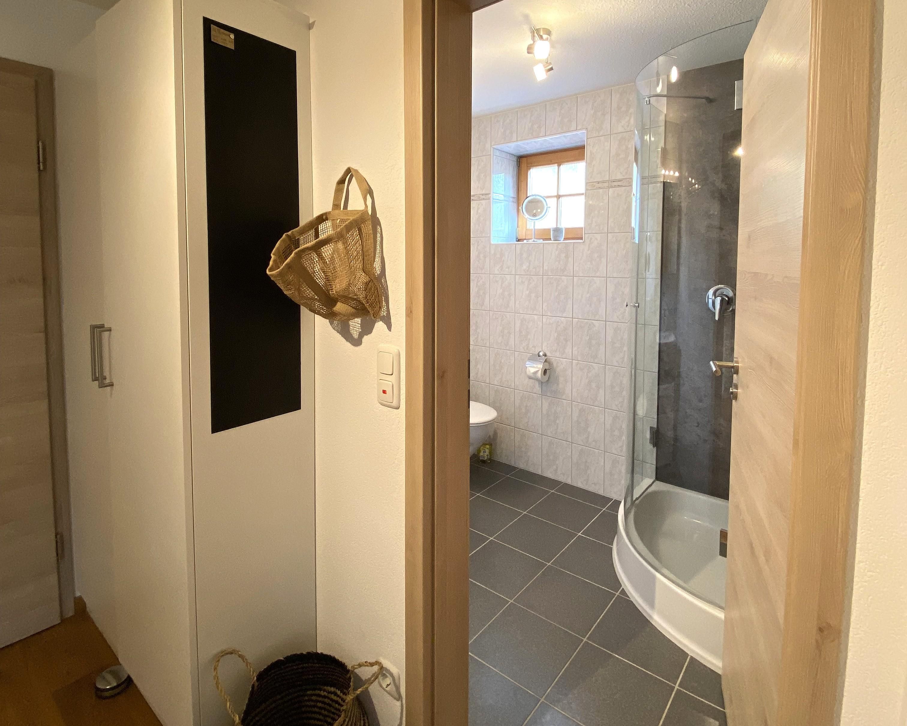 • Badezimmer mit Dusche und WC, Föhn, Kosmetikspiegel