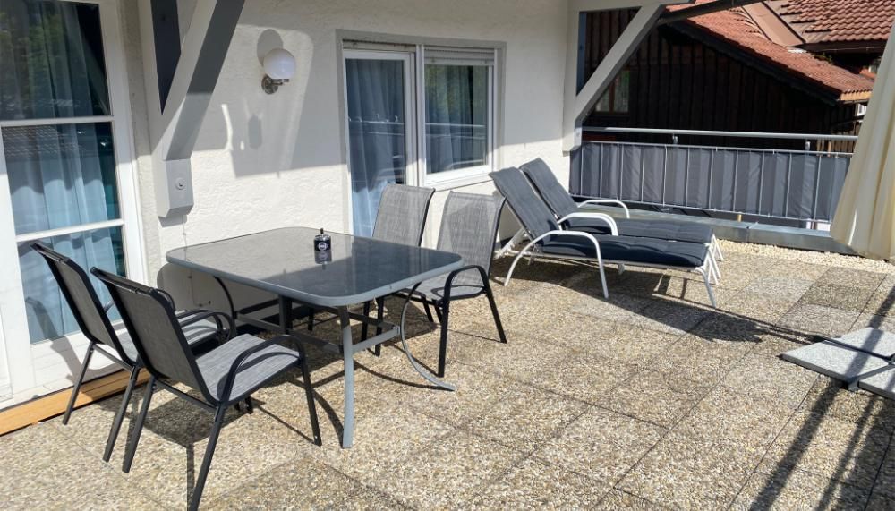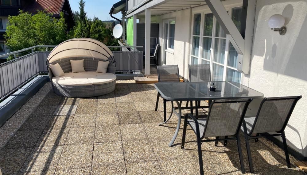 • große Sonnenterrasse mit Loungemöbeln (ca. 40qm) und Hochgratblick