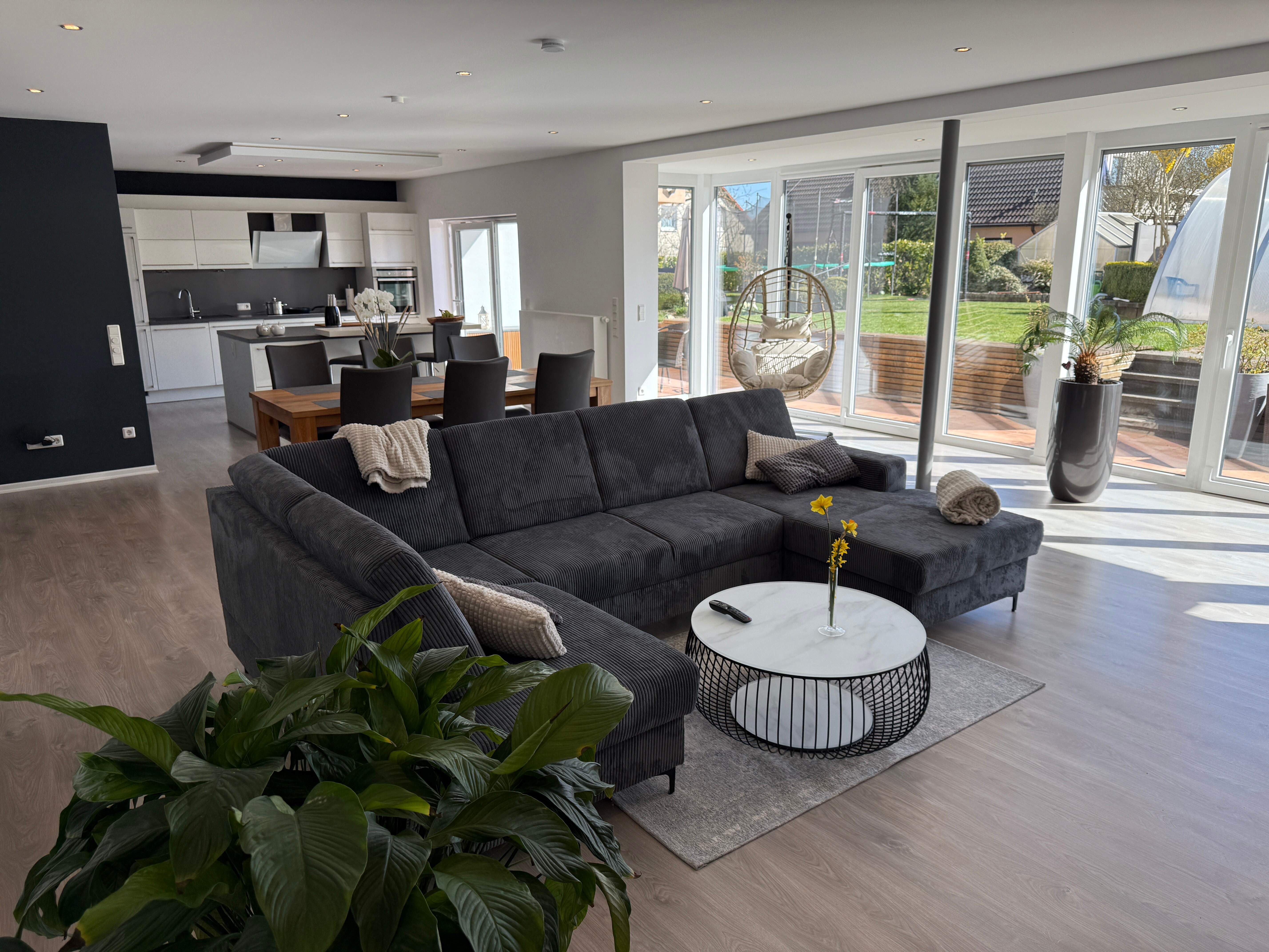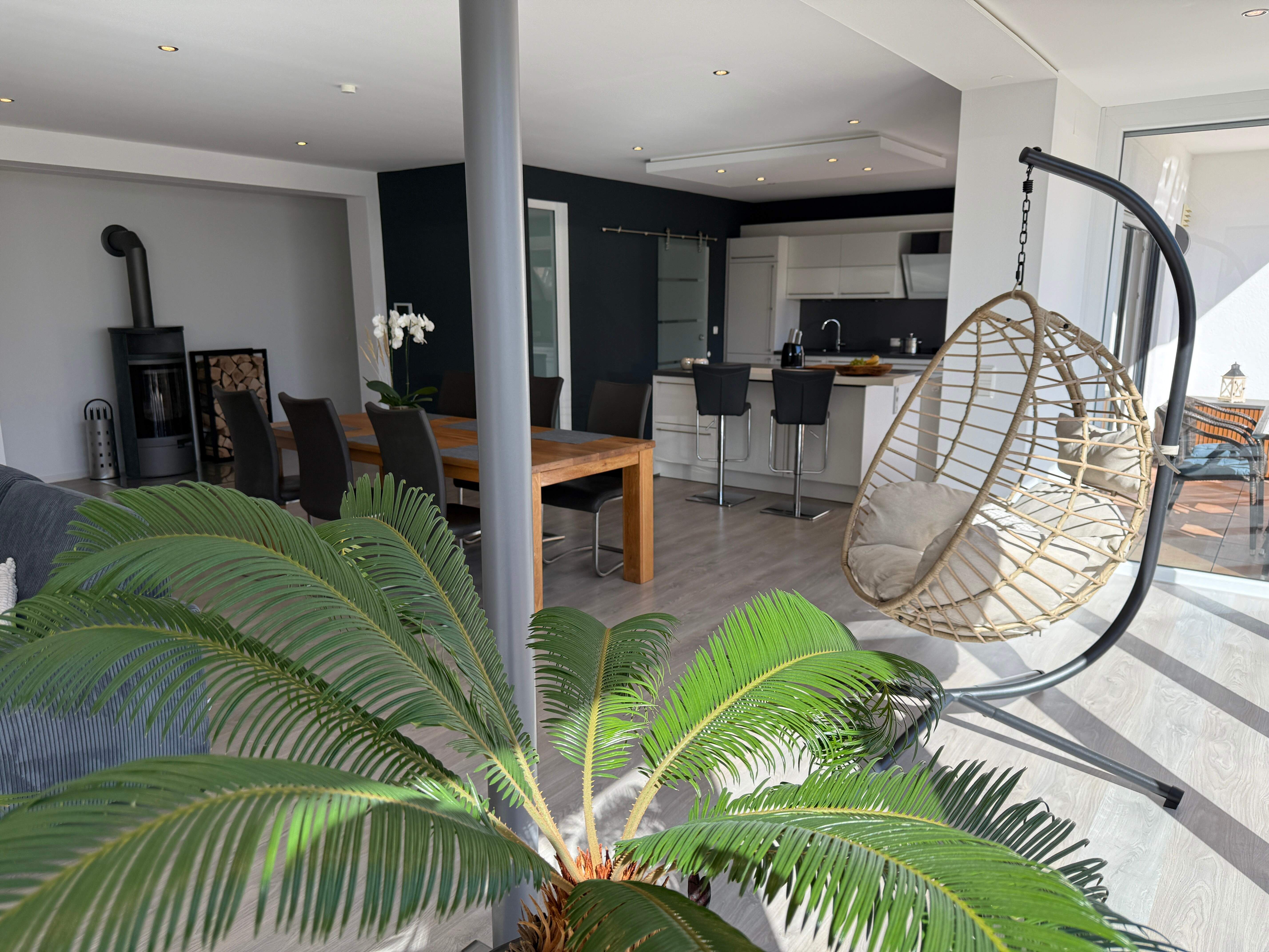 Die Wohnung liegt ruhig am Ortsrand von Ostheim und ist dennoch zentral gelegen. Sie verfügt über eine hochwertige Einrichtung mit Echtholzmöbeln im Wohn- und Essbereich, der weiterhin durch seine große Fensterfront besticht. An kühlen Tagen lädt der Kaminofen zum Entspannen ein. Die moderne und voll ausgestattete Küche mit Herd, Ofen, Geschirrspüler, Kühl- und Gefrierkombination, Mikrowelle, Wasserkocher, Filter- und Kapsel-Kaffeemaschine sowie weiteren Extras lässt keine Wünsche offen.