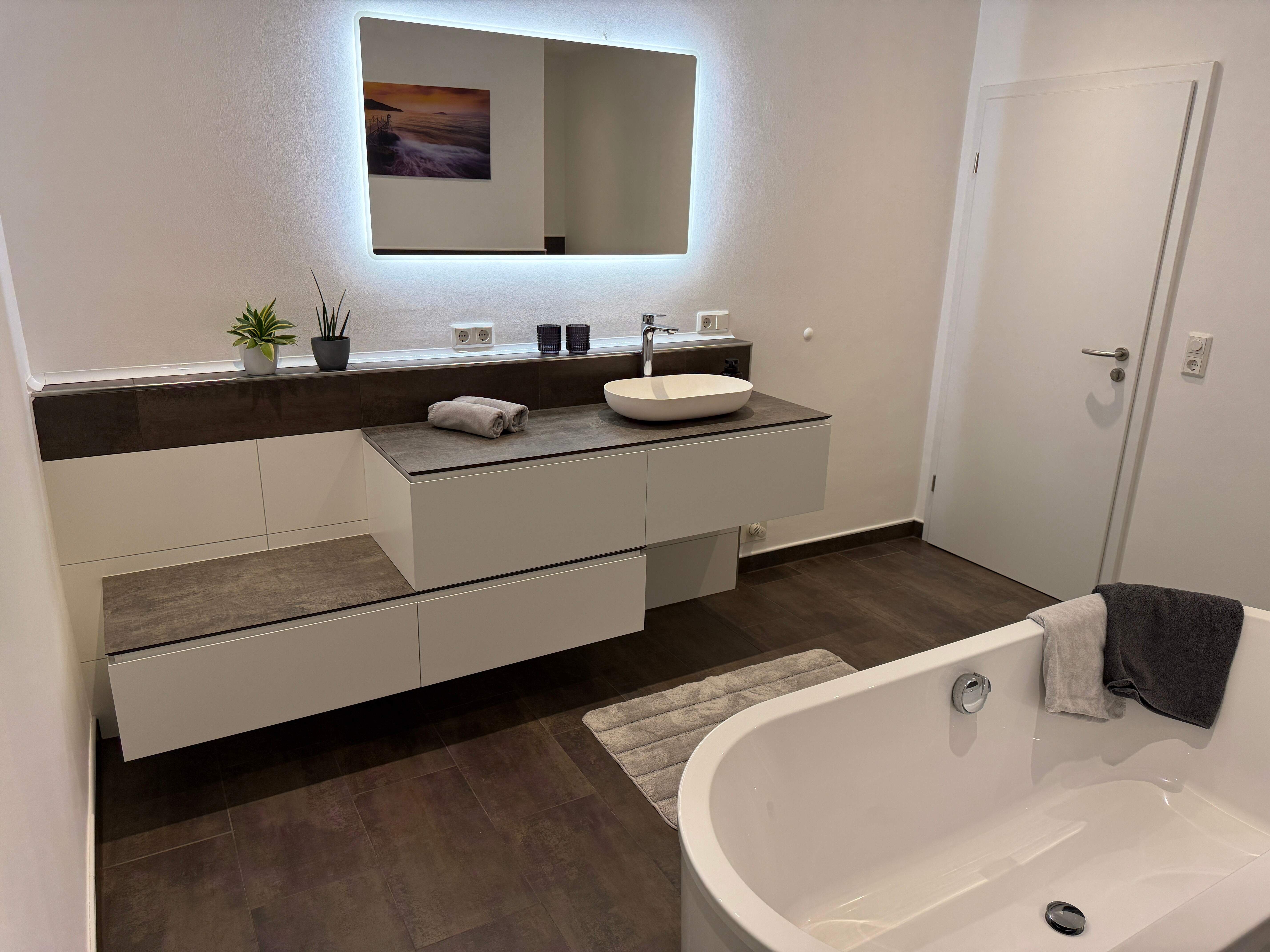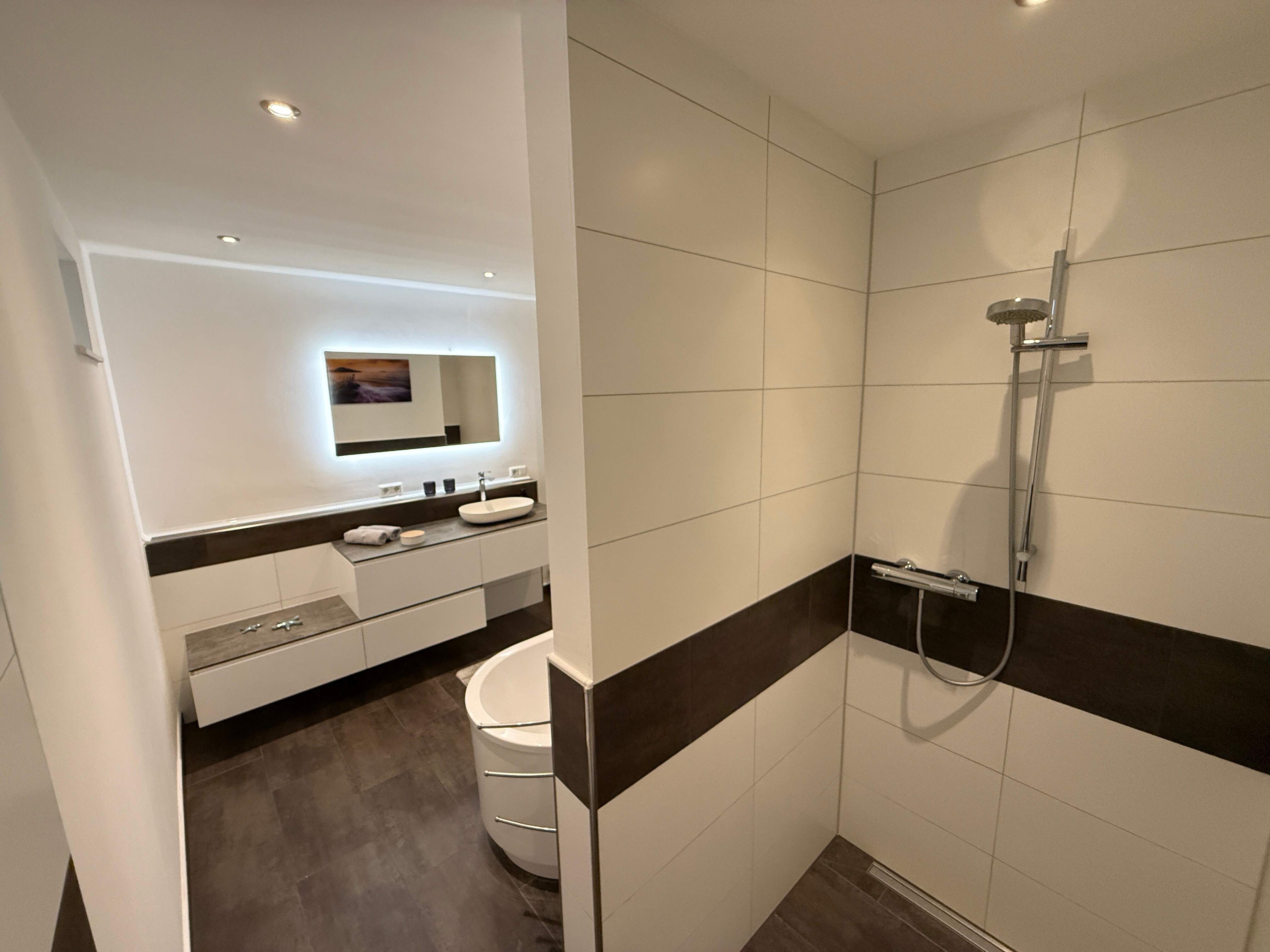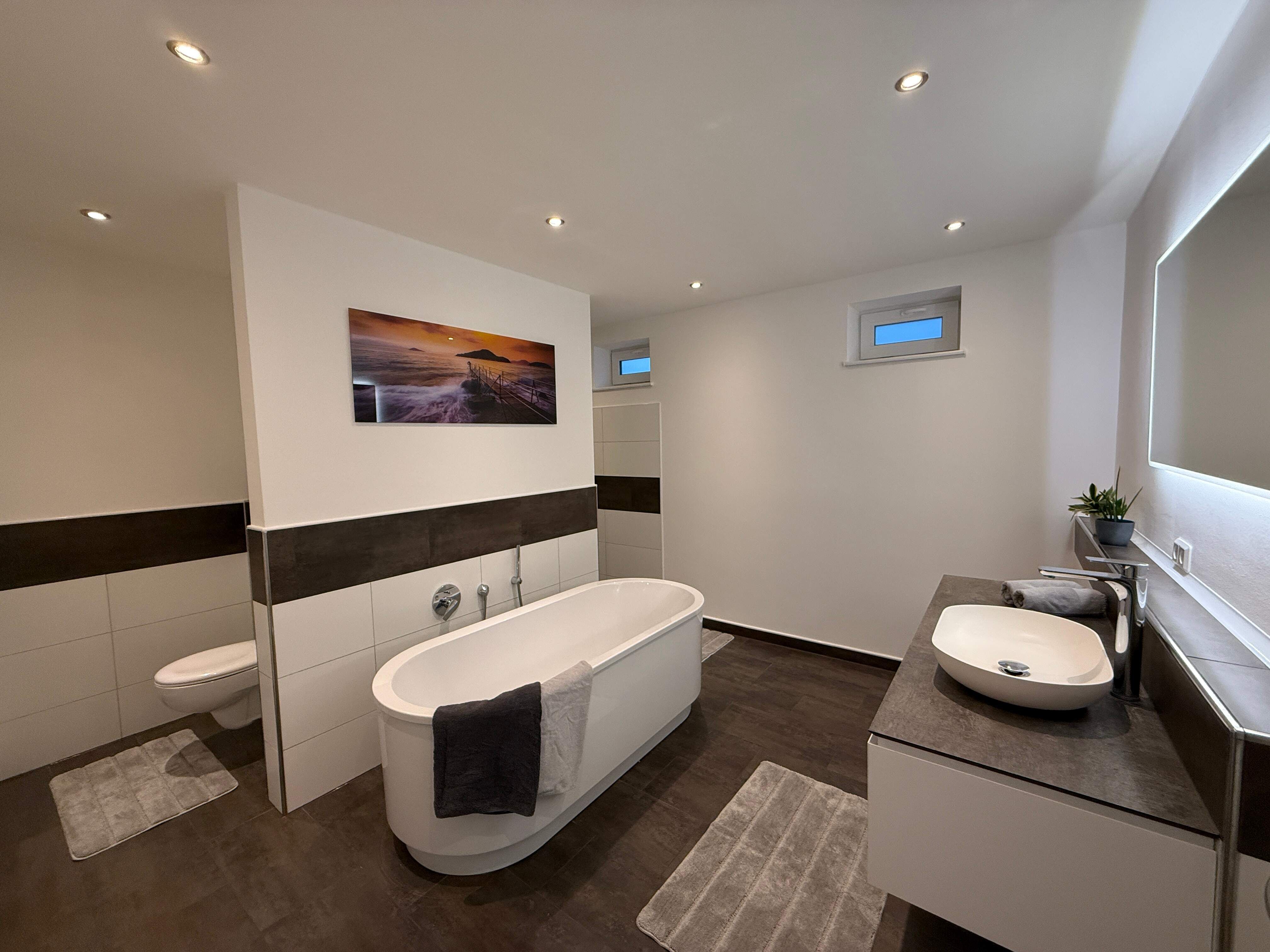 Das moderne Badezimmer besticht durch eine freistehende Badewanne und eine bodengleiche Dusche, die zum Wohlfühlen einladen.