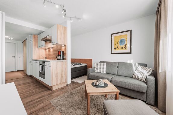 Unser Single-Apartment ist der perfekte Rückzugsort für Alleinreisende – kompakt, stylisch und super gemütlich: voll ausgestattete Küche mit Geschirrspüler, bequemes Boxspringbett, SAT-TV & Radio, Schlafcouch mit Lattenrost & Kaltschaummatratze, Balkon mit Wow-Ausblick, modernes Bad mit Dusche & WC. Du bist doch nicht gern allein? Kein Problem! Dank der hochwertigen Schlafcouch finden hier bis zu 3 Personen bequem Platz.