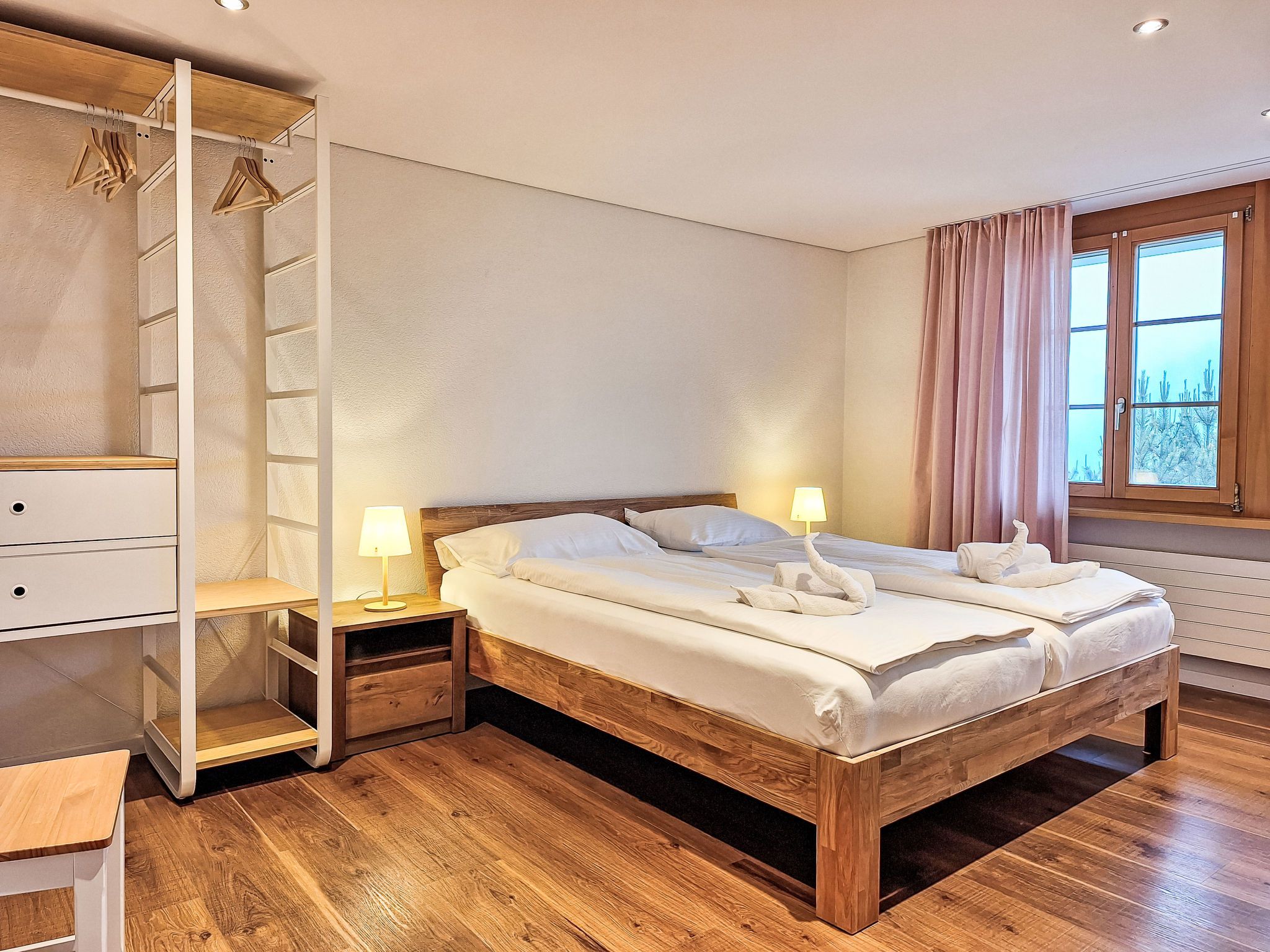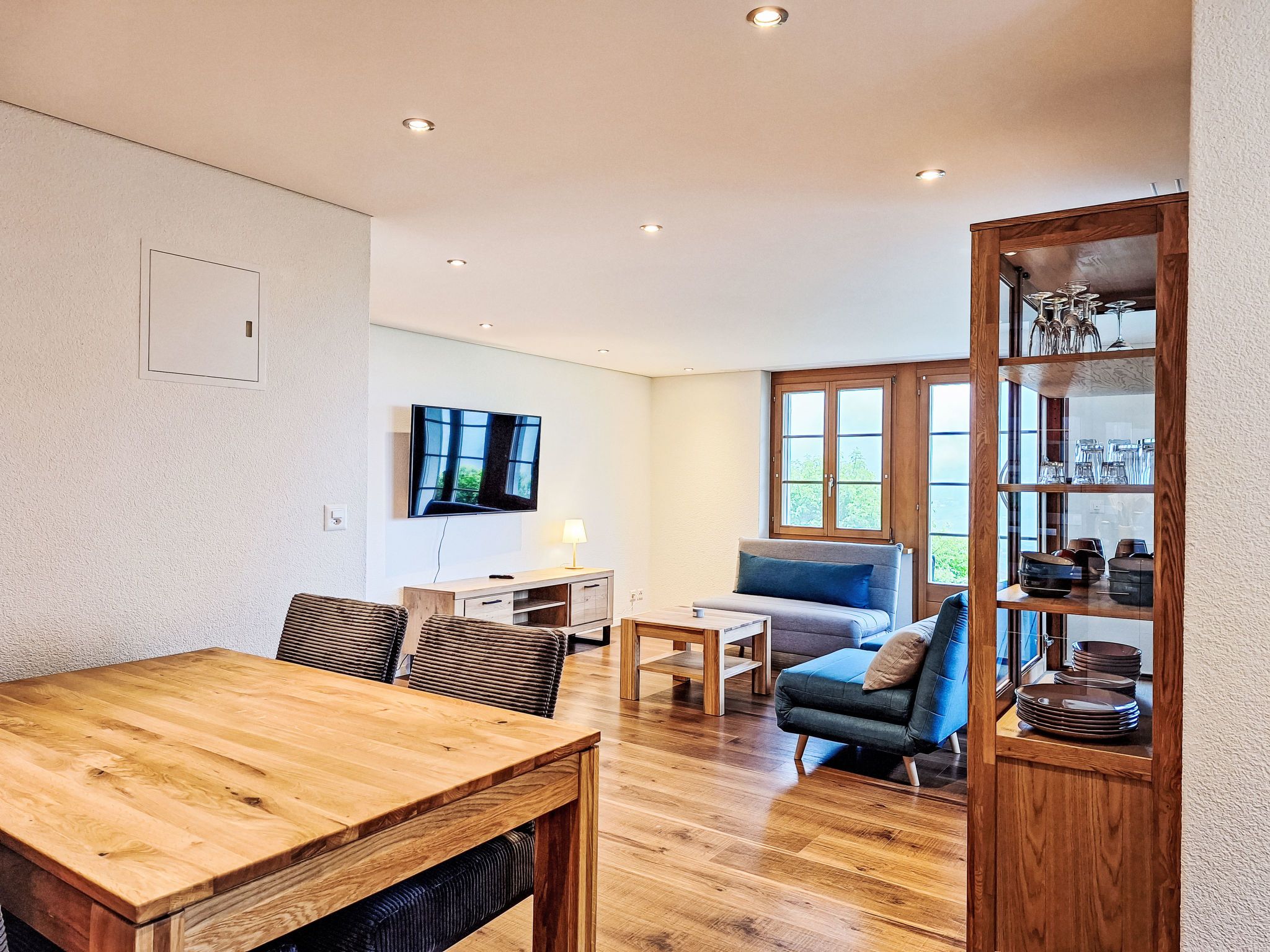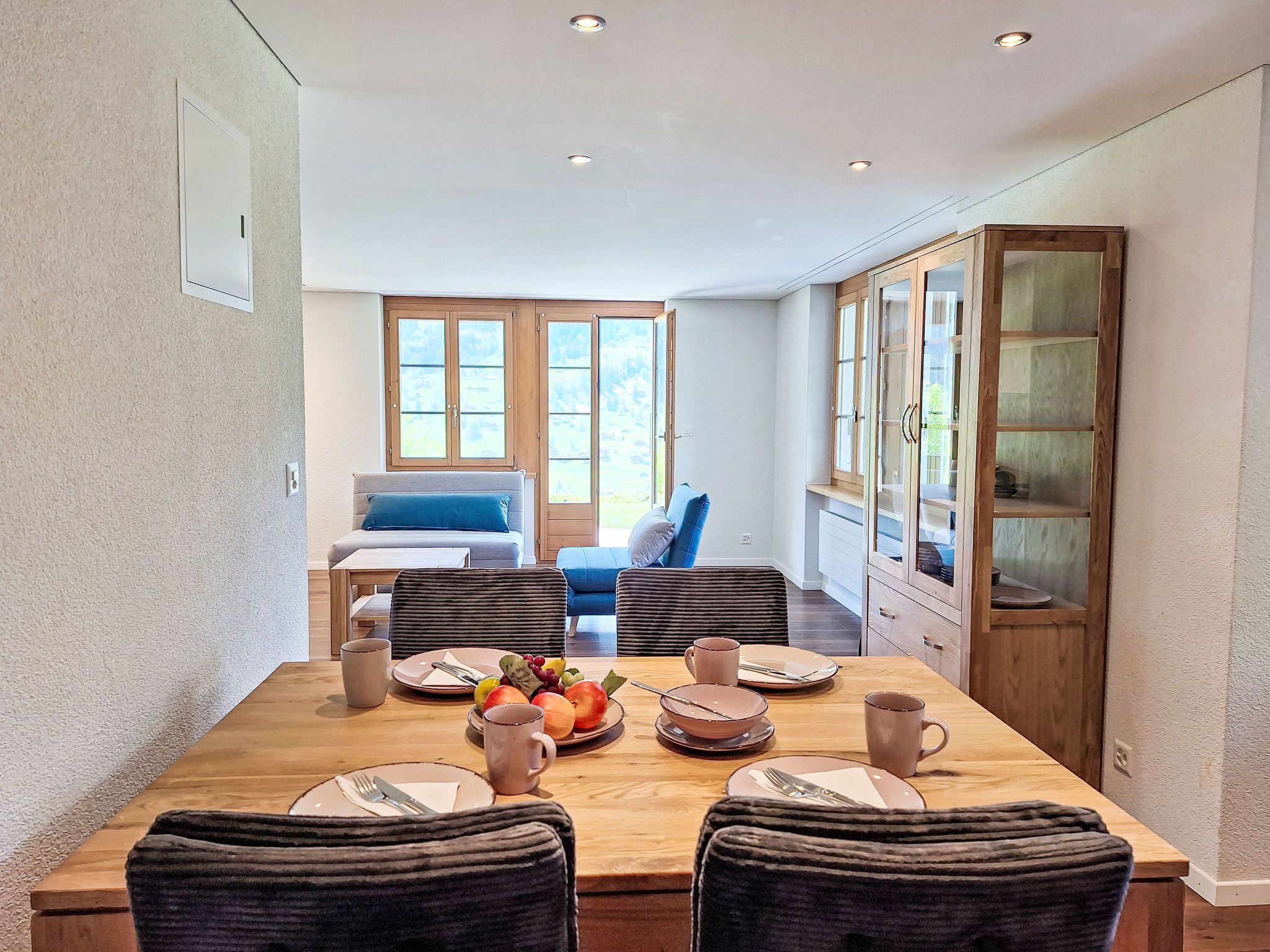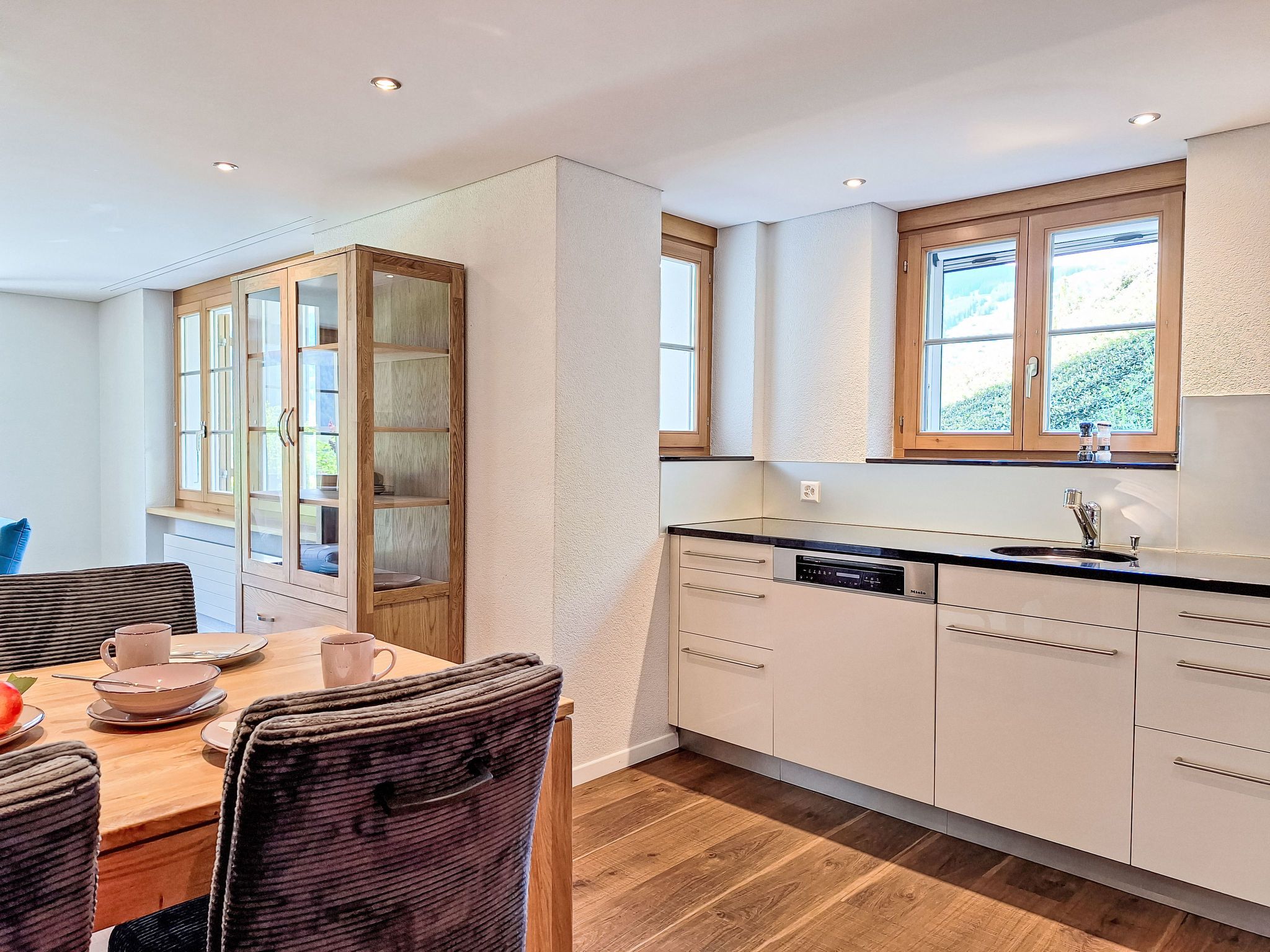 Chalet Adlerhorst EG, 3-Zimmer-Wohnung im Erdgeschoss, Südlage. Geräumig und hell, sehr komfortabel und geschmackvoll eingerichtet: offenes grosses Wohnzimmer mit Kabel-TV und Flachbildschirm. Ausgang zur Terrasse. 2 Zimmer, jedes Zimmer mit 1 Doppelbett (2 x 90 cm, Länge 200 cm). Grosse, offene Küche (Backofen, Geschirrspüler, 4 Glaskeramikplatten, Toaster, Wasserkocher, Mikrowelle, elektrische Kaffeemaschine, Kapseln für die Kaffeemaschine (Dolce Gusto) extra) mit Esstisch. Bad/WC. Fussbodenheizung. Grosse Terrasse, Südlage. Terrassenmöbel. Herrliche Panoramasicht auf die Berge, das Tal und die Landschaft. Zur Verfügung: Haartrockner. Internet (WLAN, gratis). Parkplatz. Bitte beachten: Nichtraucher-Unterkunft. Rauchmelder, Feuerlöscher.