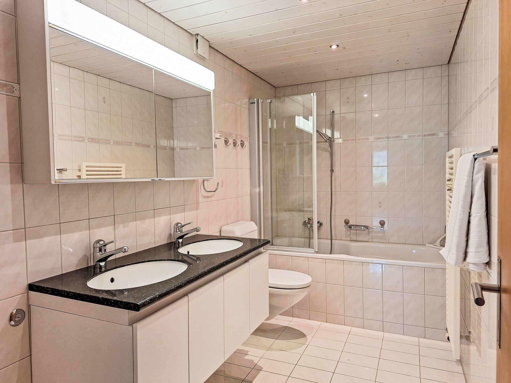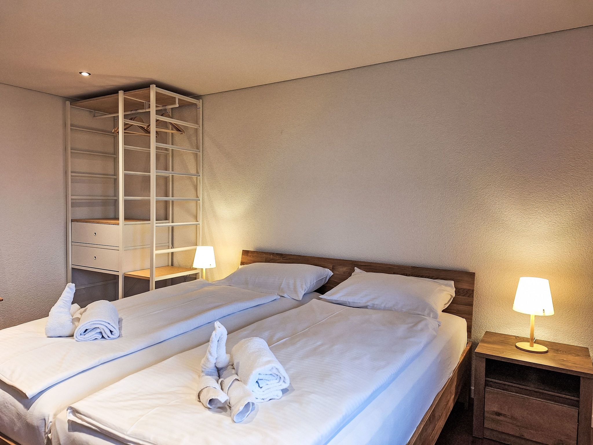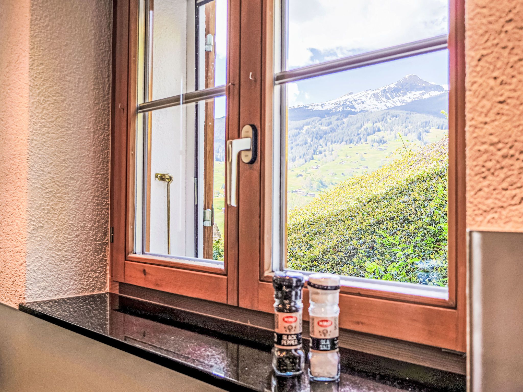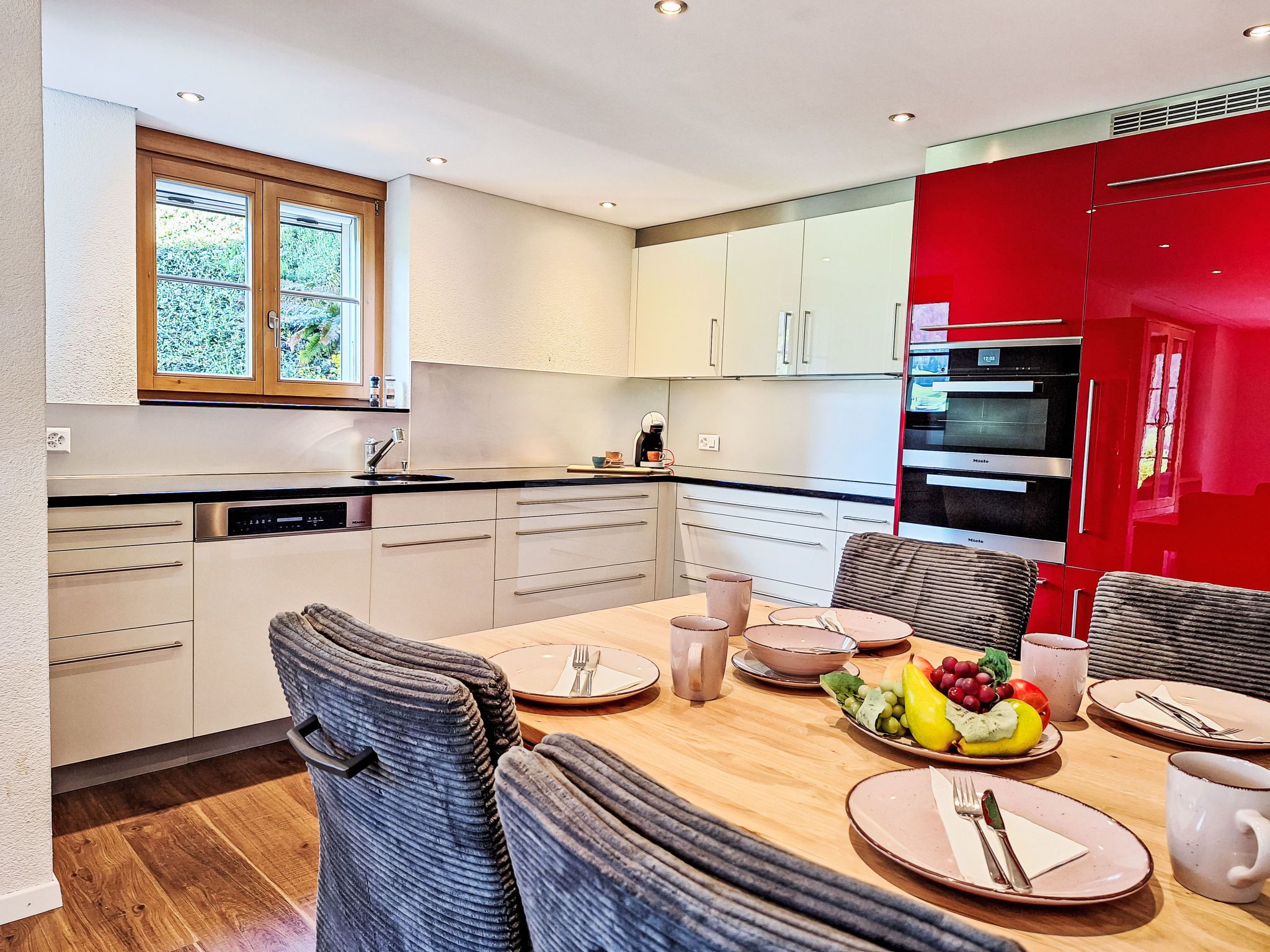 Chalet Adlerhorst EG, 3-Zimmer-Wohnung im Erdgeschoss, Südlage. Geräumig und hell, sehr komfortabel und geschmackvoll eingerichtet: offenes grosses Wohnzimmer mit Kabel-TV und Flachbildschirm. Ausgang zur Terrasse. 2 Zimmer, jedes Zimmer mit 1 Doppelbett (2 x 90 cm, Länge 200 cm). Grosse, offene Küche (Backofen, Geschirrspüler, 4 Glaskeramikplatten, Toaster, Wasserkocher, Mikrowelle, elektrische Kaffeemaschine, Kapseln für die Kaffeemaschine (Dolce Gusto) extra) mit Esstisch. Bad/WC. Fussbodenheizung. Grosse Terrasse, Südlage. Terrassenmöbel. Herrliche Panoramasicht auf die Berge, das Tal und die Landschaft. Zur Verfügung: Haartrockner. Internet (WLAN, gratis). Parkplatz. Bitte beachten: Nichtraucher-Unterkunft. Rauchmelder, Feuerlöscher.