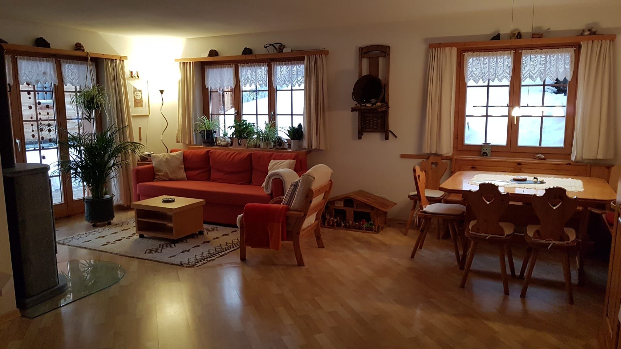 2 Schlafräume, Babybett, Babybett im Zimmer, Backofen, DVD-Player, Fondue-Set, Garten, Geschirrspüler, Grillmöglichkeit, Haustiere nicht erlaubt, Internetverbindung, Kachelofen, Kaffeemaschine, Küche, Küchenwäsche, Kühlschrank, Mikrowelle, Nichtraucherzimmer-/wohnung, Parking, Raclette-Set, Radio, Terrasse, Tisch- und Küchenwäsche, Töpfe Pfannen Geschirr, TV, Wäschetrockner, Waschmaschine, Wasserkocher, WiFi, Zustellbett