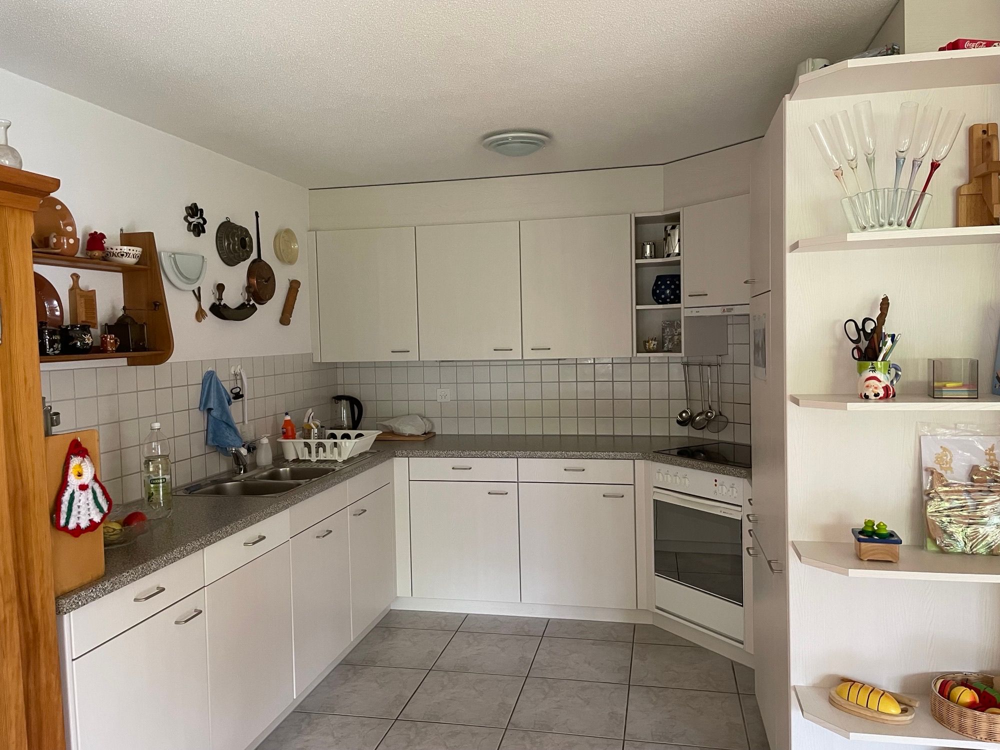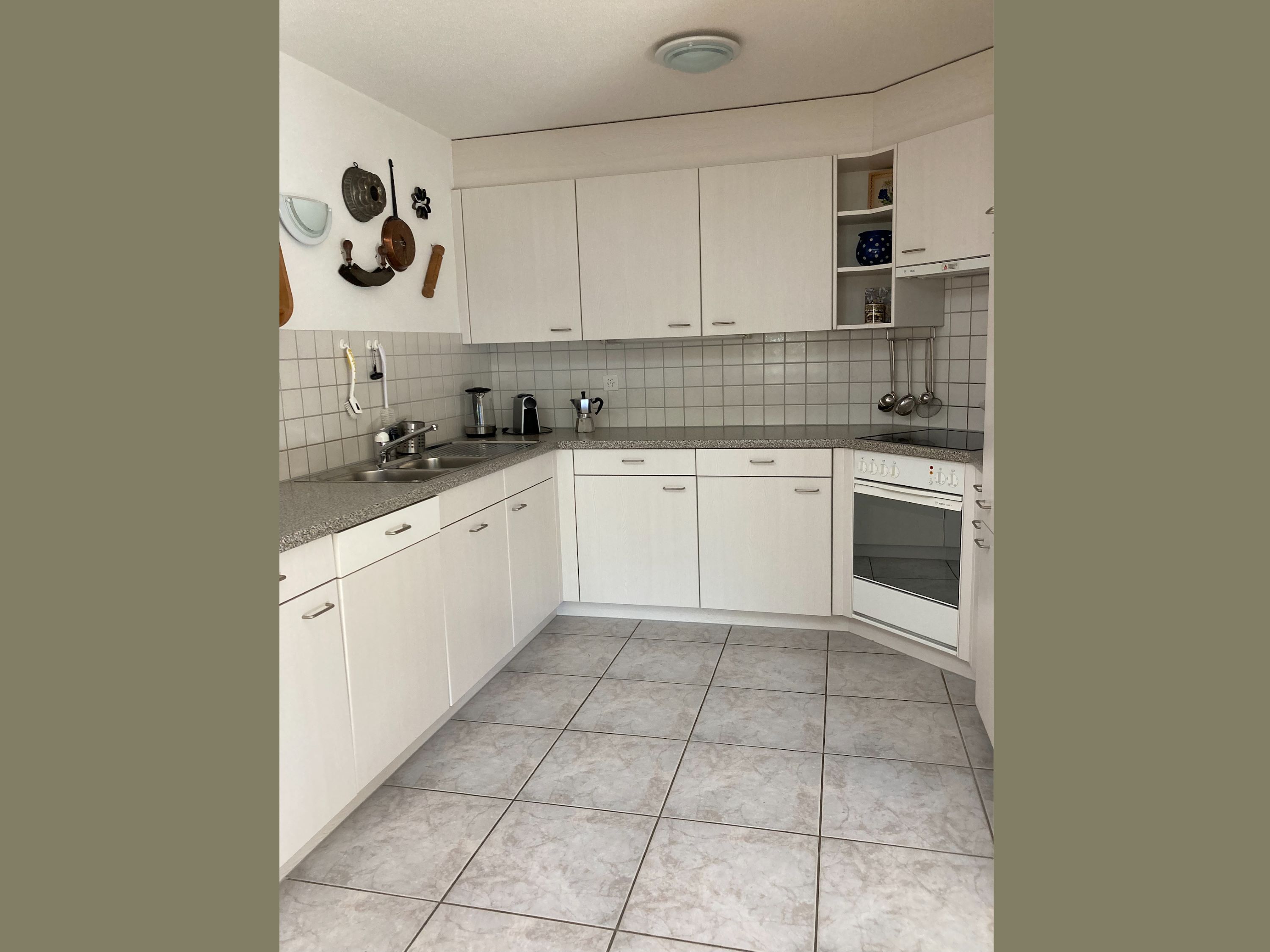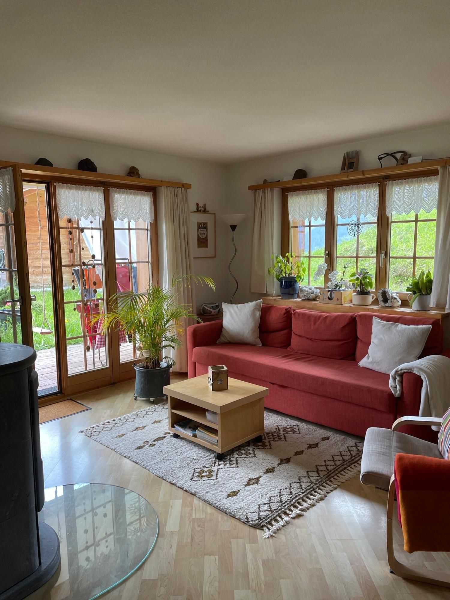 Geräumige helle 3 1/2-Zimmerwohnung im Erdgeschoss, komfortabel und gemütlich eingerichtet: Wohn-/Esszimmer mit grossem Esstisch und Ausziehsofa, vollausgestattete offene Küche mit Geschirrspüler, Kaffeemaschine, Fondue- und Racletteset.
