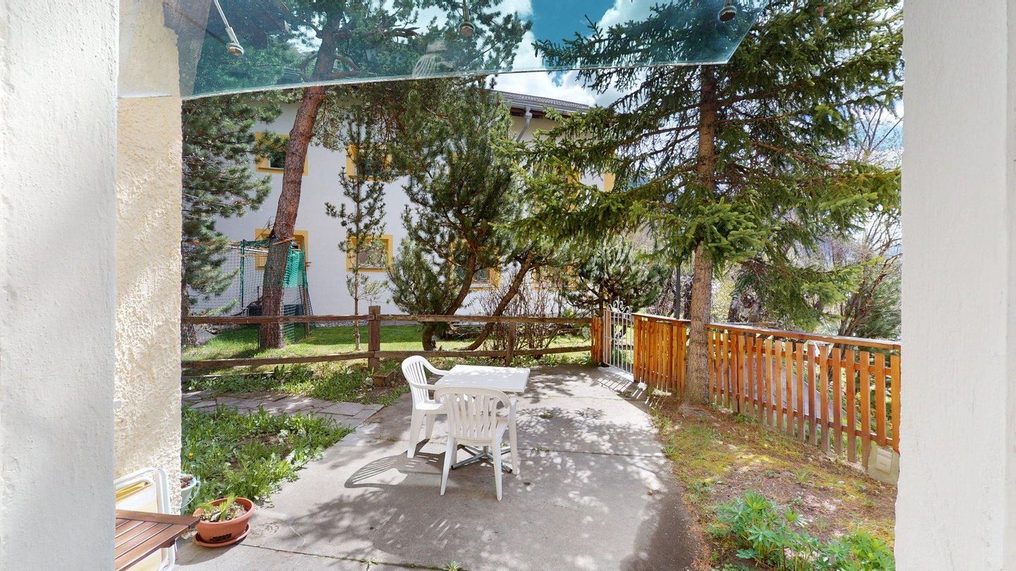 Ein kleiner, abgeschlossener Terrassenplatz lädt dazu ein, an der frischen Bergluft zu entspannen – sei es bei einem Frühstück in der Morgensonne oder einem Glas Wein am Abend. Ein privater Garagenplatz steht den Gästen zur Verfügung. (Achtung Größe: 2.35 x 2.00).
