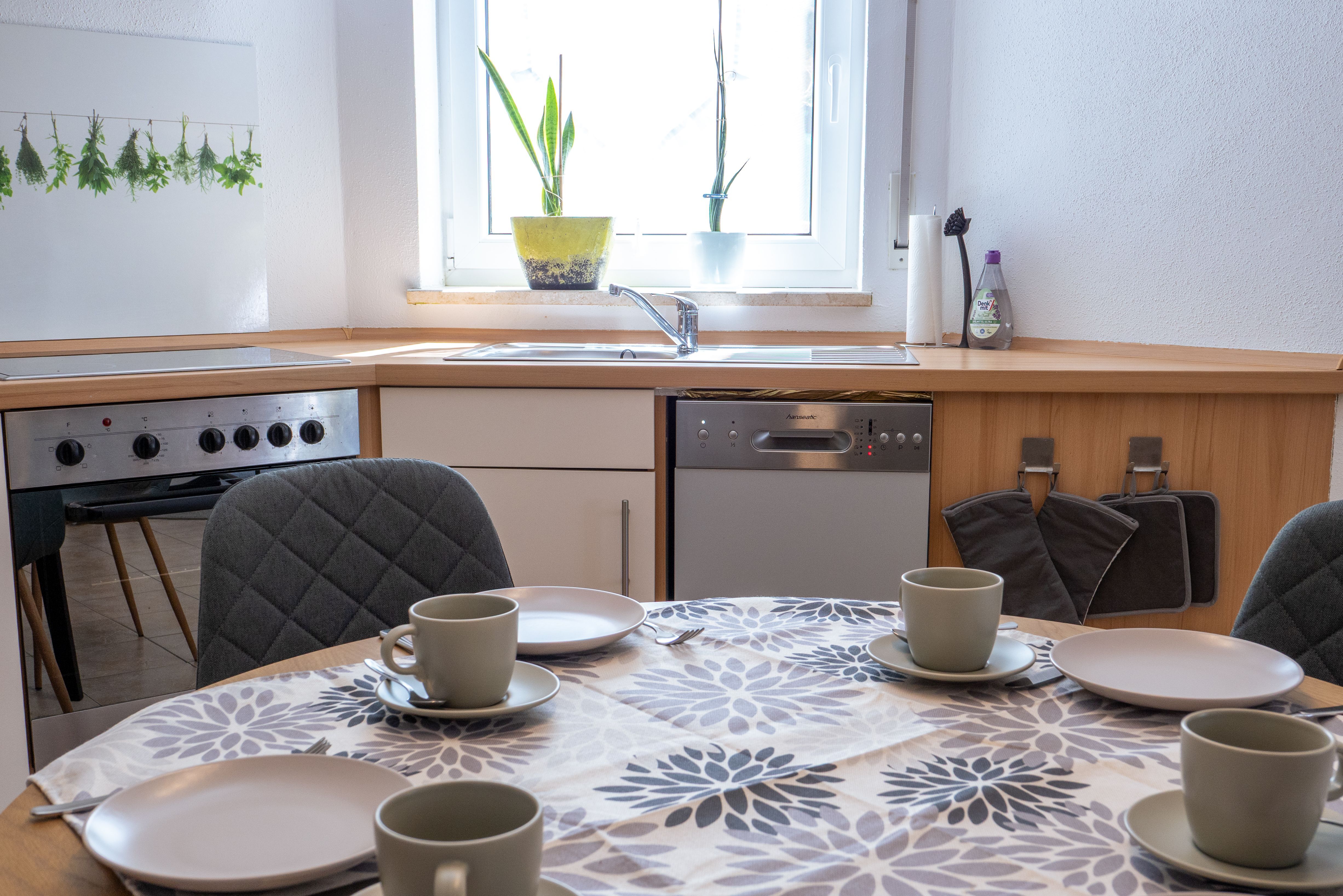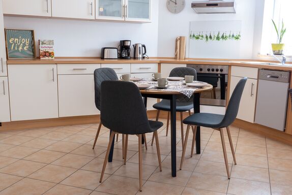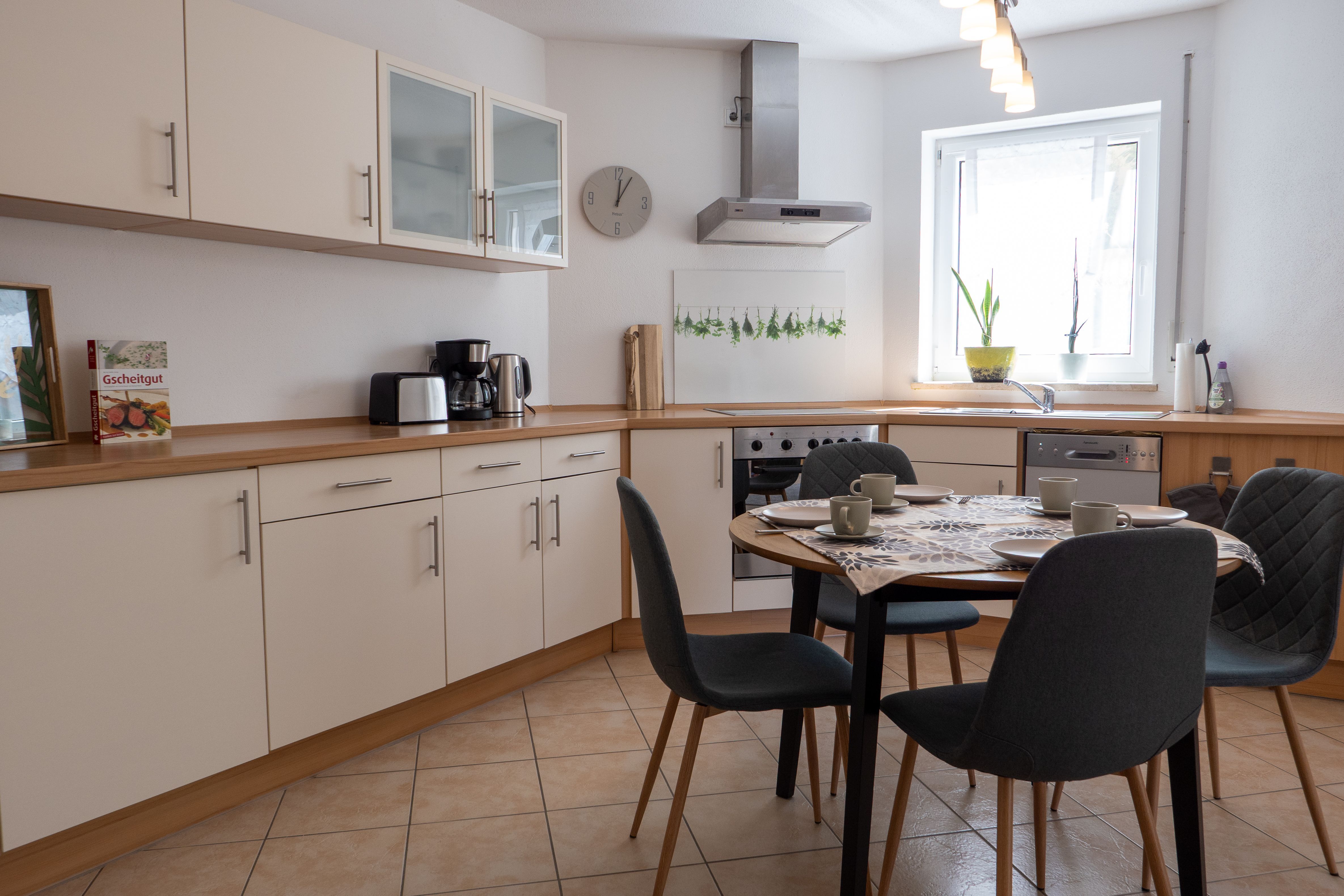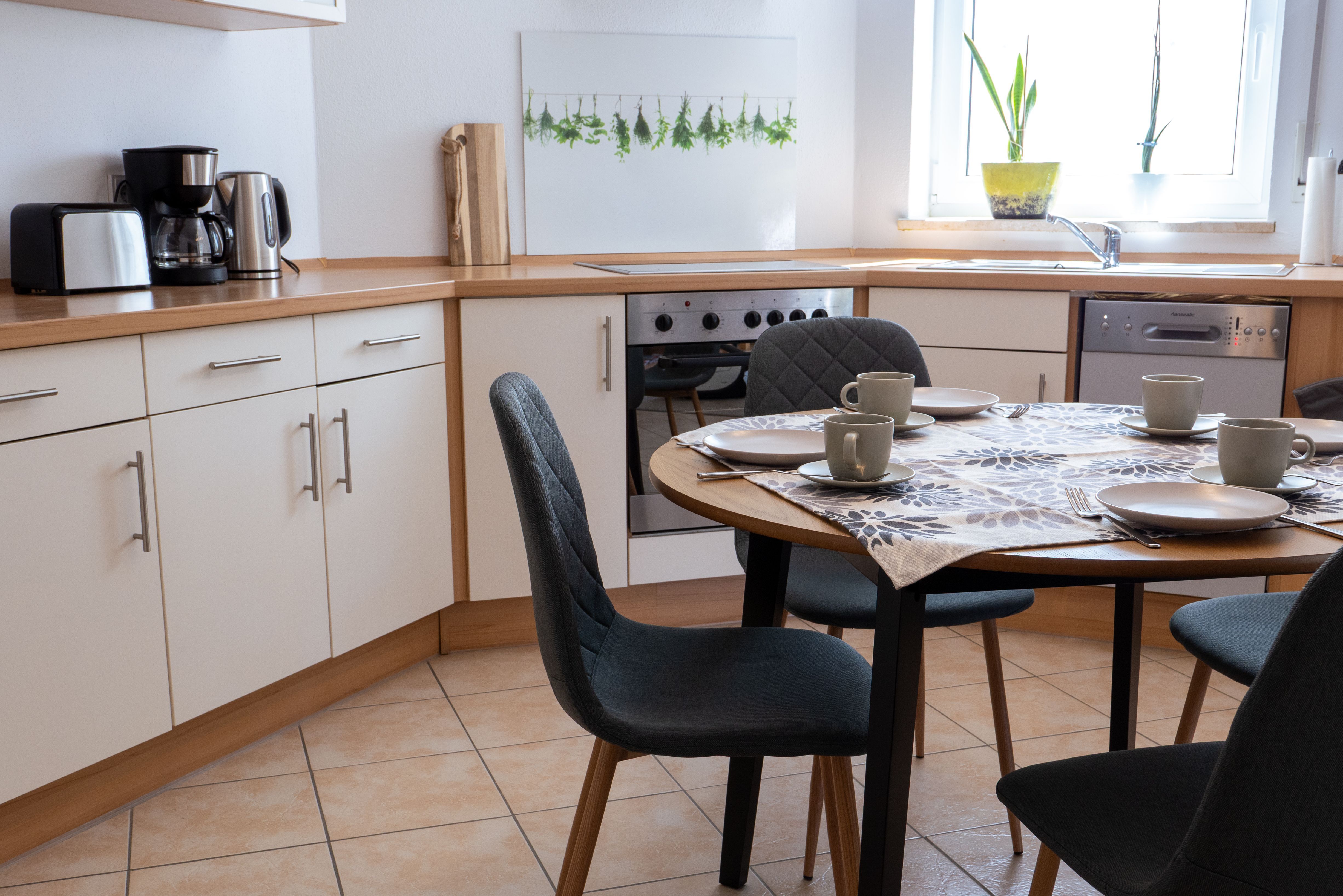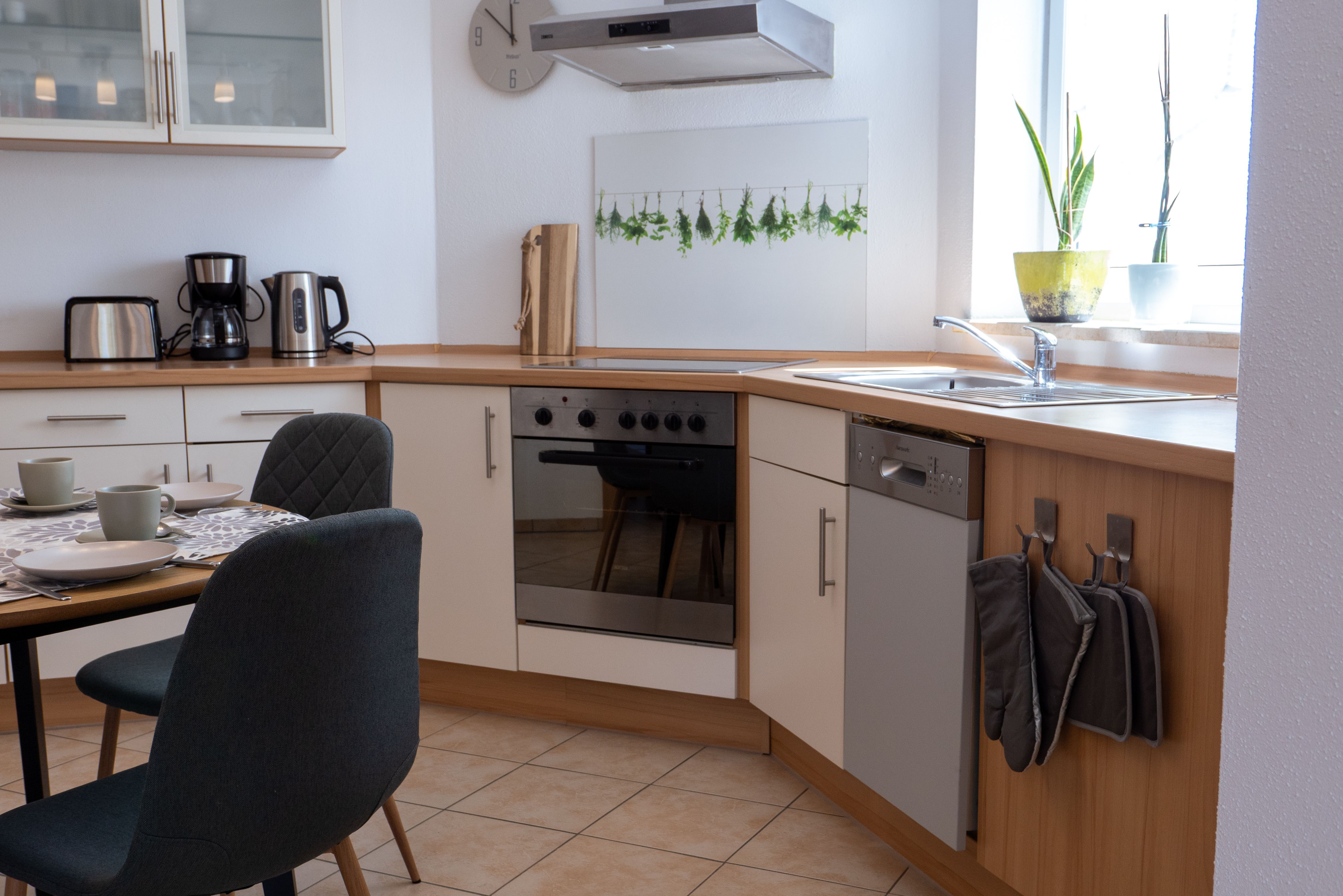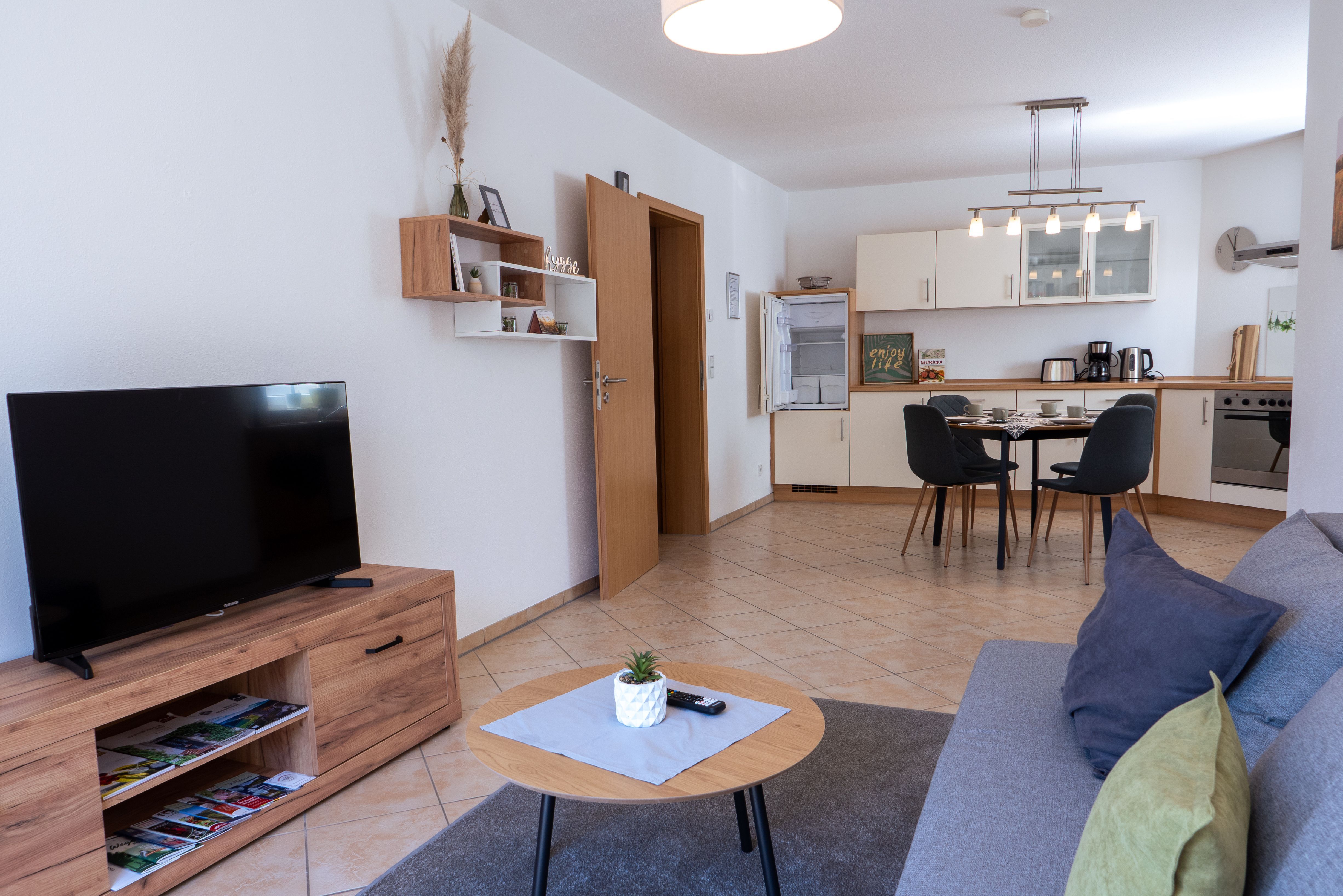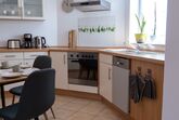 Die Ferienwohnung ist 56qm groß und verfügt über einen Wohn/Essbereich mit optionaler Schlafcouch und einer vollausgestatteten Küche mit Spülmaschine.