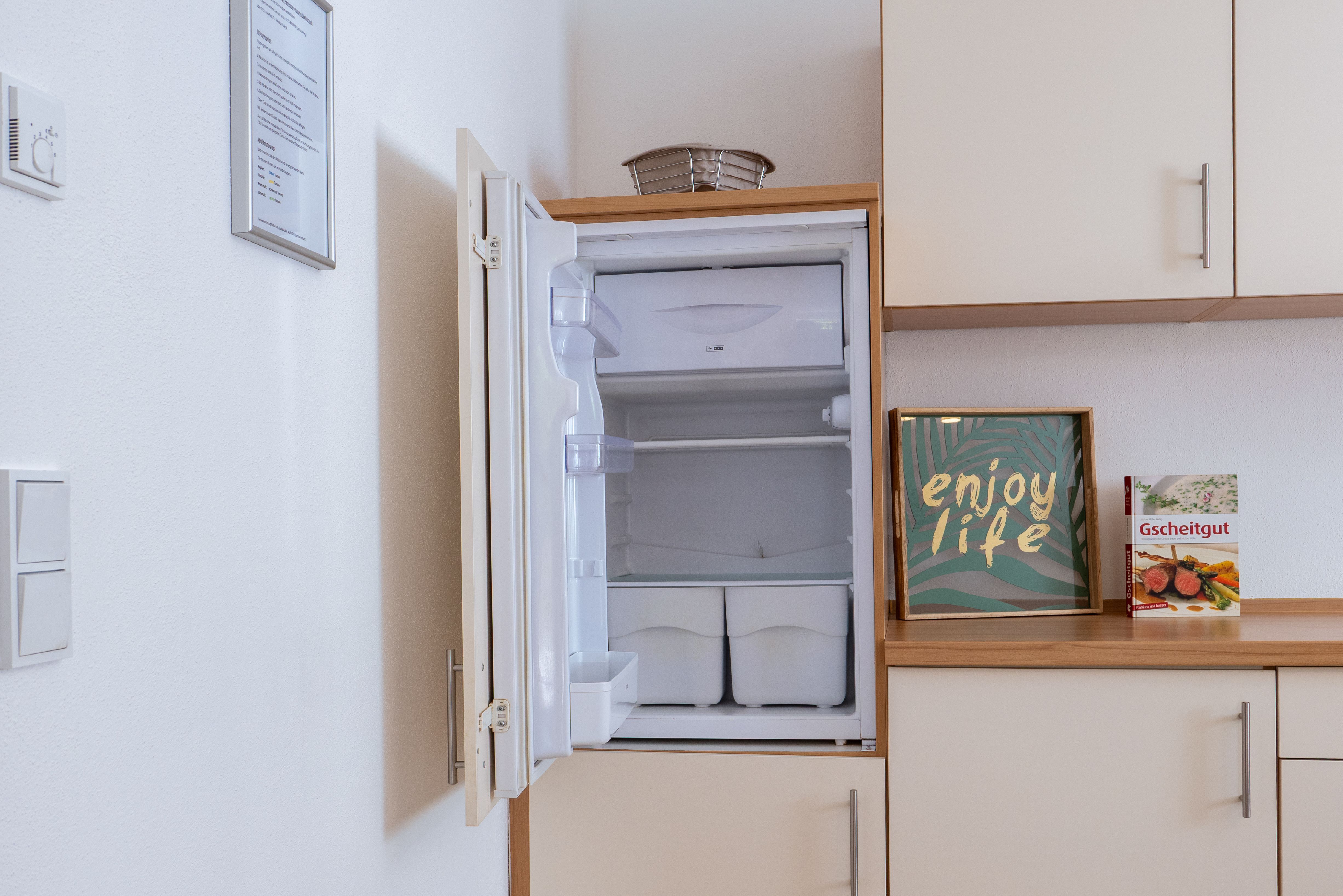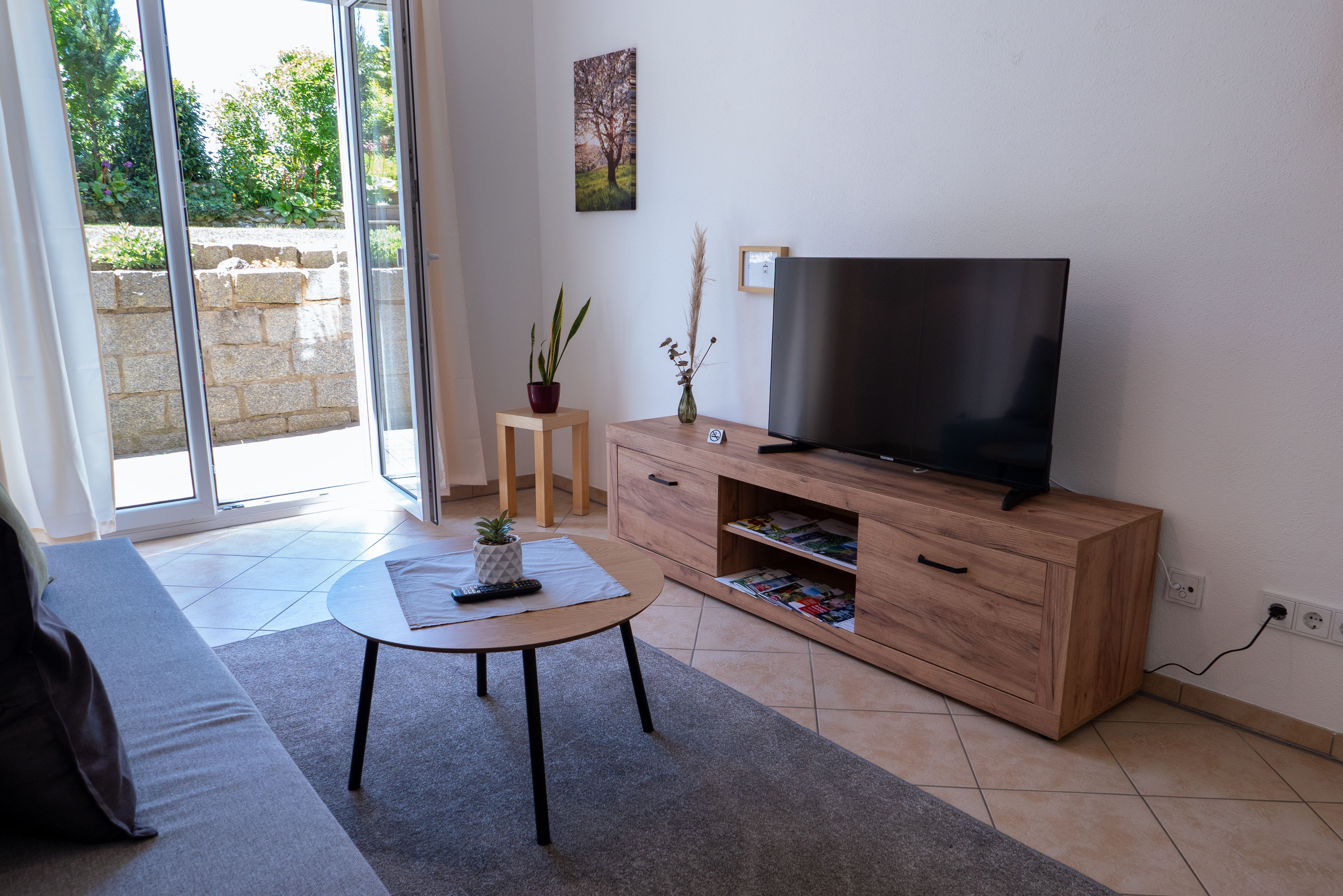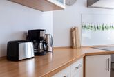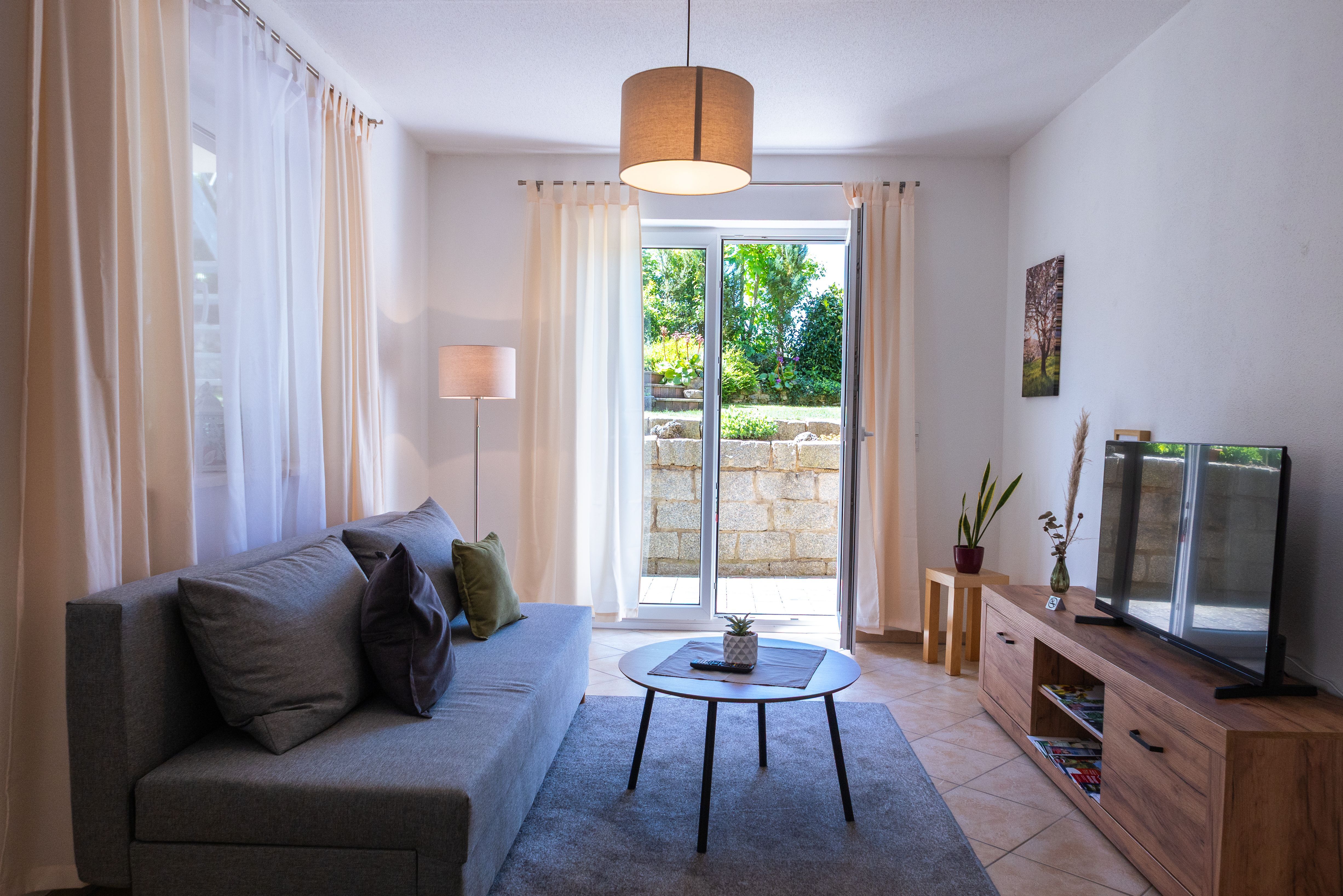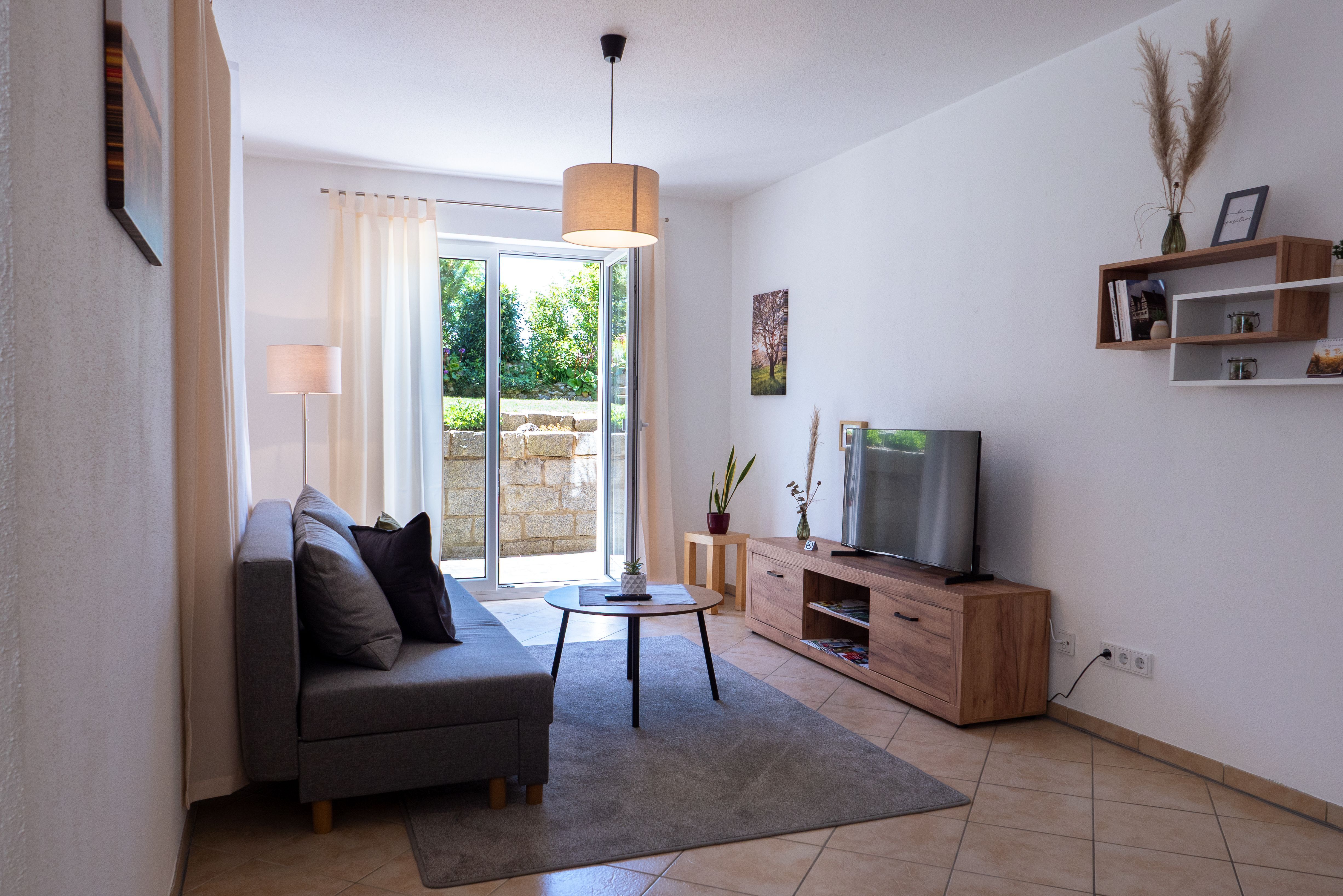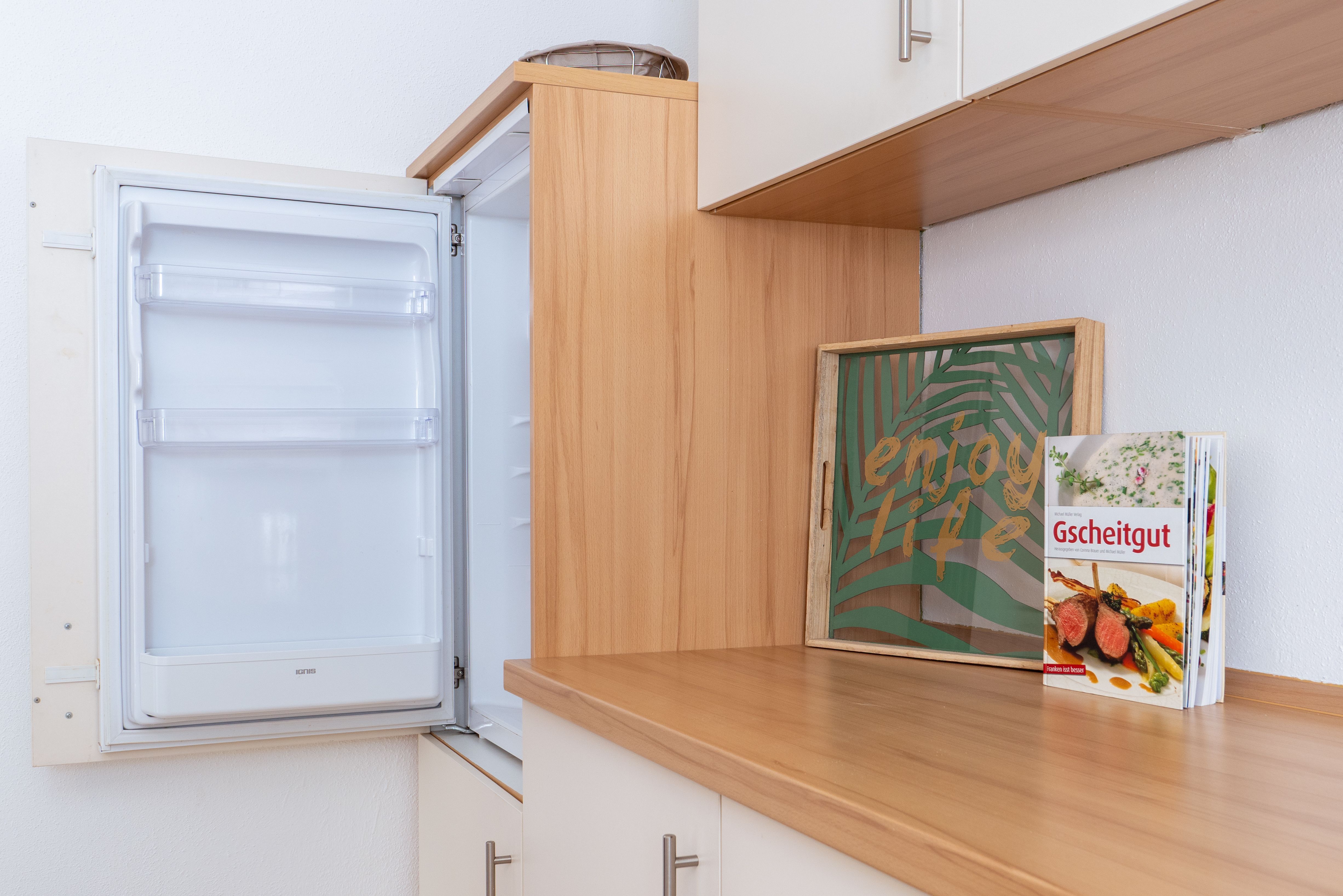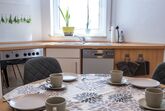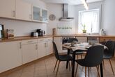 Die Ferienwohnung ist 56qm groß und verfügt über einen Wohn/Essbereich mit optionaler Schlafcouch und einer vollausgestatteten Küche mit Spülmaschine.