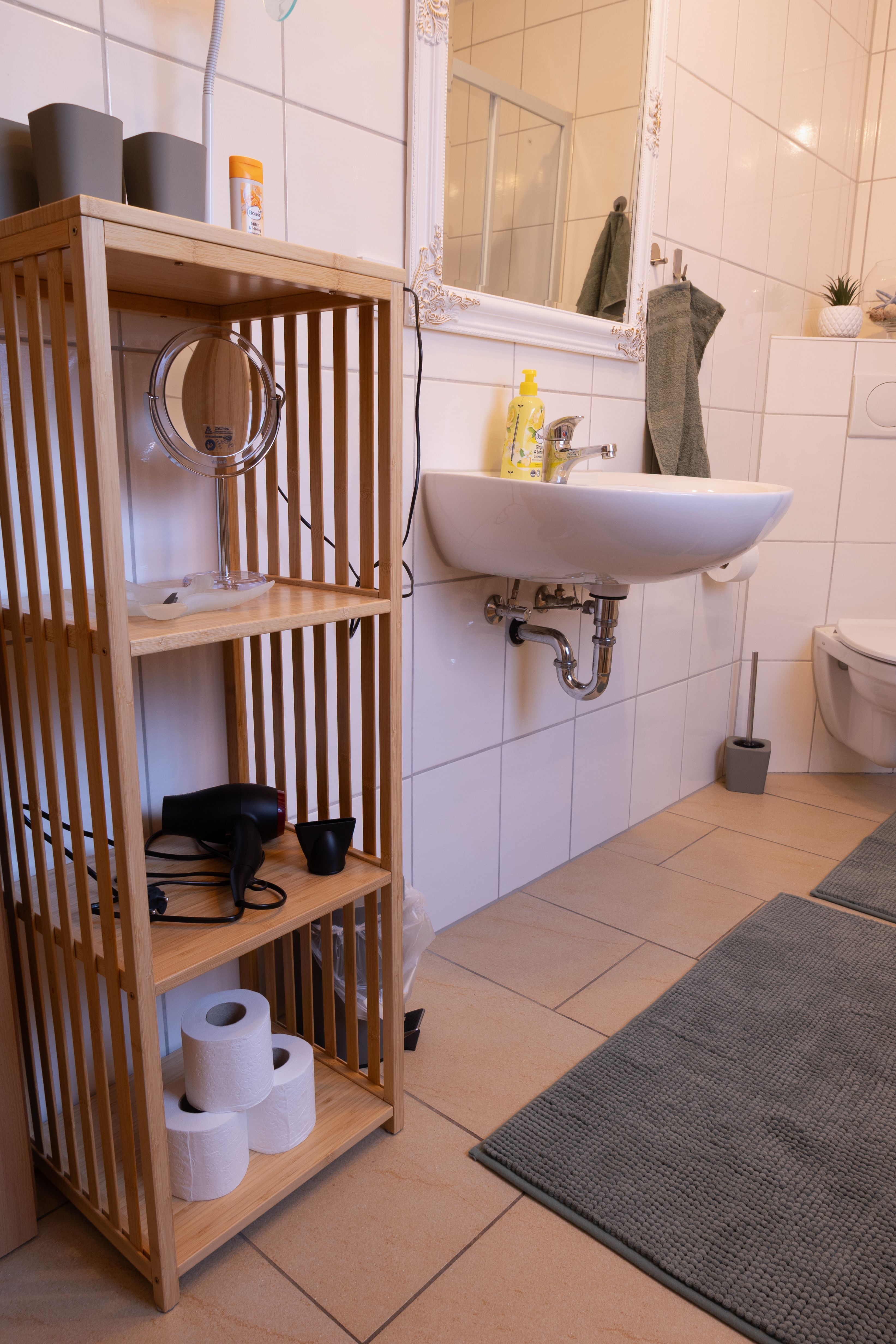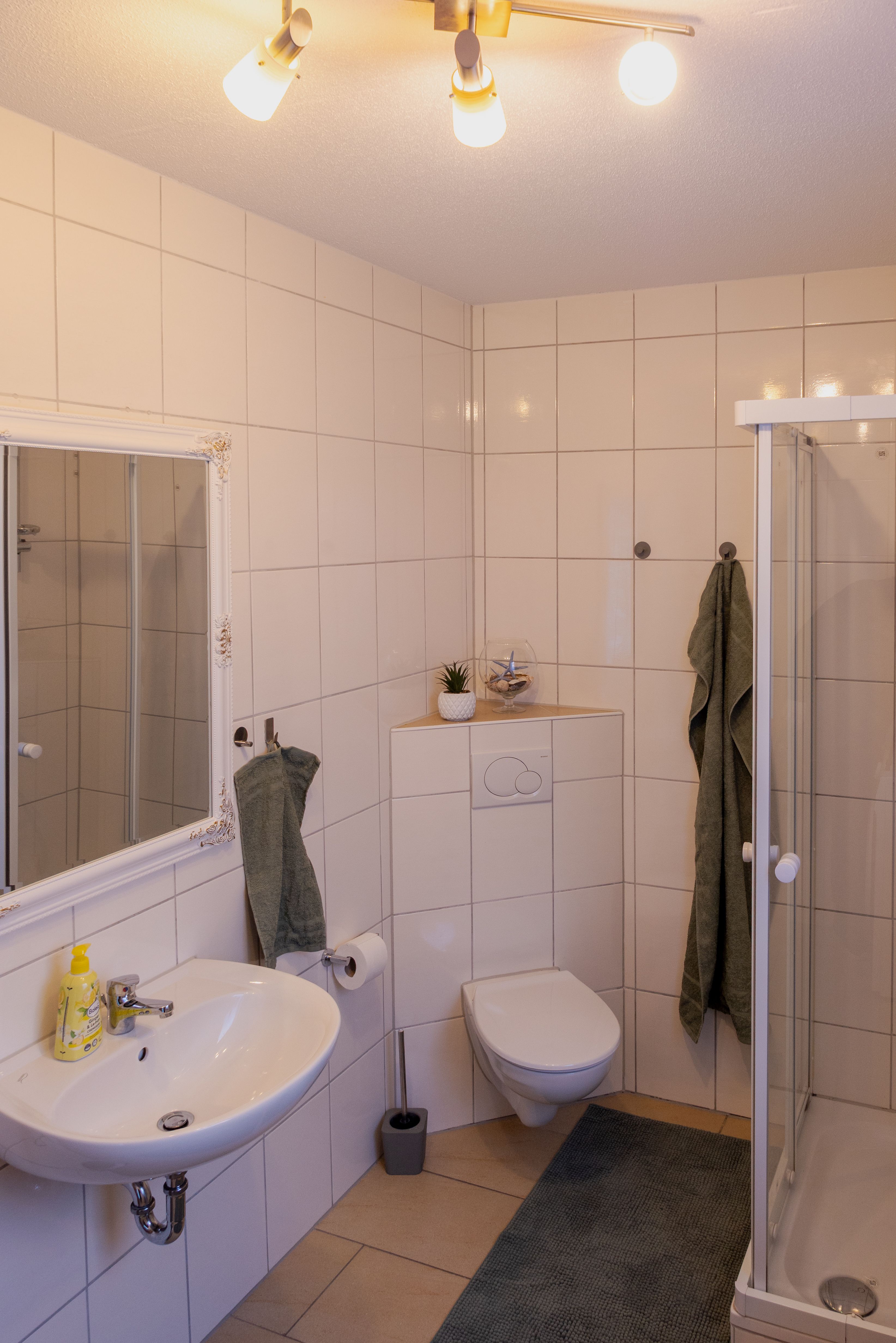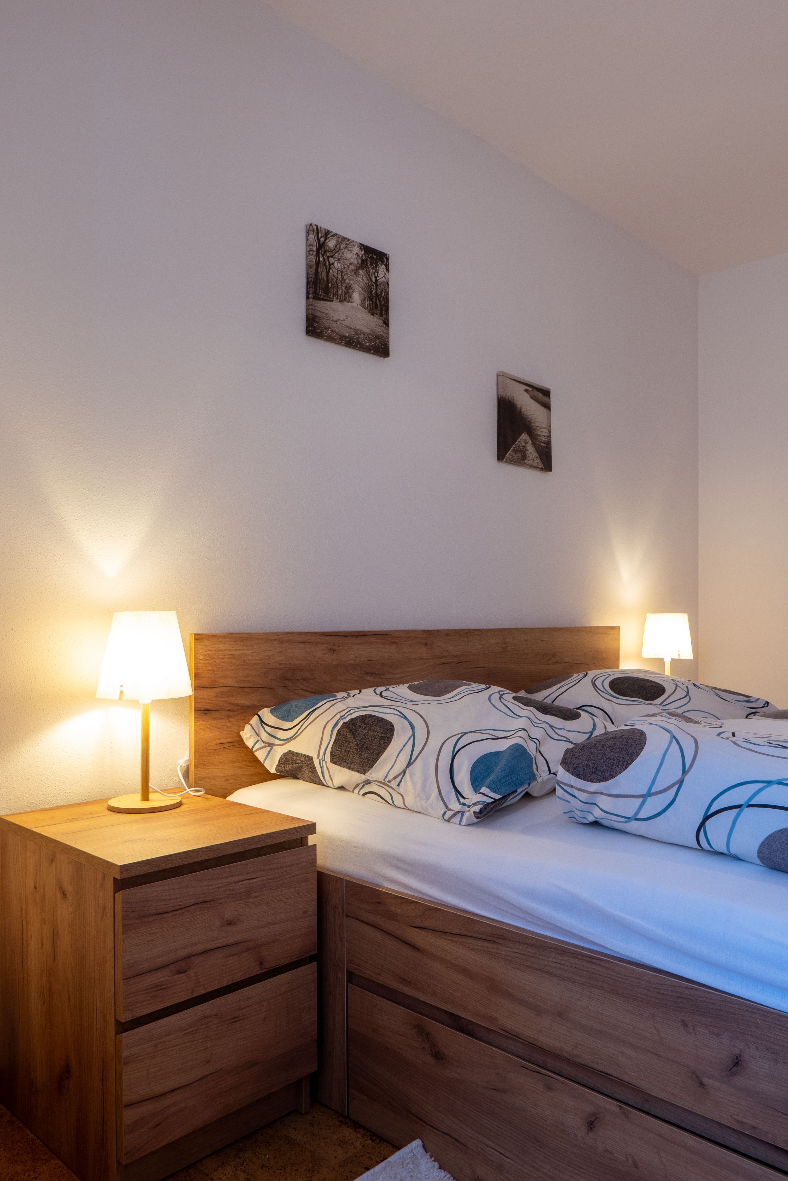 Das Schlafzimmer ist mit Doppelbett, Kommoden und Kleiderschrank ausgestattet. Das Bad mit Dusche und WC verfügt zusätzlich über eine kostenlos nutzbare Waschmaschine. Bettwäsche und Handtücher werden kostenlos gestellt. Auf Anfrage stellen wir Ihnen sehr gerne ein Babybett und einen Hochstuhl kostenfrei zur Verfügung.