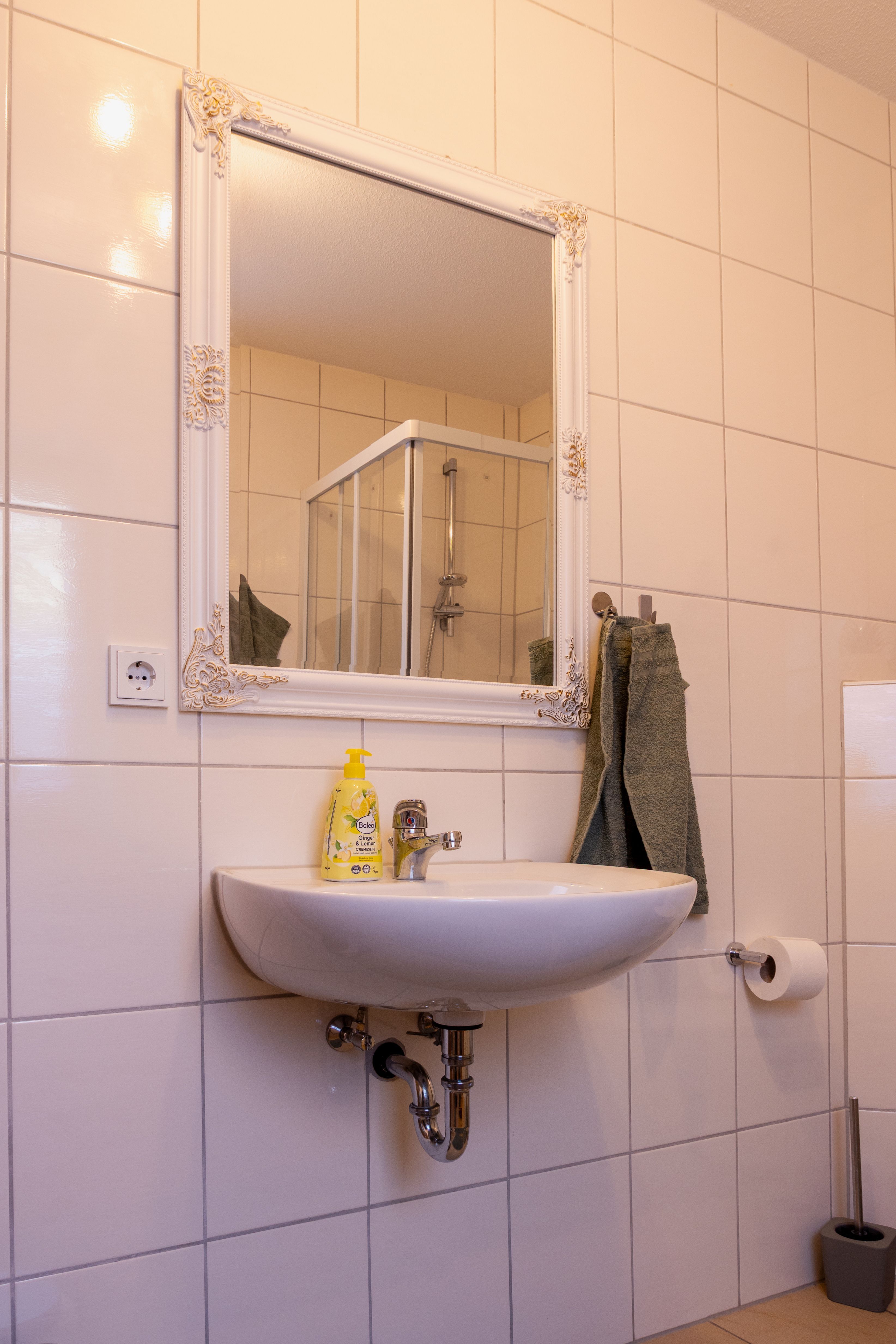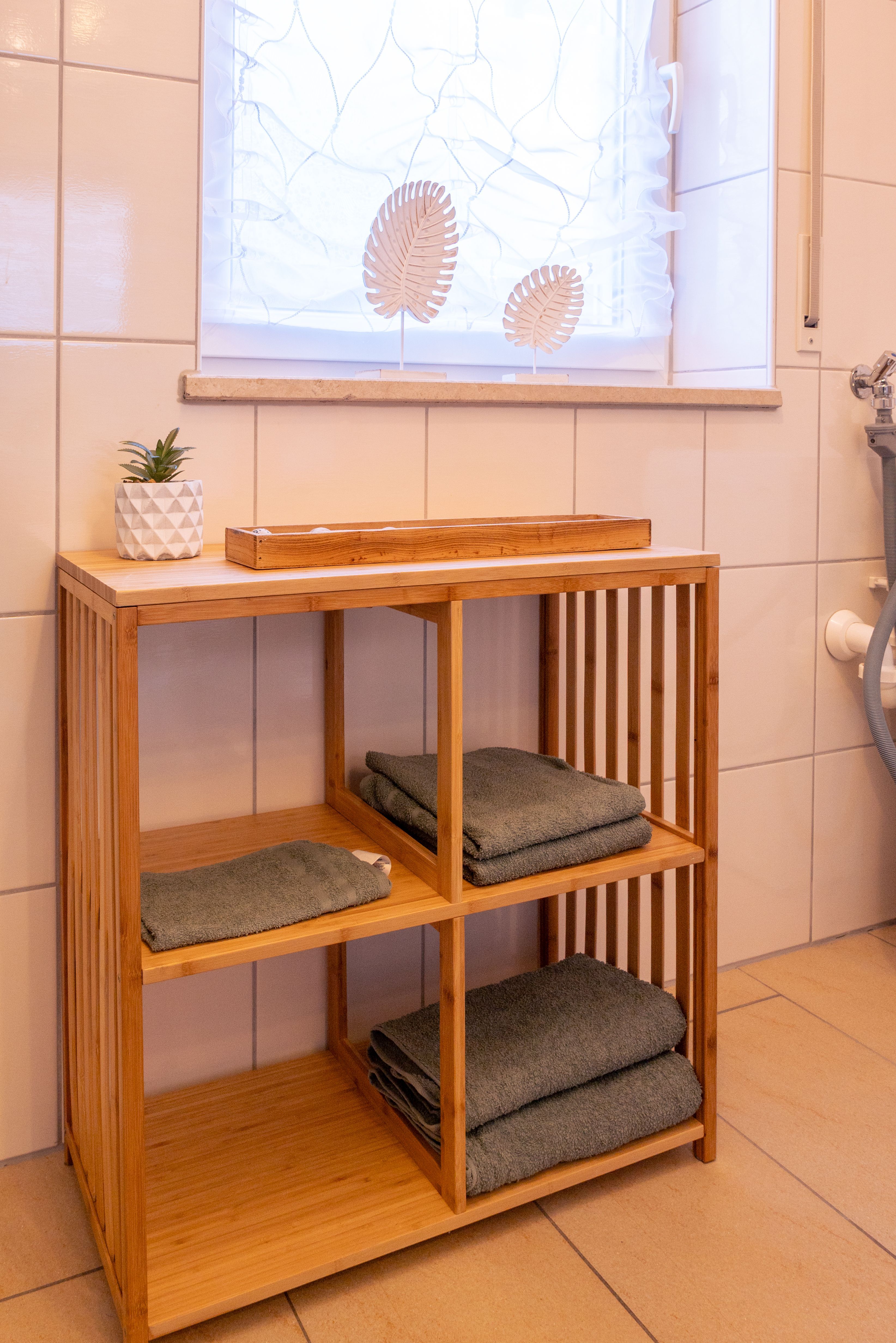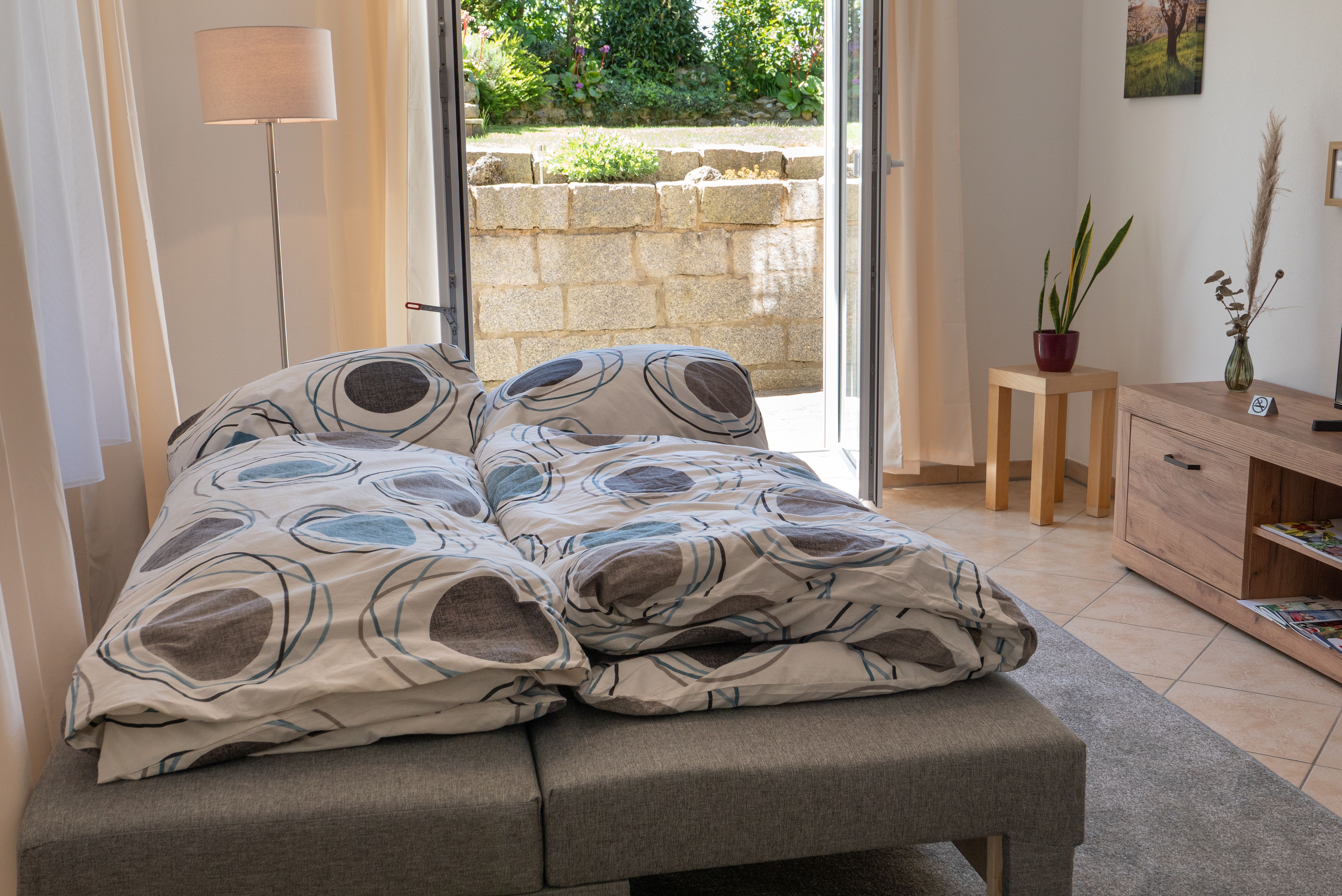 Das Schlafzimmer ist mit Doppelbett, Kommoden und Kleiderschrank ausgestattet. Das Bad mit Dusche und WC verfügt zusätzlich über eine kostenlos nutzbare Waschmaschine. Bettwäsche und Handtücher werden kostenlos gestellt. Auf Anfrage stellen wir Ihnen sehr gerne ein Babybett und einen Hochstuhl kostenfrei zur Verfügung.