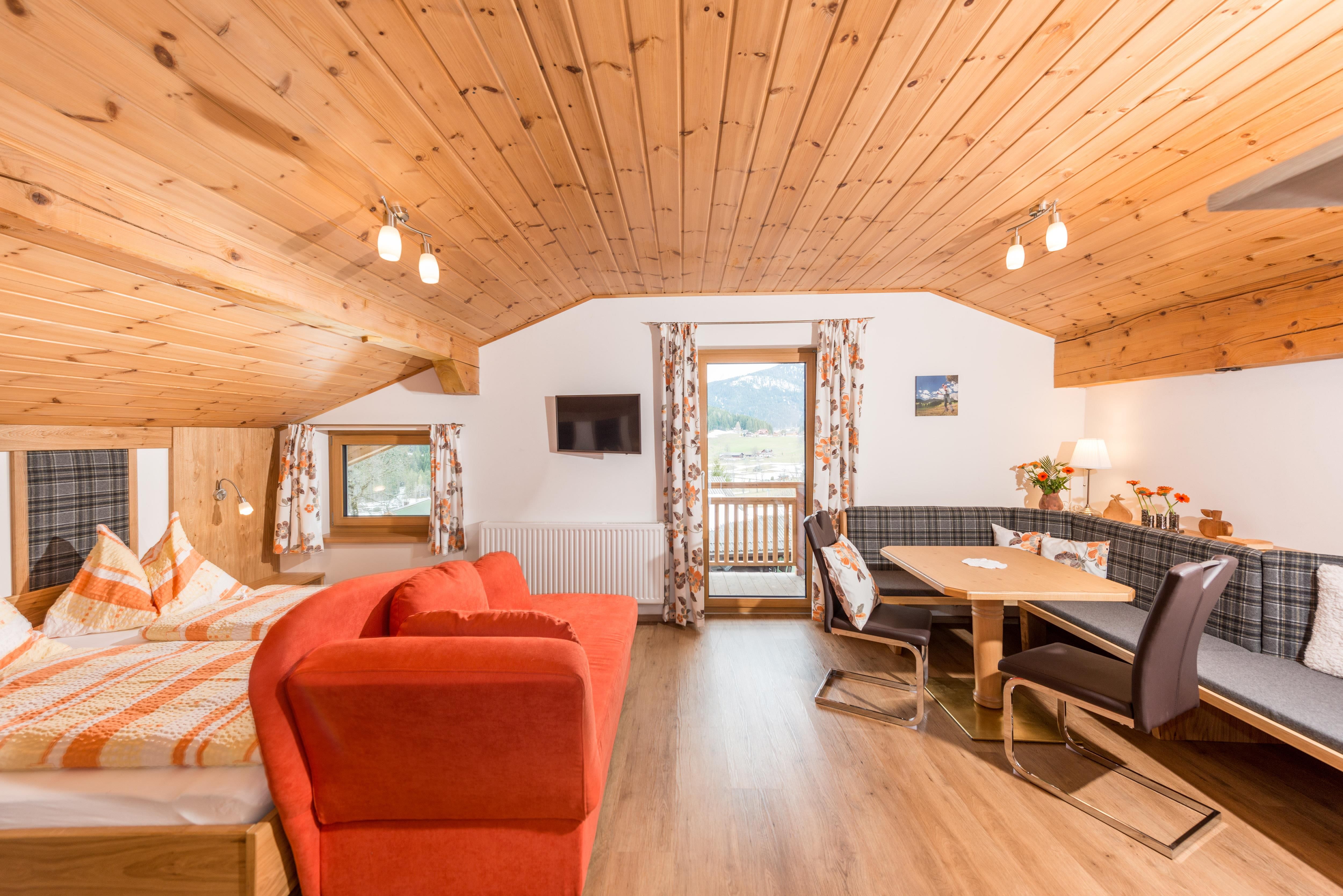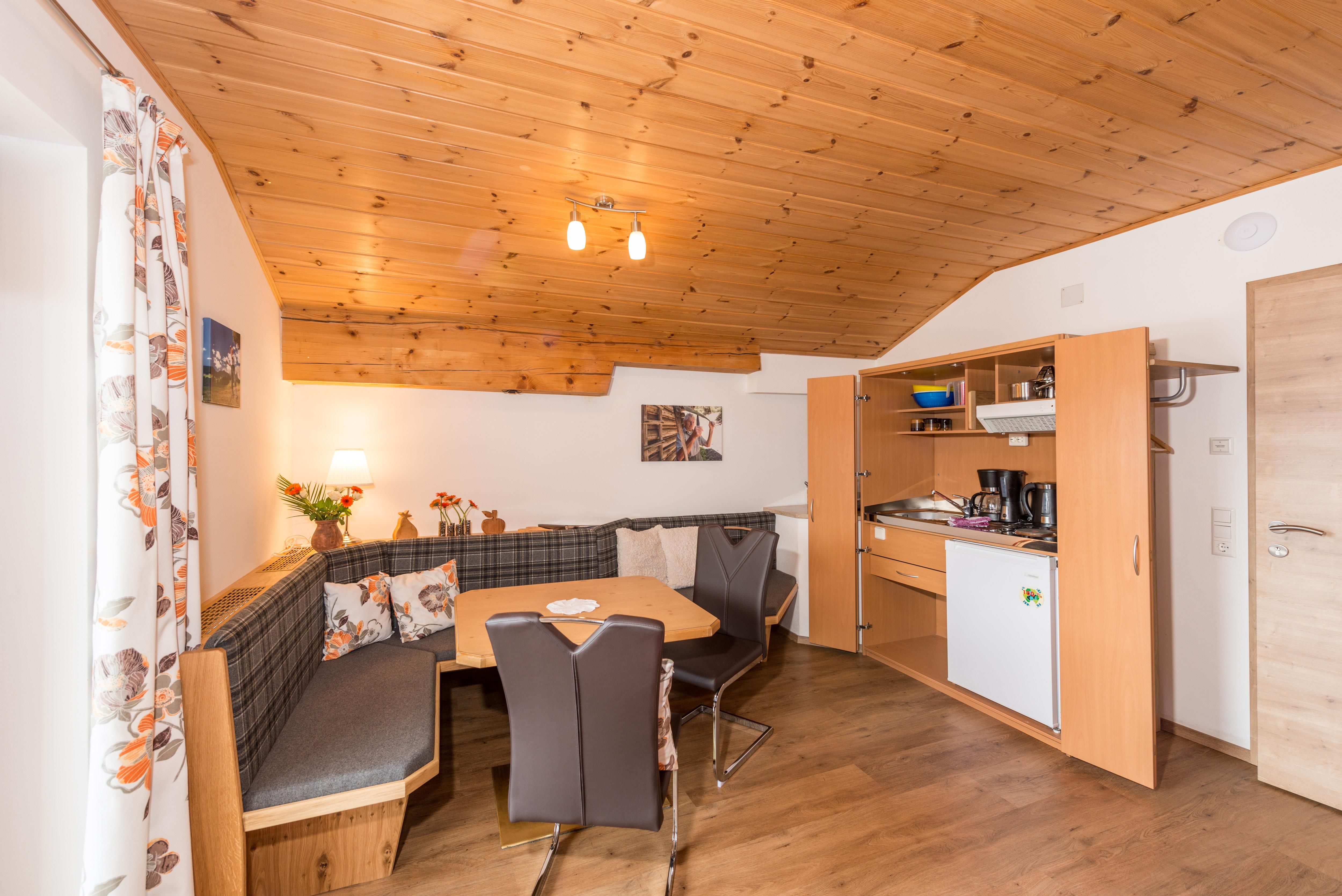Ein kuscheliges Appartement mit gemütlicher Sitzecke und eigenem Balkon. Mit der Nachmittagssonne um die Wette blinzeln, währenddessen der Blick auf den Dachstein auf das nächste Abenteuer Laune macht. Ein Urlaub mit Der oder Dem Liebsten wird im Appartement im neuen Landhäusl ein richtiger Glückstreffer! Um es sich so richtig gut gehen zu lassen ist das Appartement ausgestattet mit: