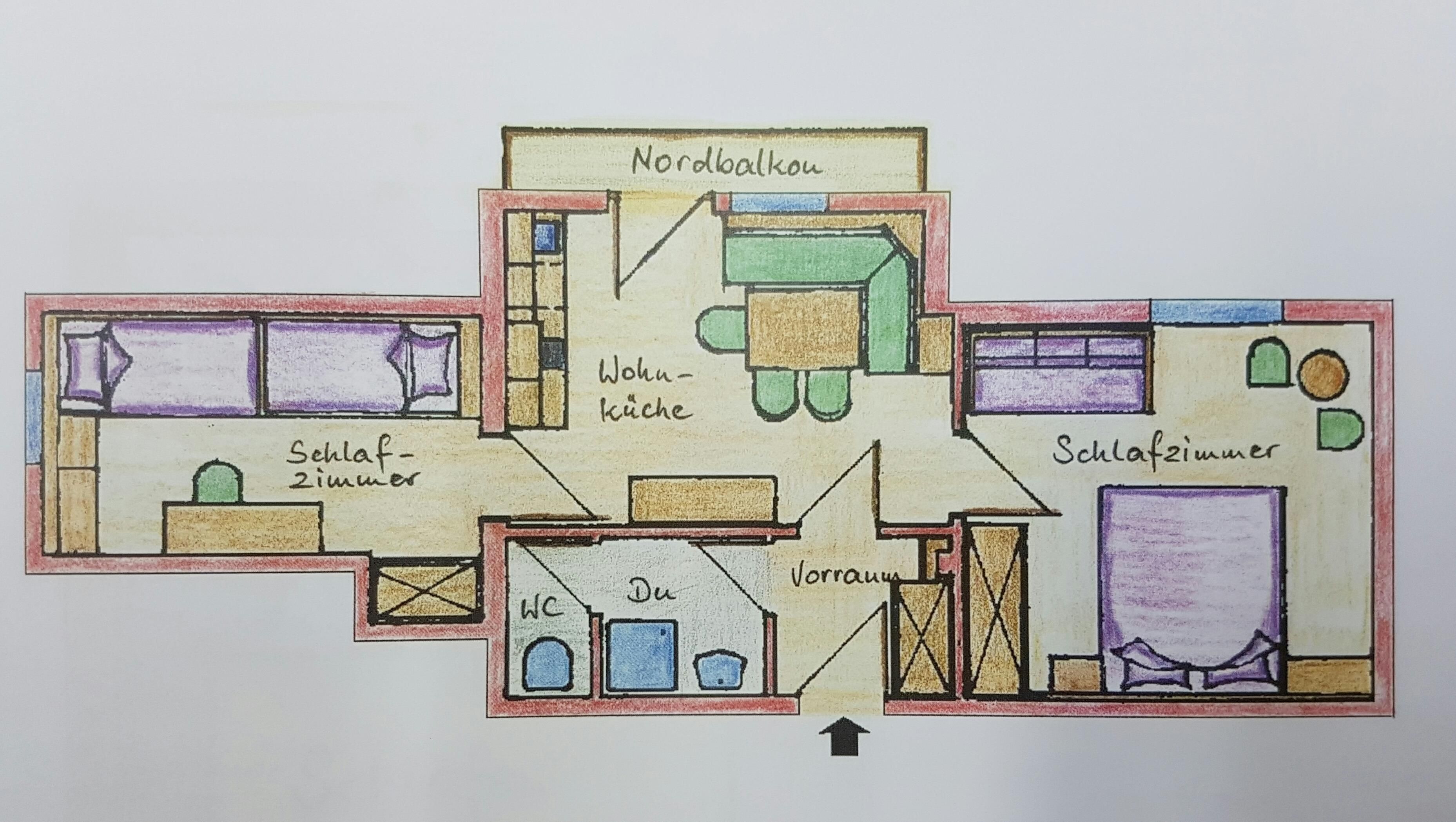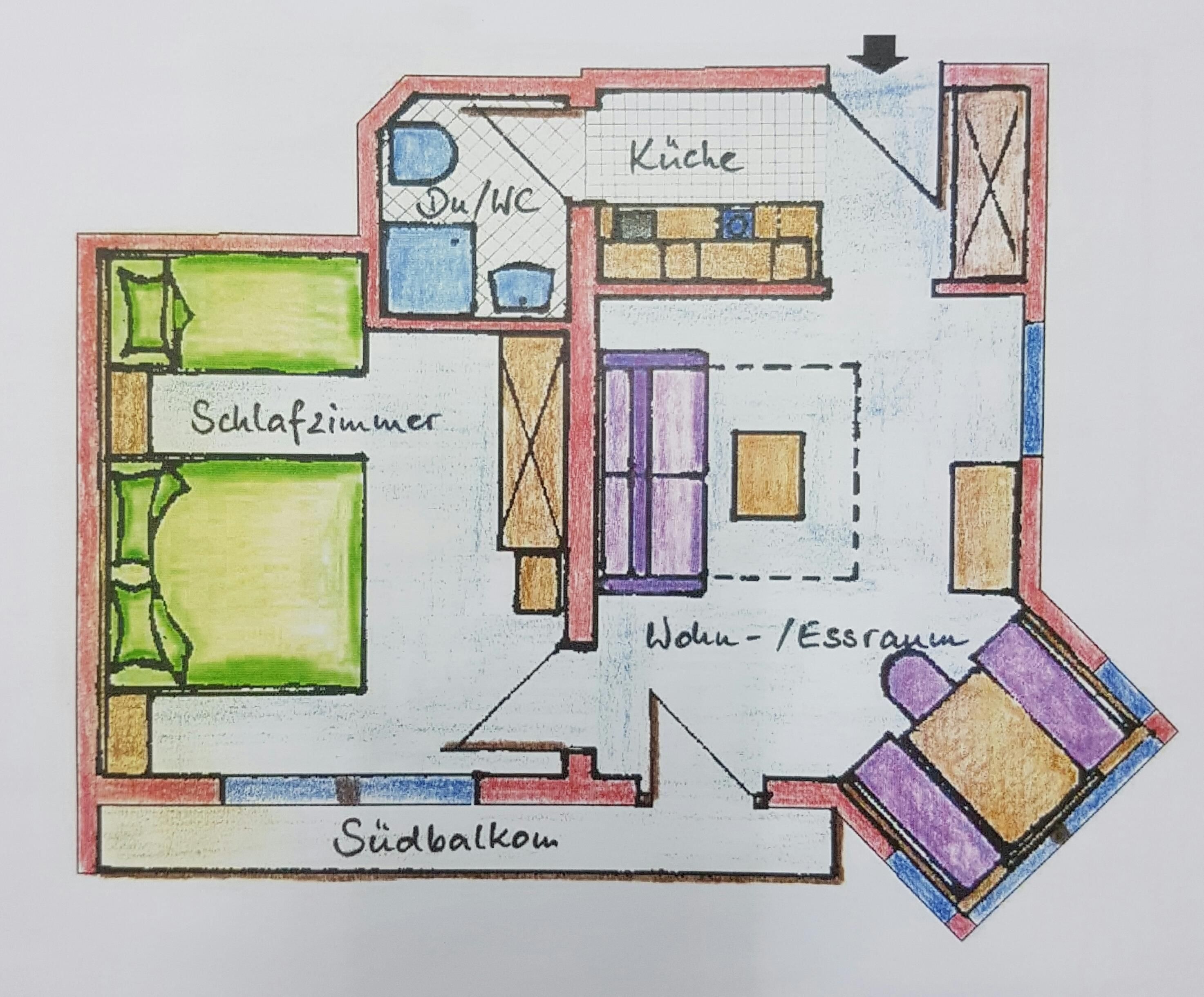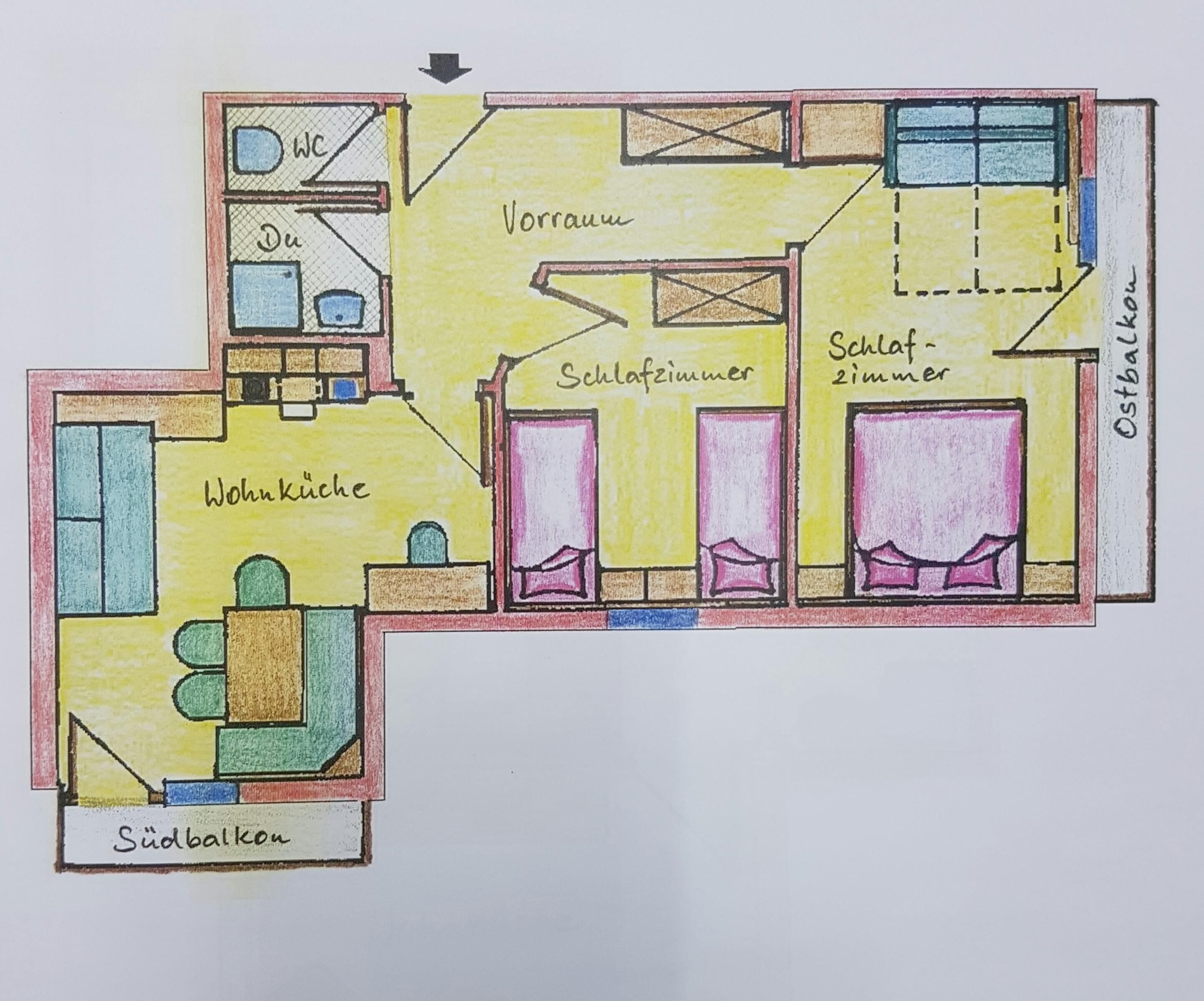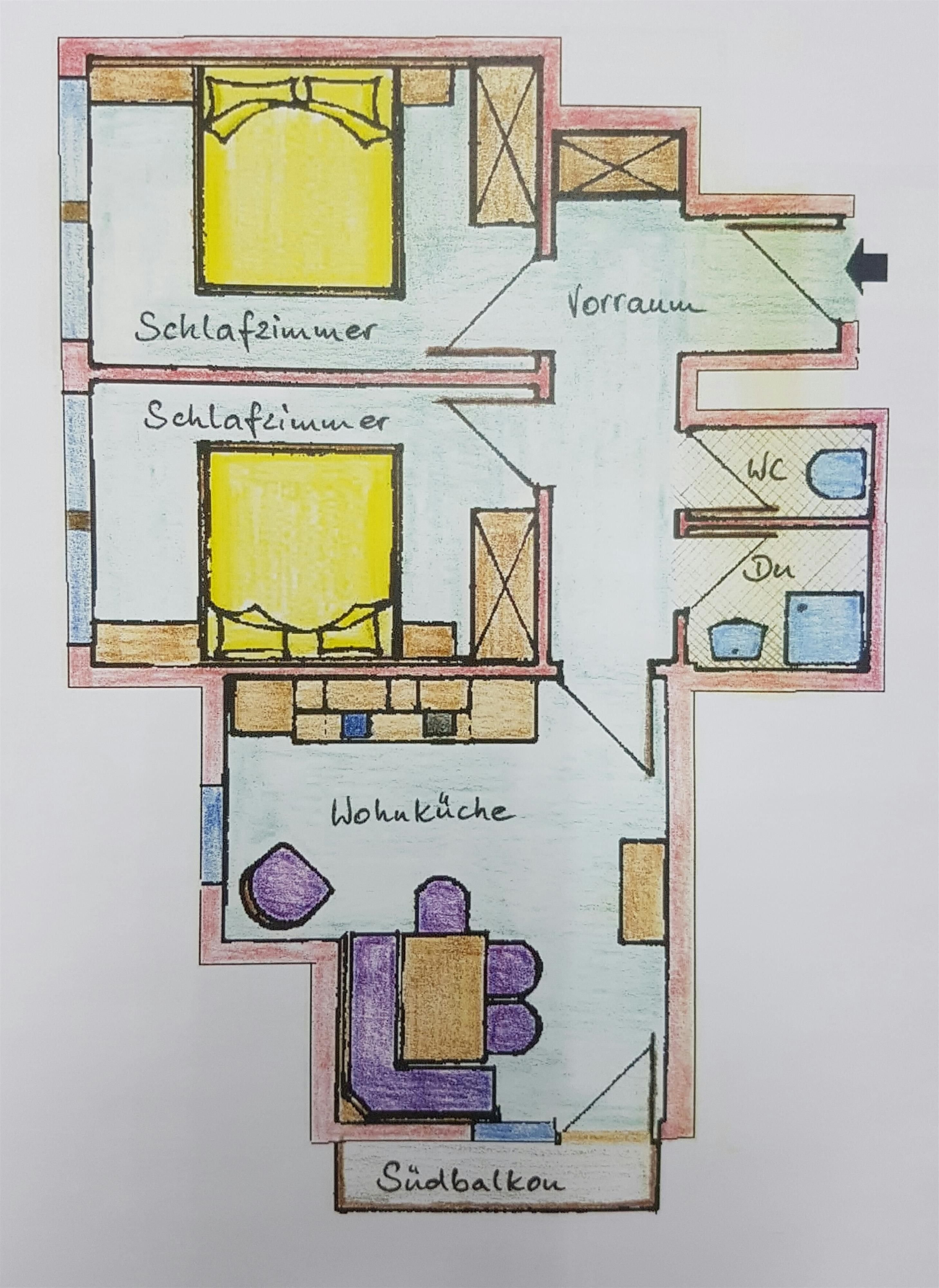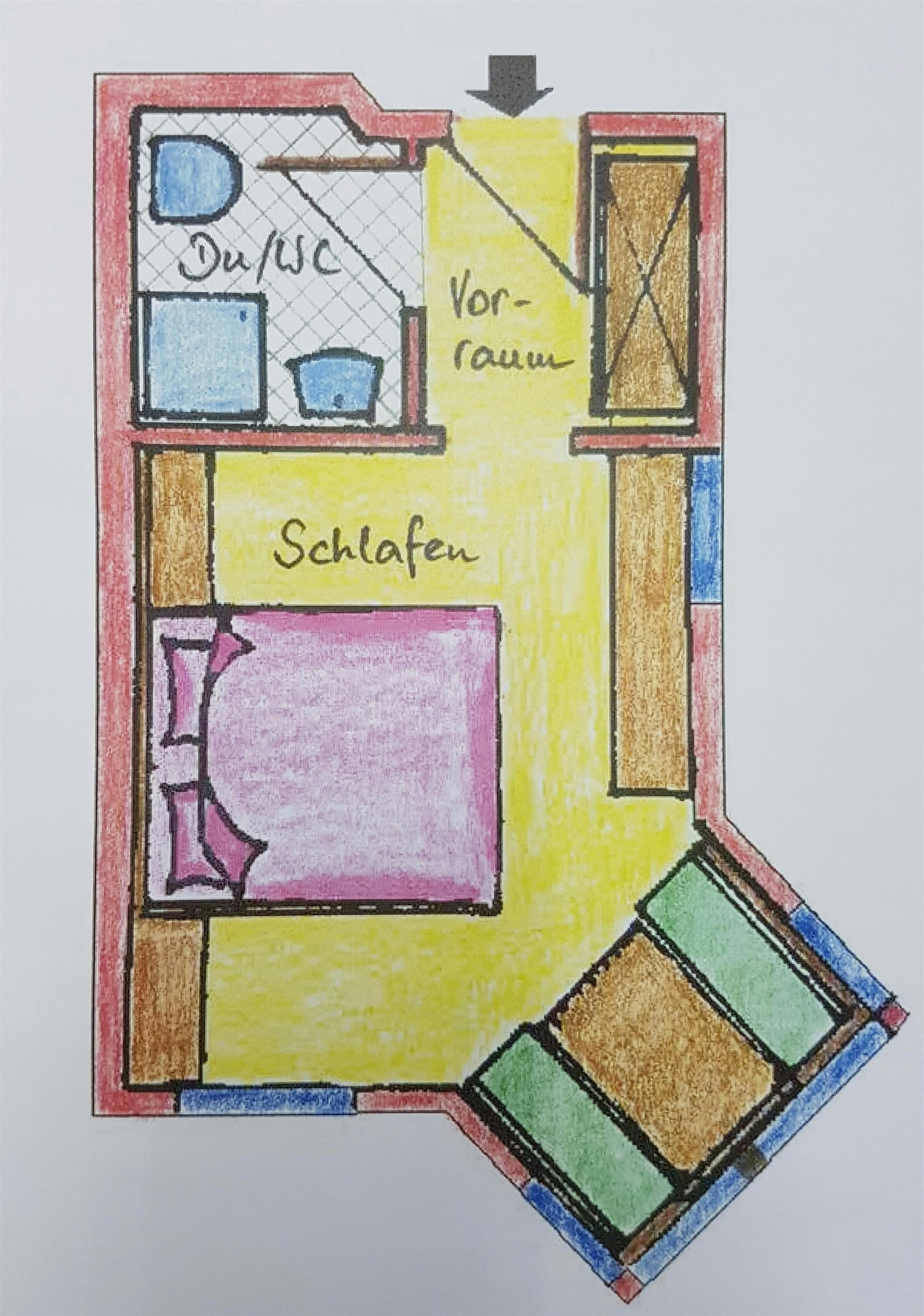 Zusätzlich zu den Ferienwohnungen haben wir ein ebenerdiges Doppelzimmer, das mit Dusche/WC, Sat-TV ausgestattet ist.