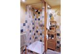 Ein Bad mit Dusche, Waschbecken, WC. Ausgestattet mit Badetüchern, Handseife, Fön.