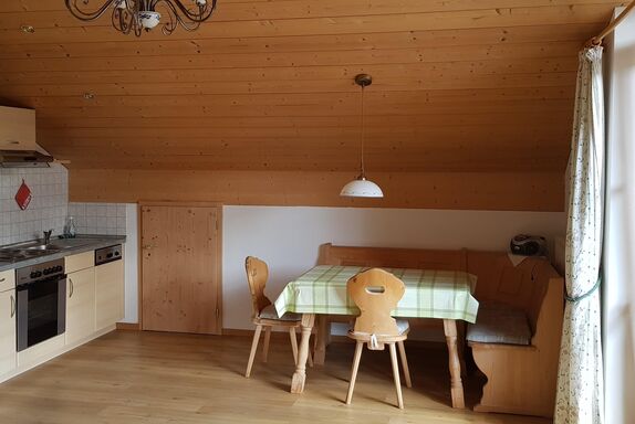 Stilvoll eingerichtete Komfort-Ferienwohnungen für 2-4 Personen. Wohnzimmer mit gemütlicher Sitzecke, Flachbild-Fernseher, komplett eingerichtete Küche mit Herd und Spülmaschine,Eckbank, Schlafzimmer, Dusche/WC, Radio, möblierter Balkon oder-Süd-Terrasse mit wunderbarer Aussicht auf die Berge und die freie Wiese vor dem Haus. Kostenloses WLAN, Große Liegewiese, Parkplätze am Haus