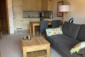 Die lichtdurchflutete Wohung besteht aus einem Wohn-/Esszimmer mit hochwertigem ausziehbarem Schlafsofa, einer offenen Küche (Toaster, Wasserkocher und Kaffeemaschine vorhanden) und separatem Schlafzimmer mit Doppelbett. Vorrangig ist die Wohnung geeignet für 2 Personen mit bis zu 2 Kindern. Beide Zimmer bieten Zugang auf den großen sonnigen und teilweise überdachten Balkon. Dort finden Sie einen Tisch mit Stühlen, einen Sonnenschirm und eine Aufbewahrungsbox zum Verstauen der Sitzauflagen. Im Bad befindet sich ein großes Waschbecken mit Spiegelschrank, Dusche, WC und ein Fön.