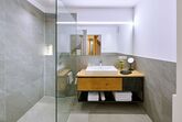 • 1 Badezimmer mit begehbarer bodengleicher Regendusche, WC, Waschtisch, Föhn, beheizbarem Handtuchtrockner, Badradio, Pflegeprodukten und Schminkspiegel