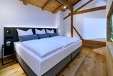 • 1 Schlafzimmer im Dachgeschoss mit extra großem Doppelbett (240x200 cm), Smart-TV sowie integriertem Schreibtisch