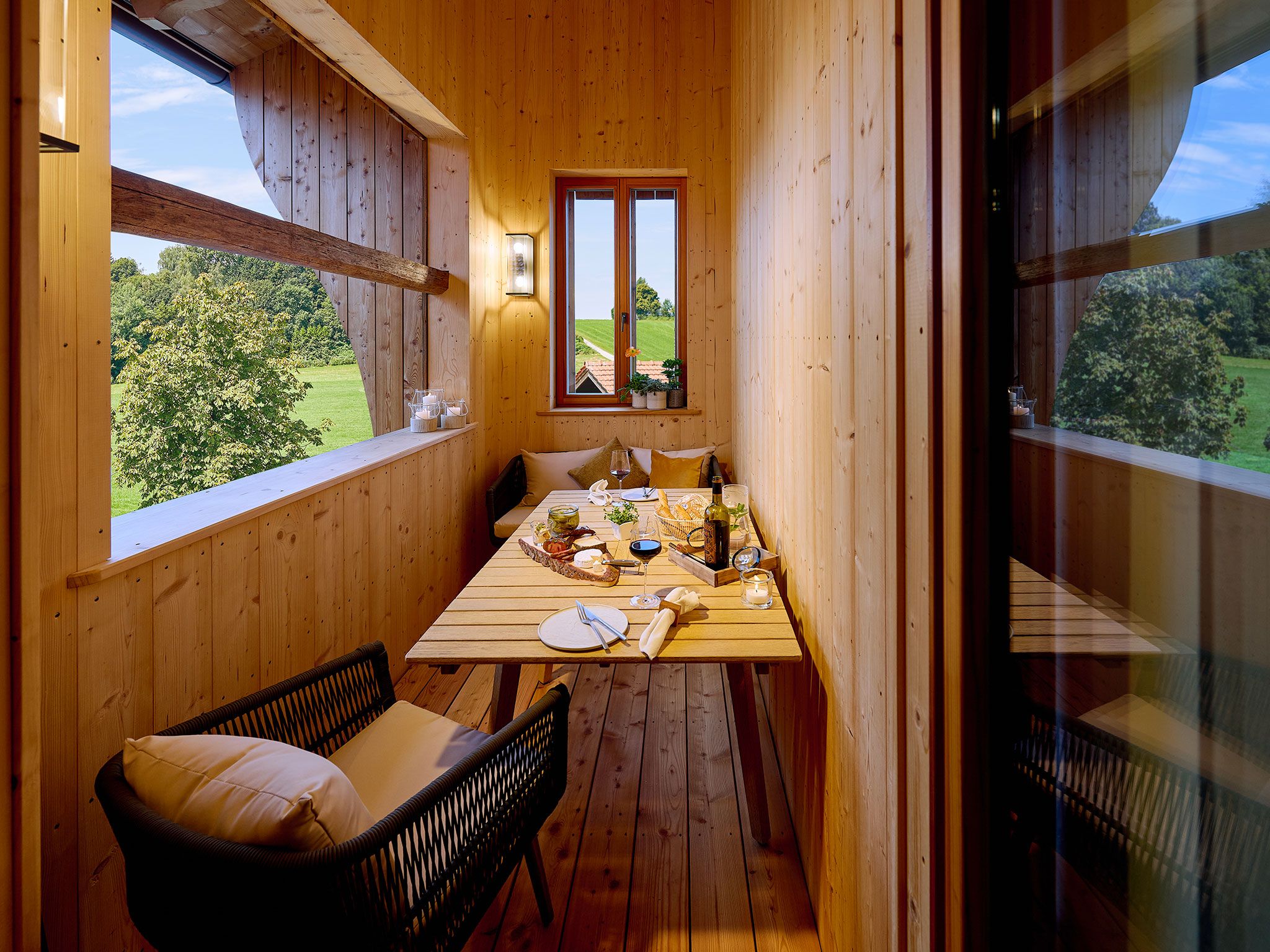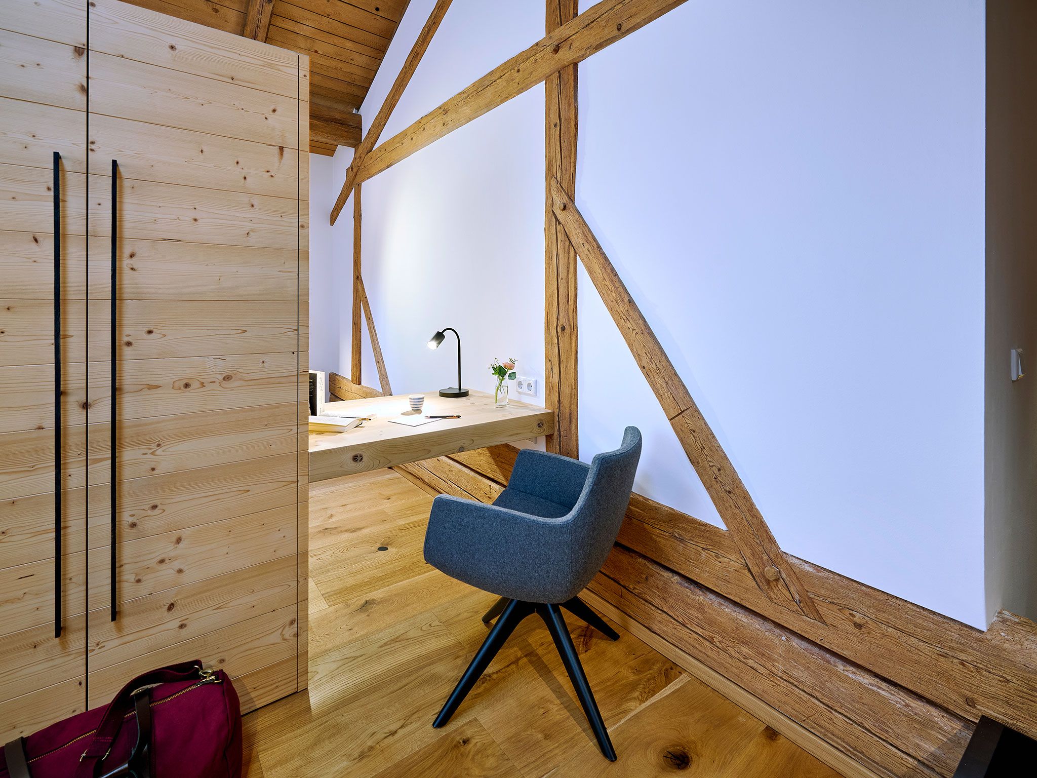 Willkommen auf dem alten Heuboden über dem ehemaligen Gewölbestall am Moierhof Gstadt. In den beiden nach der Sanierung entstandenen Obergeschossen über dem alten Gewölbestall befindet sich heute die luxuriöse 5-Sterne-Ferienwohnung „Heuboden“. Sie ist auf geräumigen 82 qm ein wahres Paradies für zwei Personen. Neben den gemütlichen Wohn- und Essbereichen lässt es sich in der Sonne auf der nach Süden offenen möblierten Loggia wahrhaft relaxen. Hat sich die Sonne an einem Urlaubstag versteckt, geht das Entspannen auf der heimeligen Galerie mit Relax-Liege im Dachgeschoss gemütlich weiter. Ein Wohlfühl-Schlafzimmer im Dachgeschoss, ein Wohlfühl-Badezimmer sowie das durch die behutsam in das alte denkmalgeschützte Fachwerk verbauten Naturmaterialien erzeugte Wohlfühl-Klima machen die gesamte Ferienwohnung zu einem einzigartigen Erlebnis.