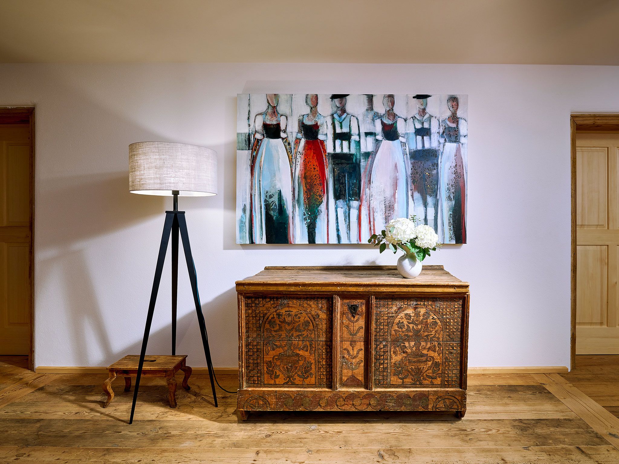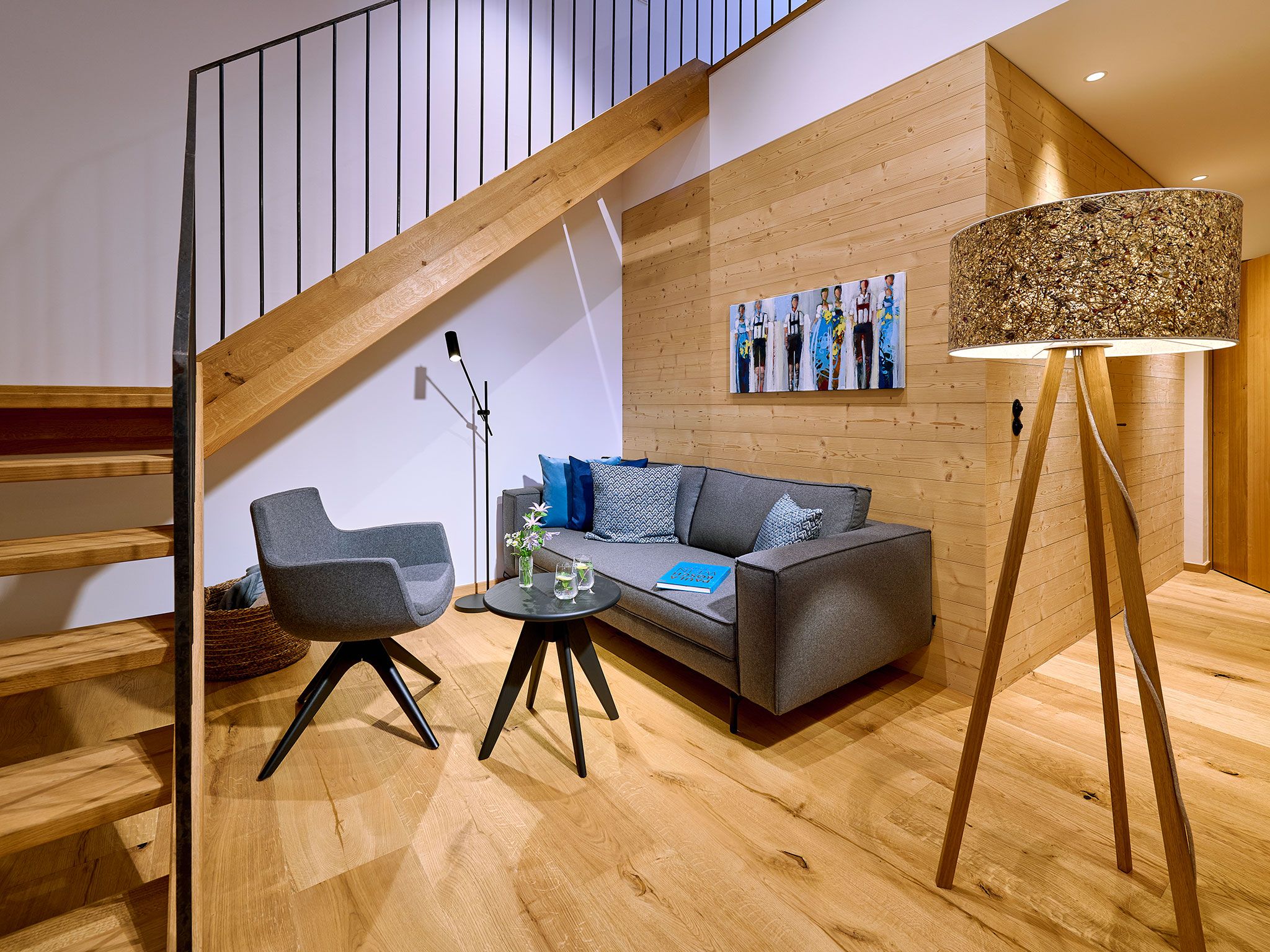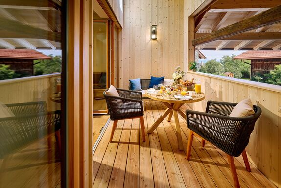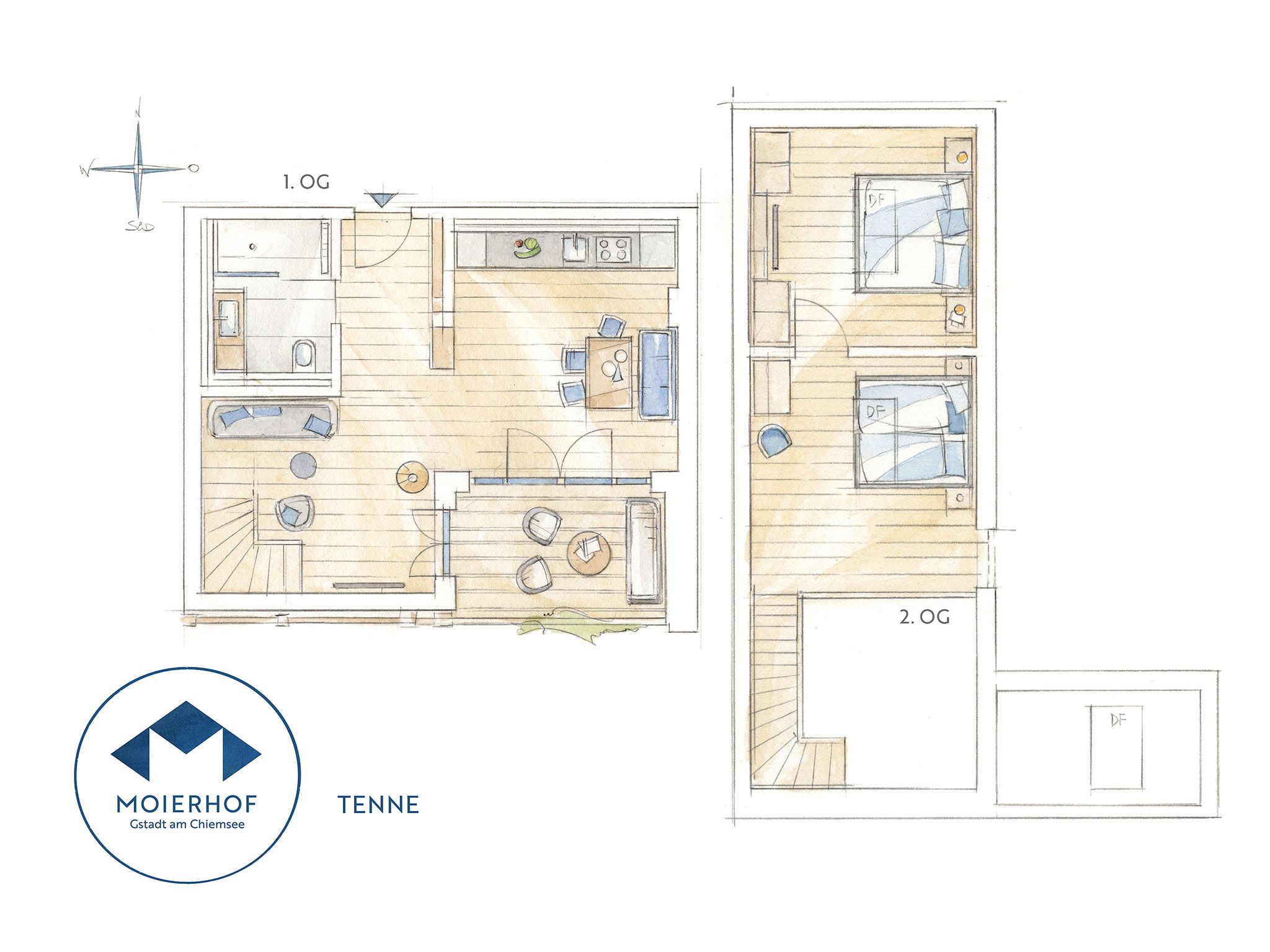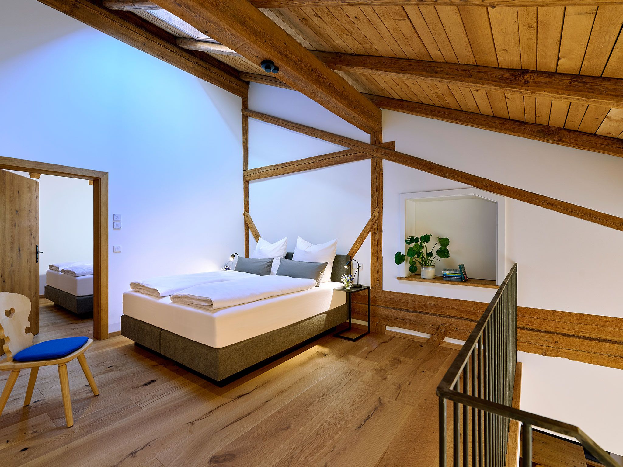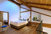 Über zwei Etagen im Obergeschoss des alten Gewölbestalls erstreckt sich die 5-Sterne-Luxus-Ferienwohnung „Tenne“ am Moierhof Gstadt. Hier fühlst du Dich in einem freundlichen Wohnambiente sofort wie zu Hause. In den zwei Schlafzimmern direkt unter dem Sichtdachstuhl finden bis zu vier Personen eine angenehme Rückzugsmöglichkeit zum Erholen. Viel Echtholz, das alte denkmalgeschützte Fachwerk, harmonisch abgestimmte Farben in der Einrichtung und edle Lichtelemente sorgen für ein wahres Wohlgefühl. Ein Highlight der Ferienwohnung ist die überdachte und nach Süden hin offene möblierte Loggia für romantische Sommerabende mit Chiemseeblick.