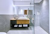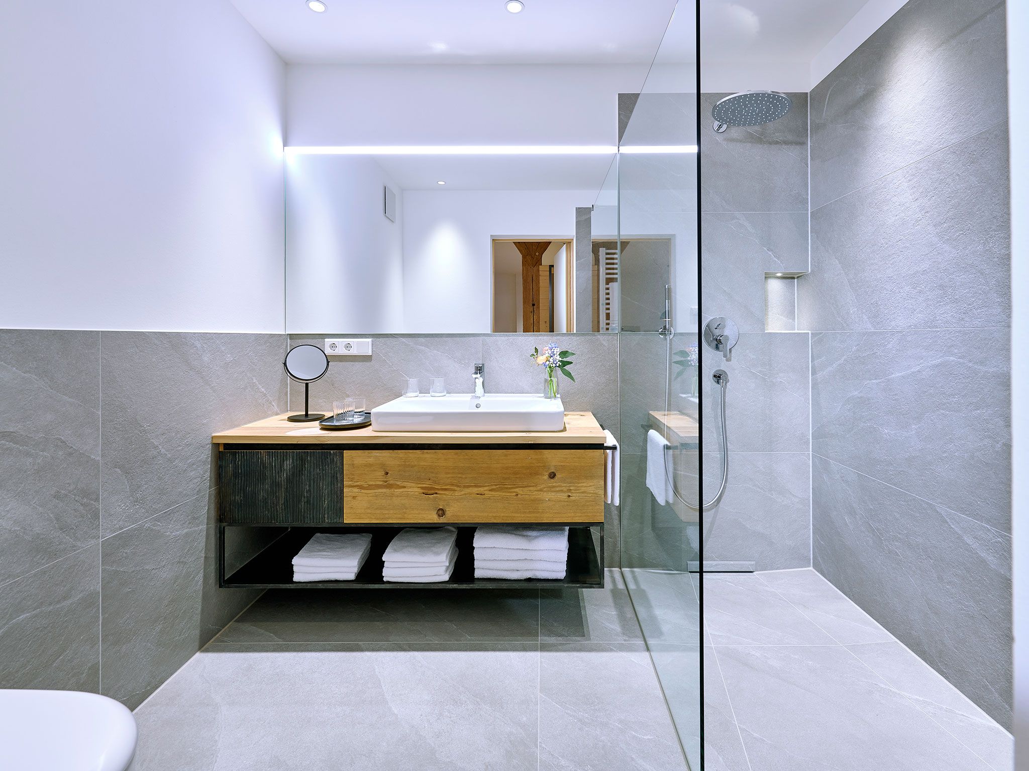 • 1 Badezimmer mit begehbarer bodengleicher Regendusche, WC, Waschtisch, Föhn, beheizbarem Handtuchtrockner, Badradio, Pflegeprodukten und Schminkspiegel