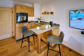 • Komplett ausgestatteter Küchen-Essbereich mit E-Herd (Induktion), Backofen, Kühlschrank mit Gefrierfach, Geschirrspüler, Nespresso Kaffeemaschine, Wasserkocher, Toaster und Eierkocher