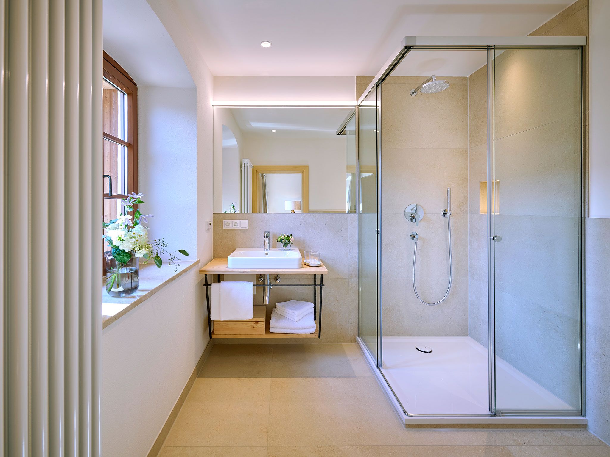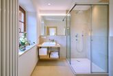 • 1 Badezimmer mit Regendusche, WC, Waschtisch, Föhn, beheizbarem Handtuchtrockner, Badradio, Pflegeprodukten und Schminkspiegel