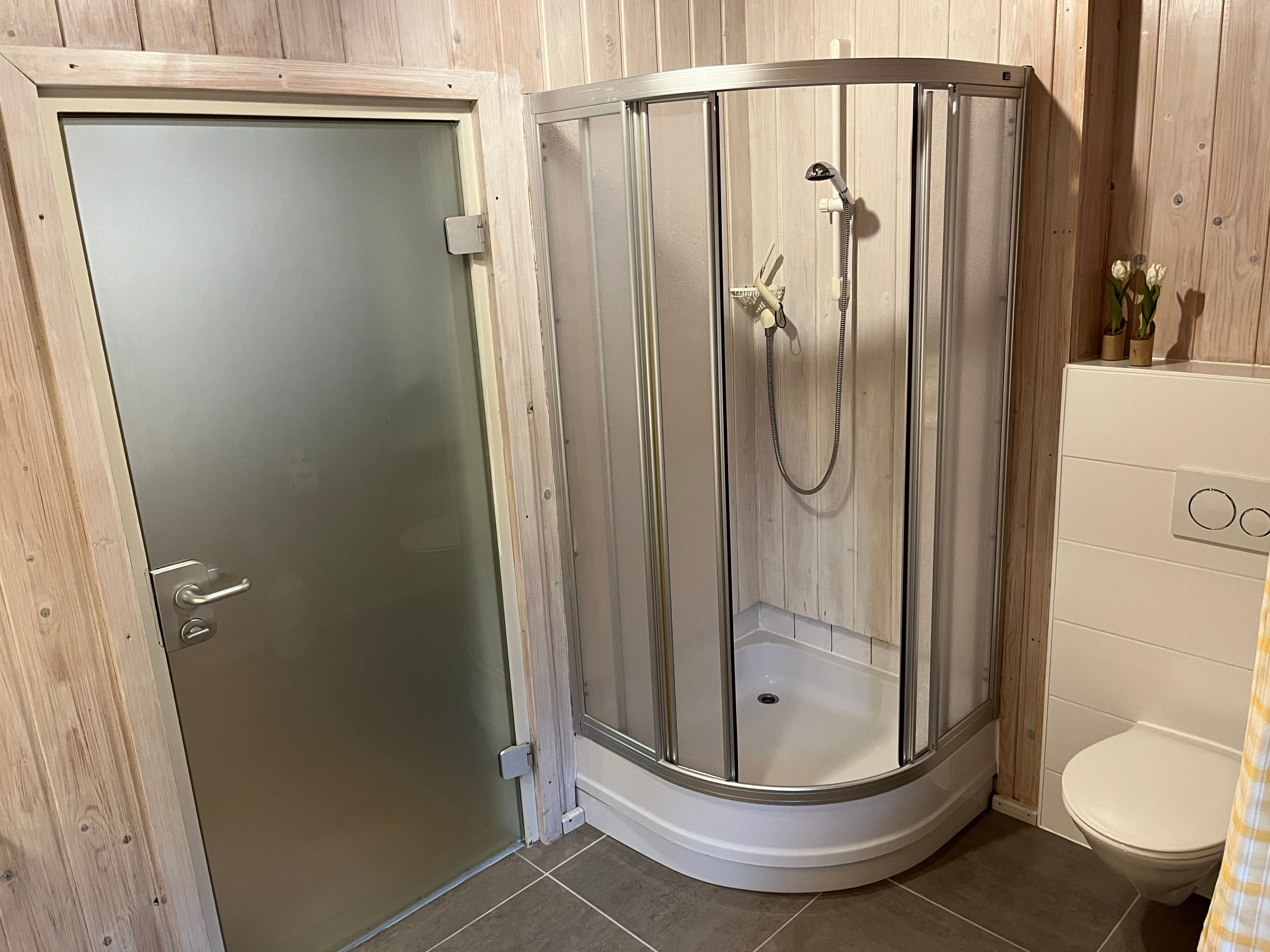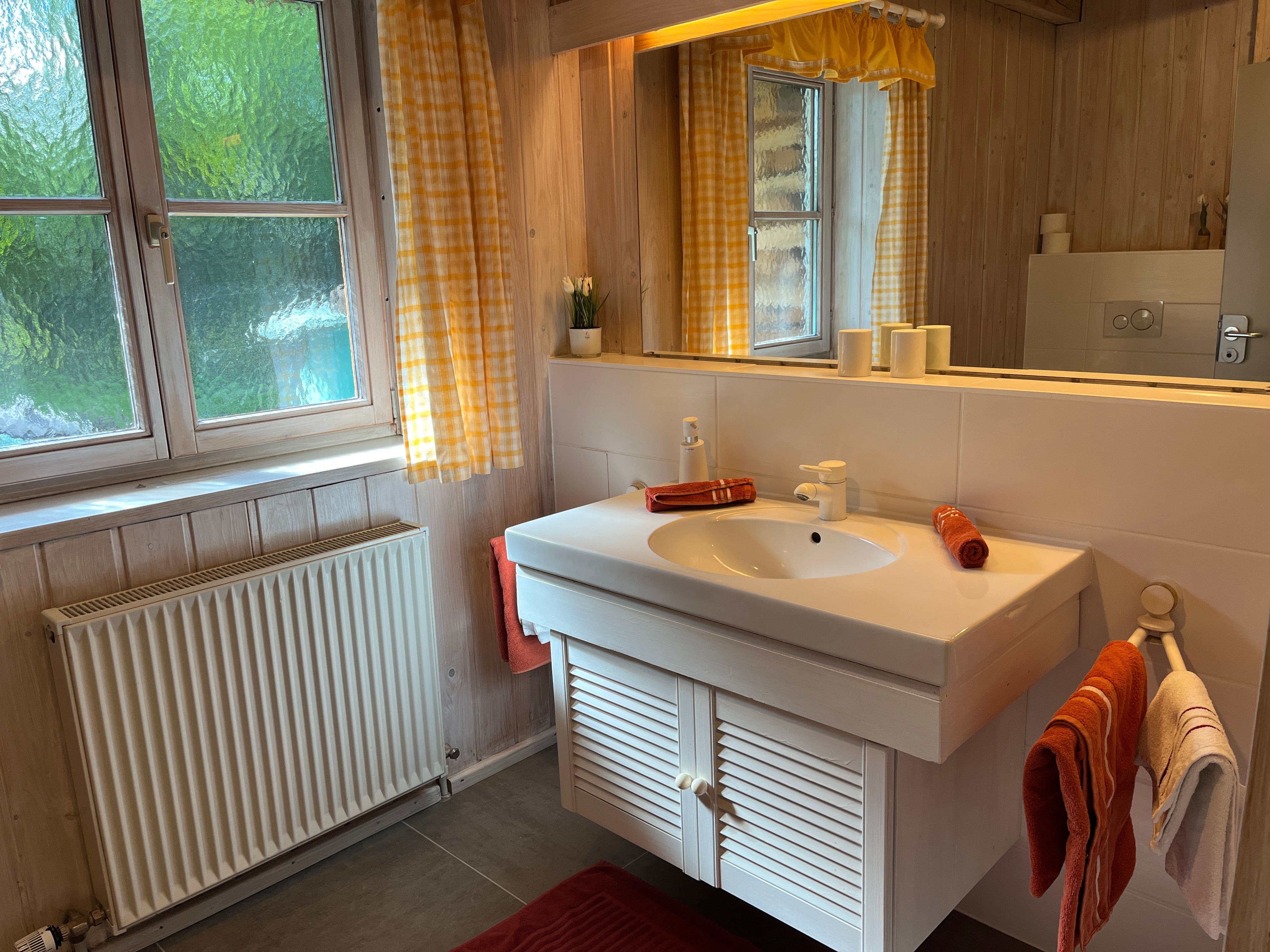 Das helle Bad mit Fenster ist ausgestattet mit Dusche, WC, großem Waschtisch mit Spiegel, Kosmetikspiegel, Föhn sowie WC Papier. Hand und Badetücher sind im Preis enthalten.