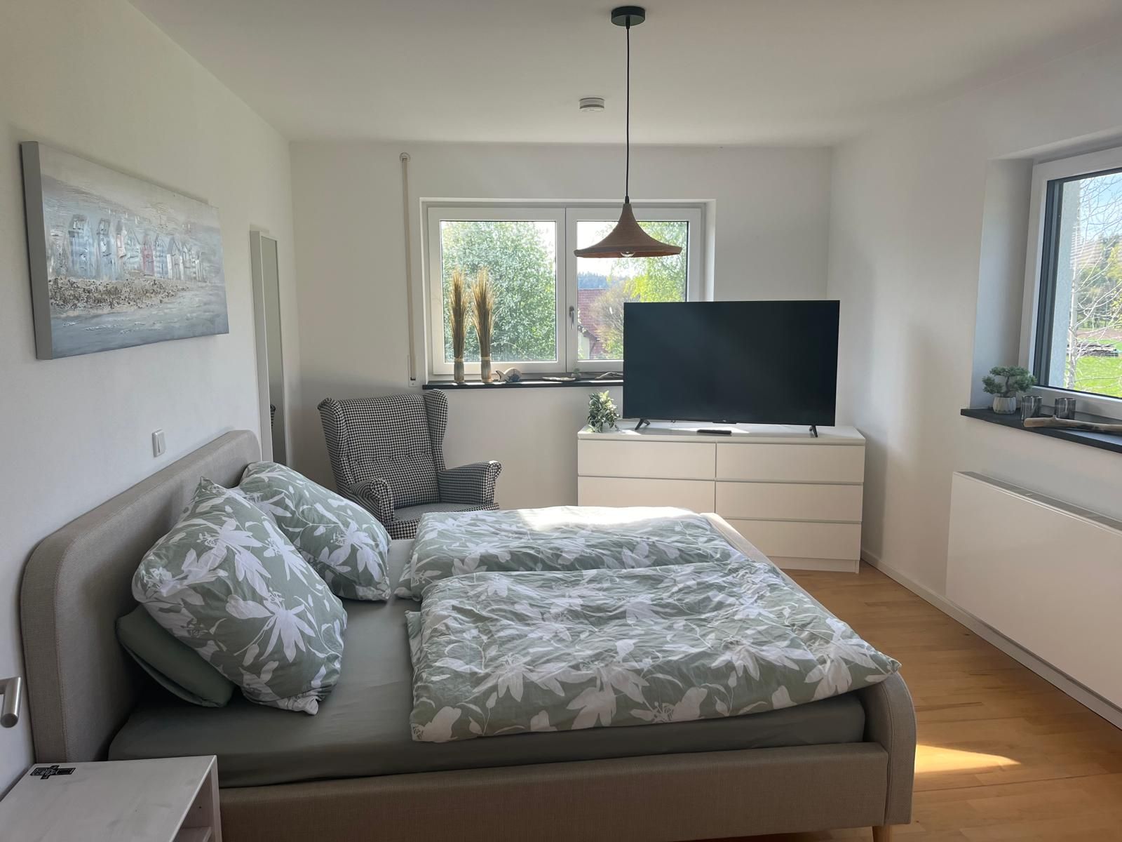 Genieße die Ruhe und den weiten Blick über Wiesen und Wälder – ideal zum Entspannen und Auftanken. Unsere zwei stilvoll eingerichteten Ferienwohnungen (83qm und 87qm) bieten modernen Komfort und viel Platz für deinen Aufenthalt im Grünen. Auf der gemütlichen Terrasse findest du den perfekten Ort zum Verweilen.