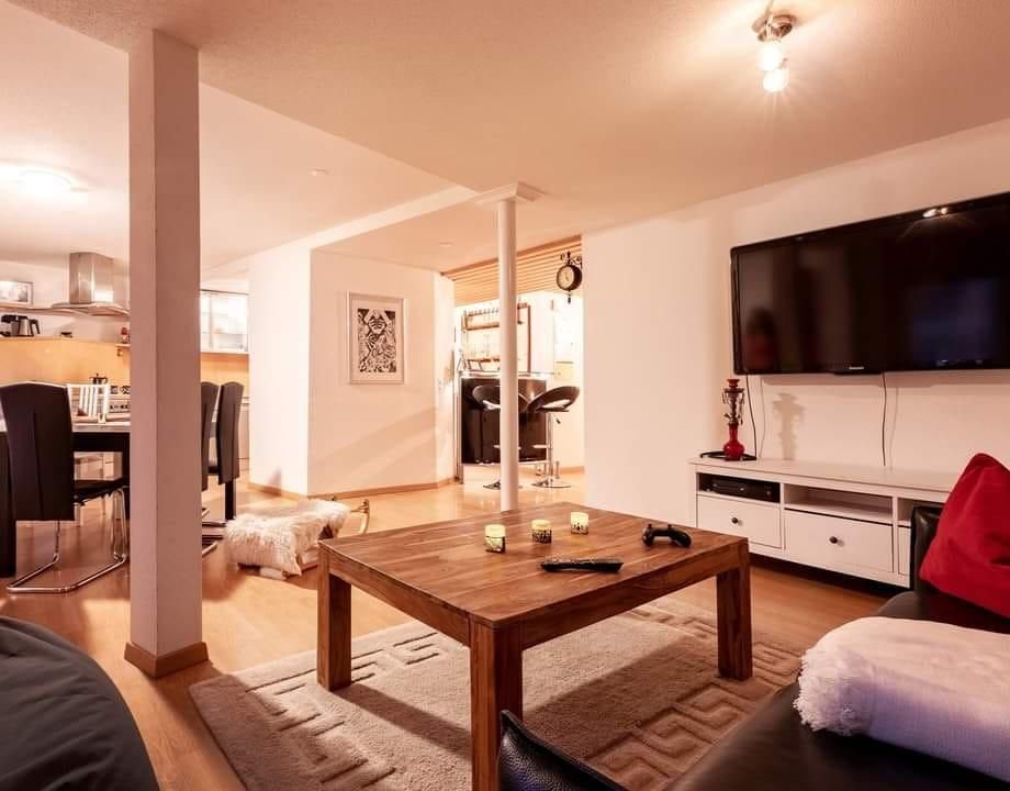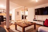 • Wohnbereich: Ein geräumiges Wohnzimmer mit einem großen Flatscreen-TV, der den Zugriff auf verschiedene Streaming-Dienste ermöglicht.