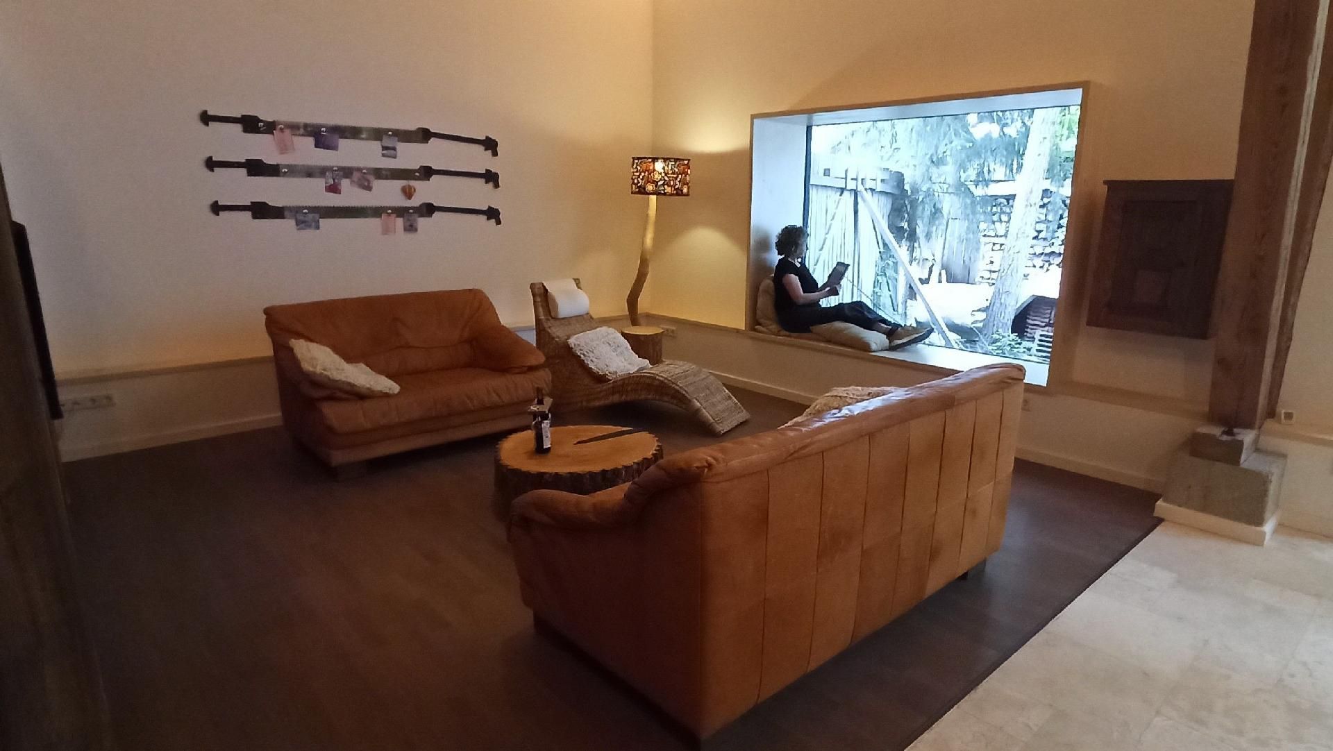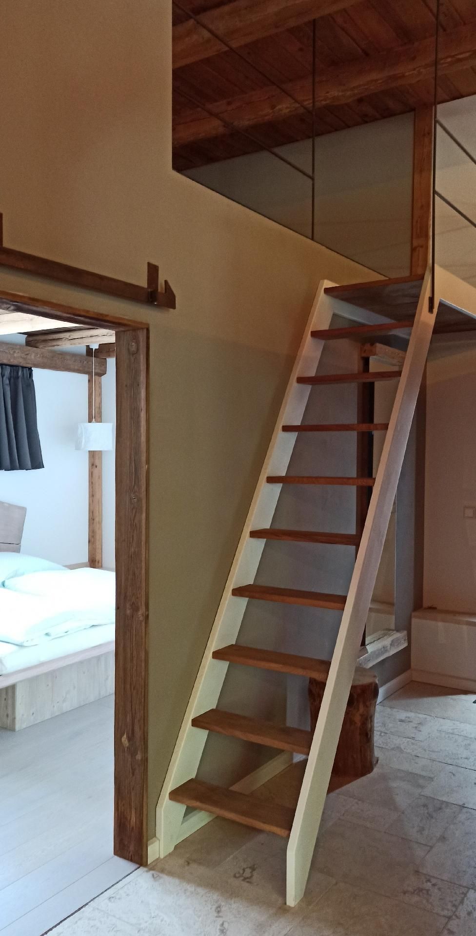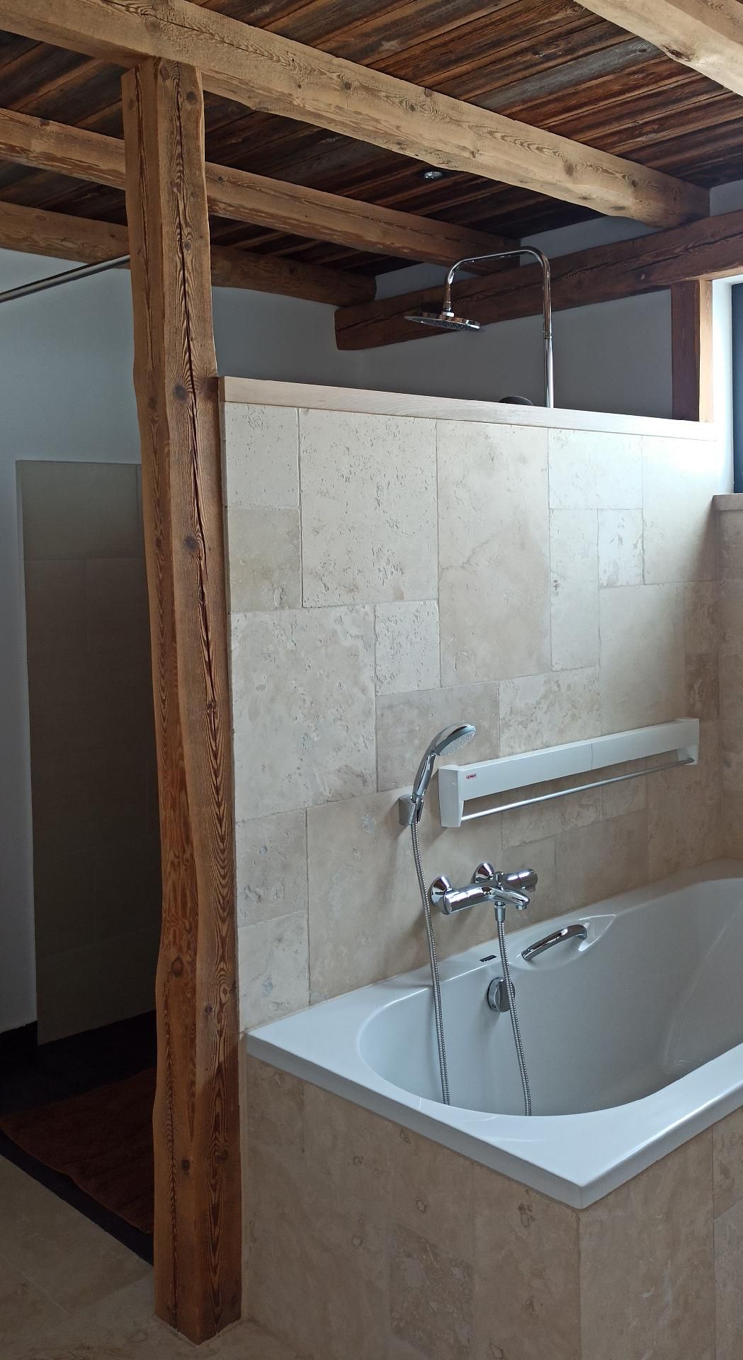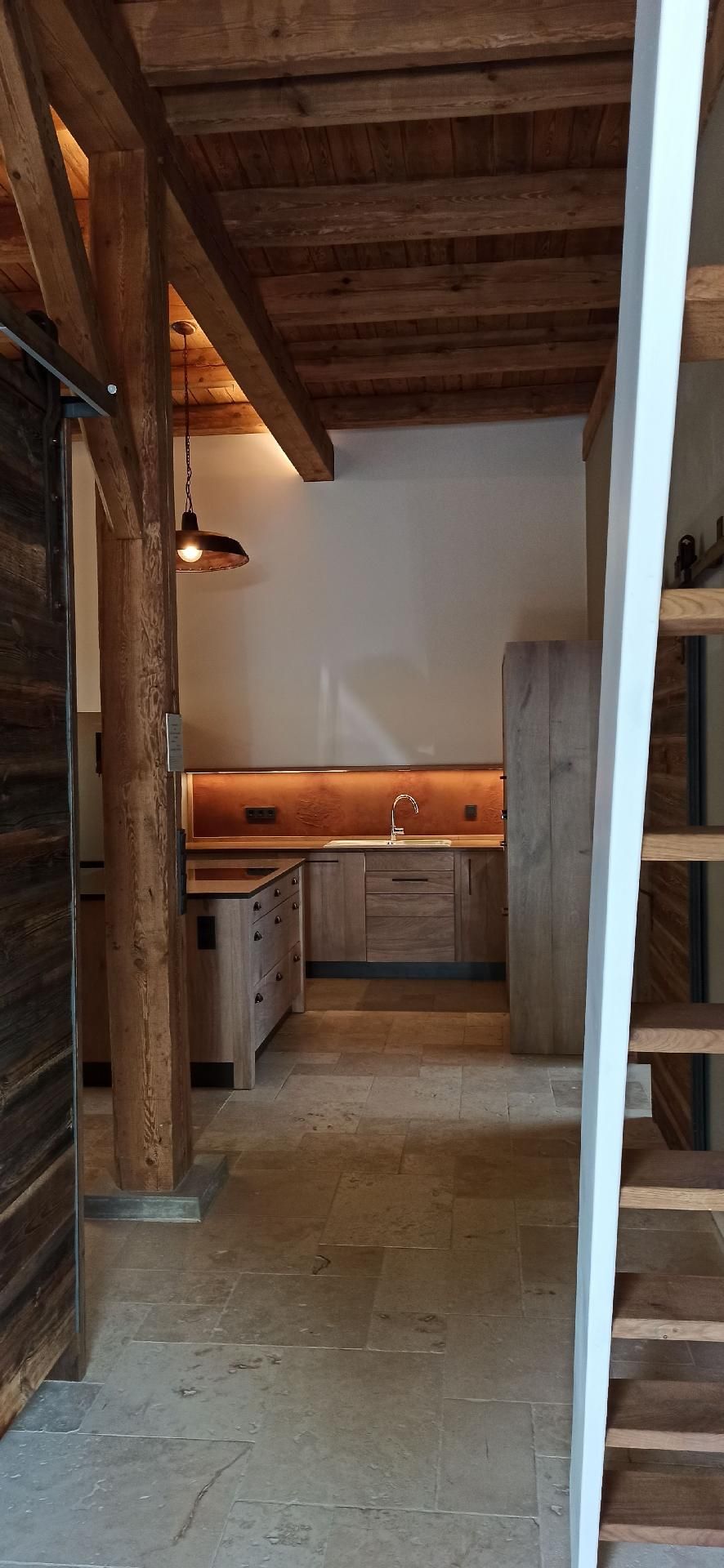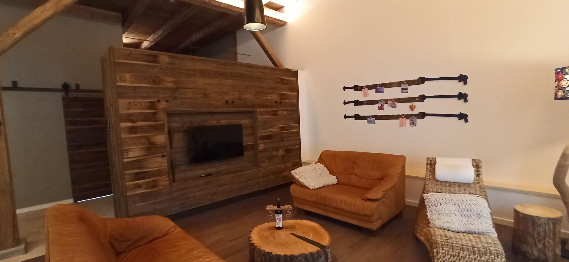 Innen überzeugt das Loft mit einer umweltschonenden Fußbodenheizung und einem biologischen Ambiente, das einzigartig gestaltet ist. Für Ihre Bequemlichkeit sorgt ein gemütliches Schlafzimmer für 2 bis 3 Personen und ein originelles Matratzenlager im niedrigen offenen Obergeschoss (1,40 m hoch), das zusätzlichen Schlafplatz für 3 Gäste bereithält. Das großzügig ausgestattete Badezimmer mit Dusche und Badewanne rundet das Wohnerlebnis ab. In der voll ausgestatteten Küche finden Sie alles, was das Herz begehrt, darunter Cerankochfeld, Spülmaschine, Wasserkocher und Filterkaffeemaschine, ergänzt durch eine praktische Waschmaschine.