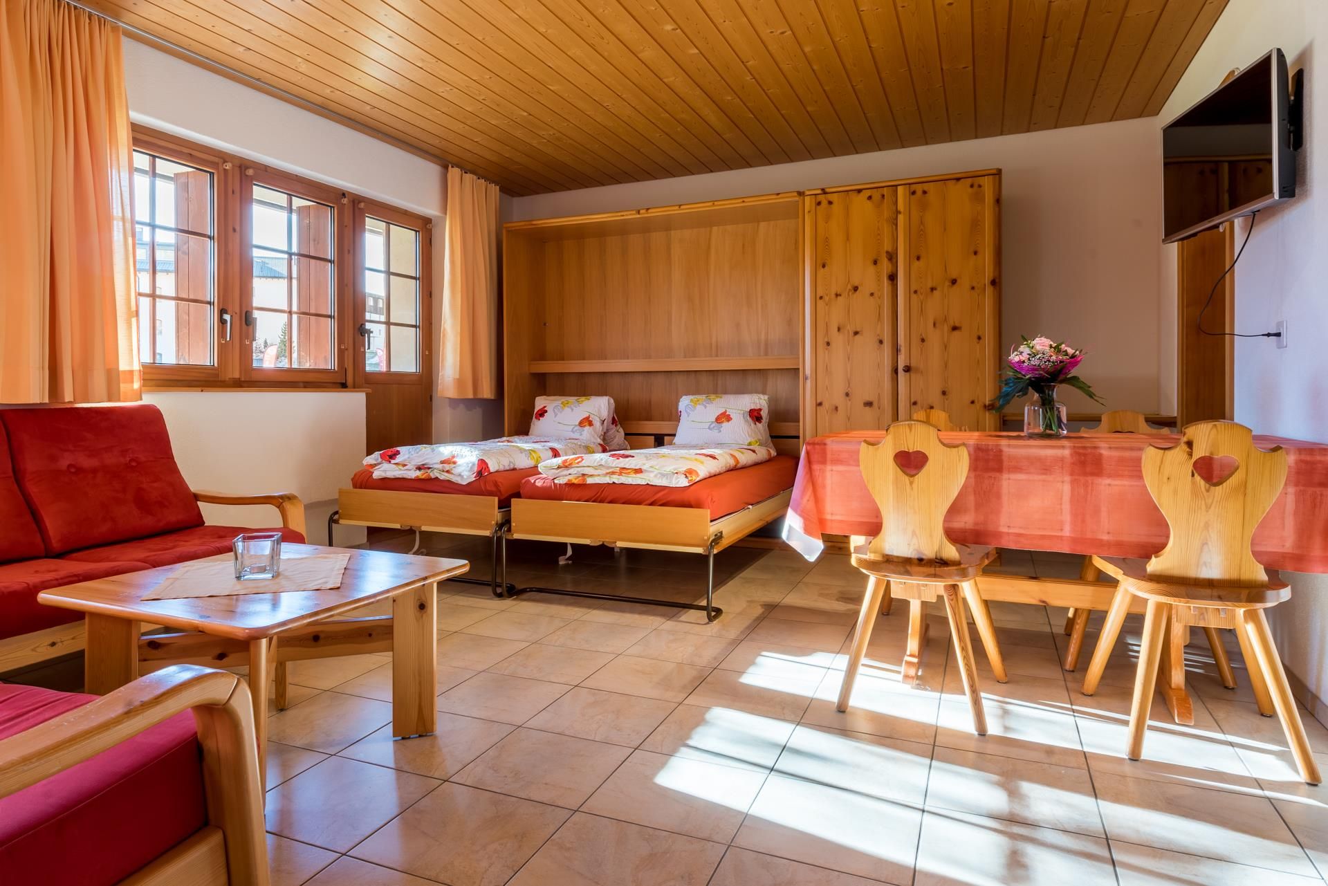 Die 2 1/2-Zimmer-Wohnung ist für 1 bis 4 Personen geeignet und verfügt über einen separaten Schlafraum sowie einen Wohnraum mit Küche und zwei Klappbetten. Ein Highlight ist der Südbalkon mit freier Sicht auf die Walliser Viertausender. Die Wohnung ist Nichtraucher, sehr gepflegt und sauber. Zur Ausstattung gehören WLAN, SAT-TV, Lift, Waschmaschine und Trockner. Im Winter steht ein geschlossener Skiraum mit moderner Schuhtrocknungsanlage und Desinfektion zur Verfügung. Im Sommer lädt eine Liegewiese mit Grillplatz vor dem Haus zum Verweilen ein.