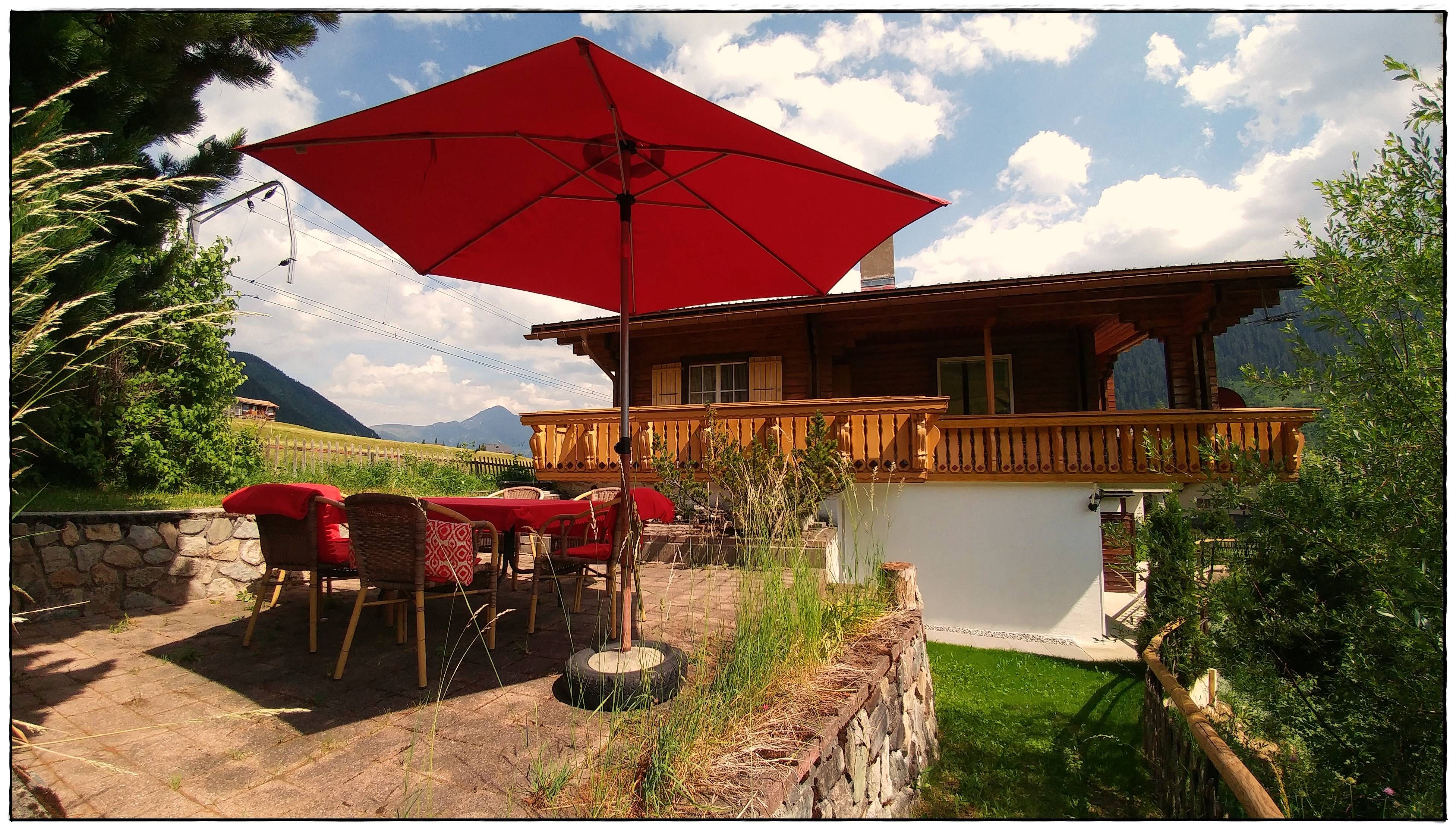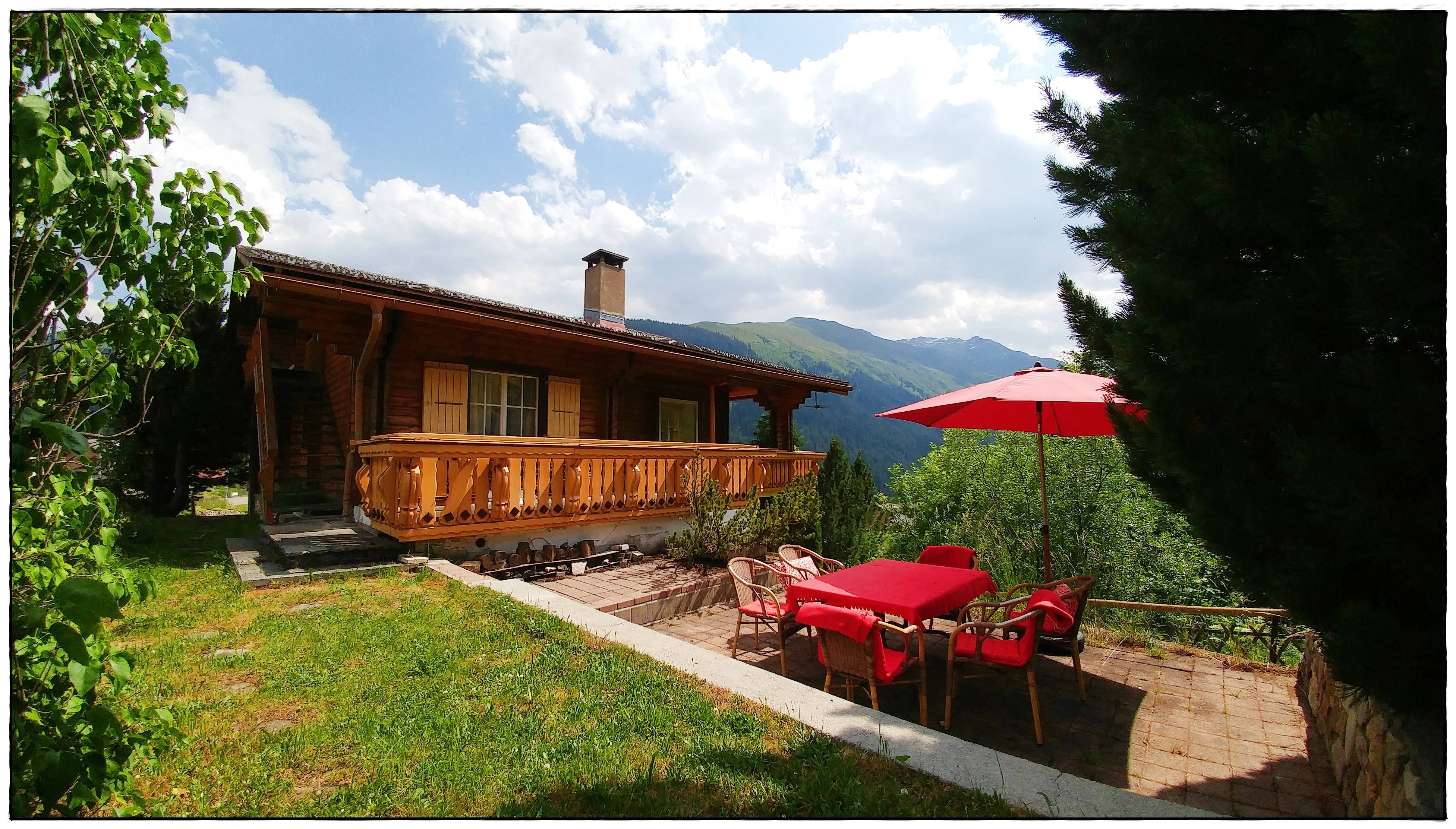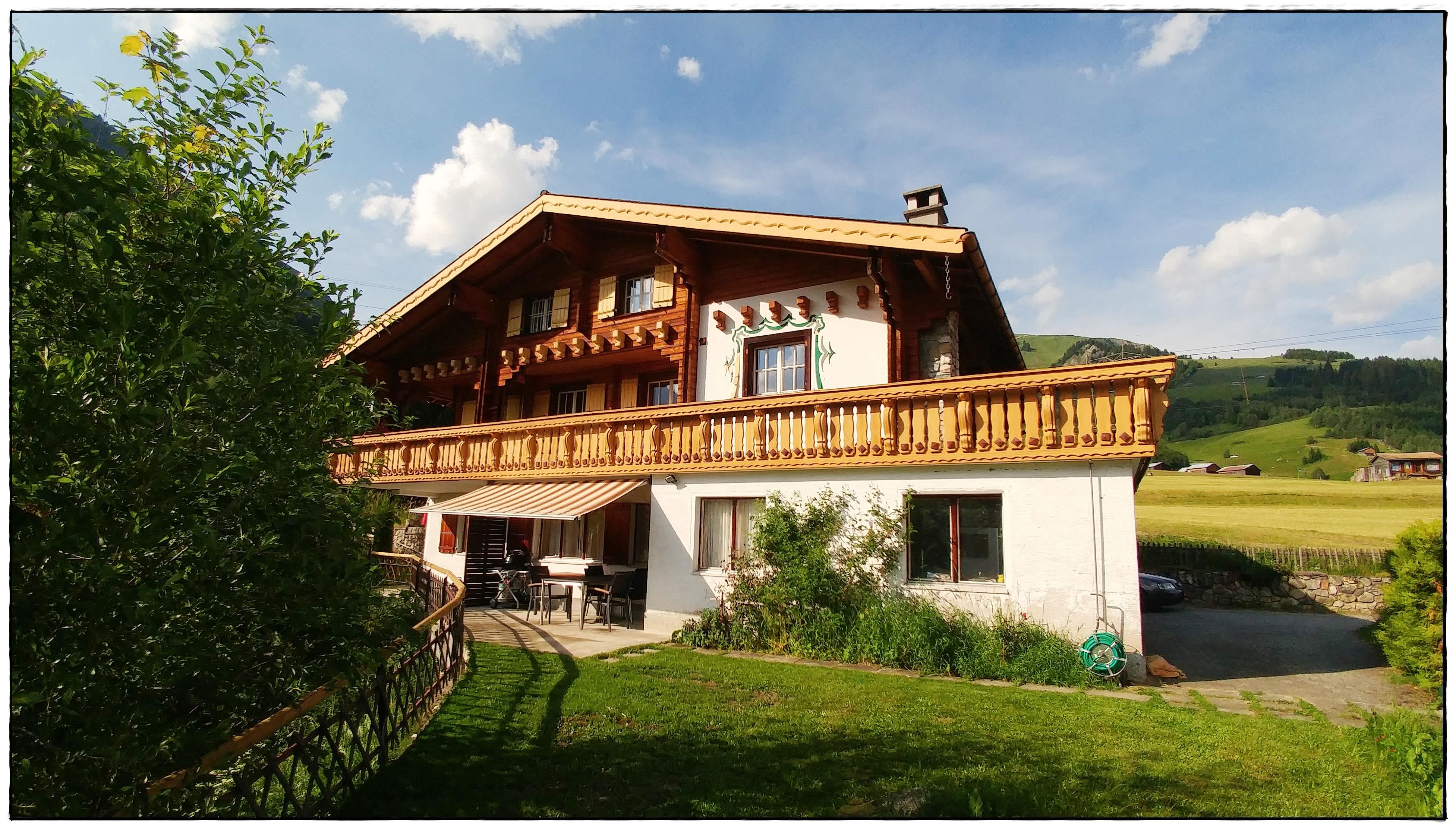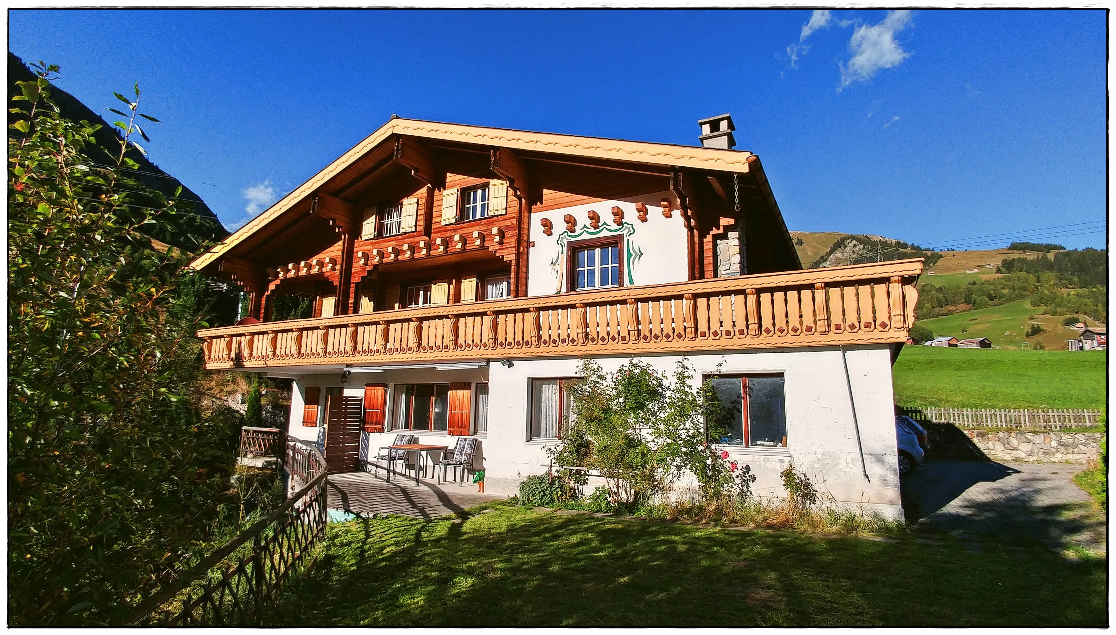 Einzigartige Panoramasicht auf die Berge. Balkon/Terrasse rund ums Haus, seitlich und über die ganze Hausfront, teils gedeckt mit gemütlichen Sitzplätzen. Am Haus angrenzend, Garten zur Mitbenutzung.