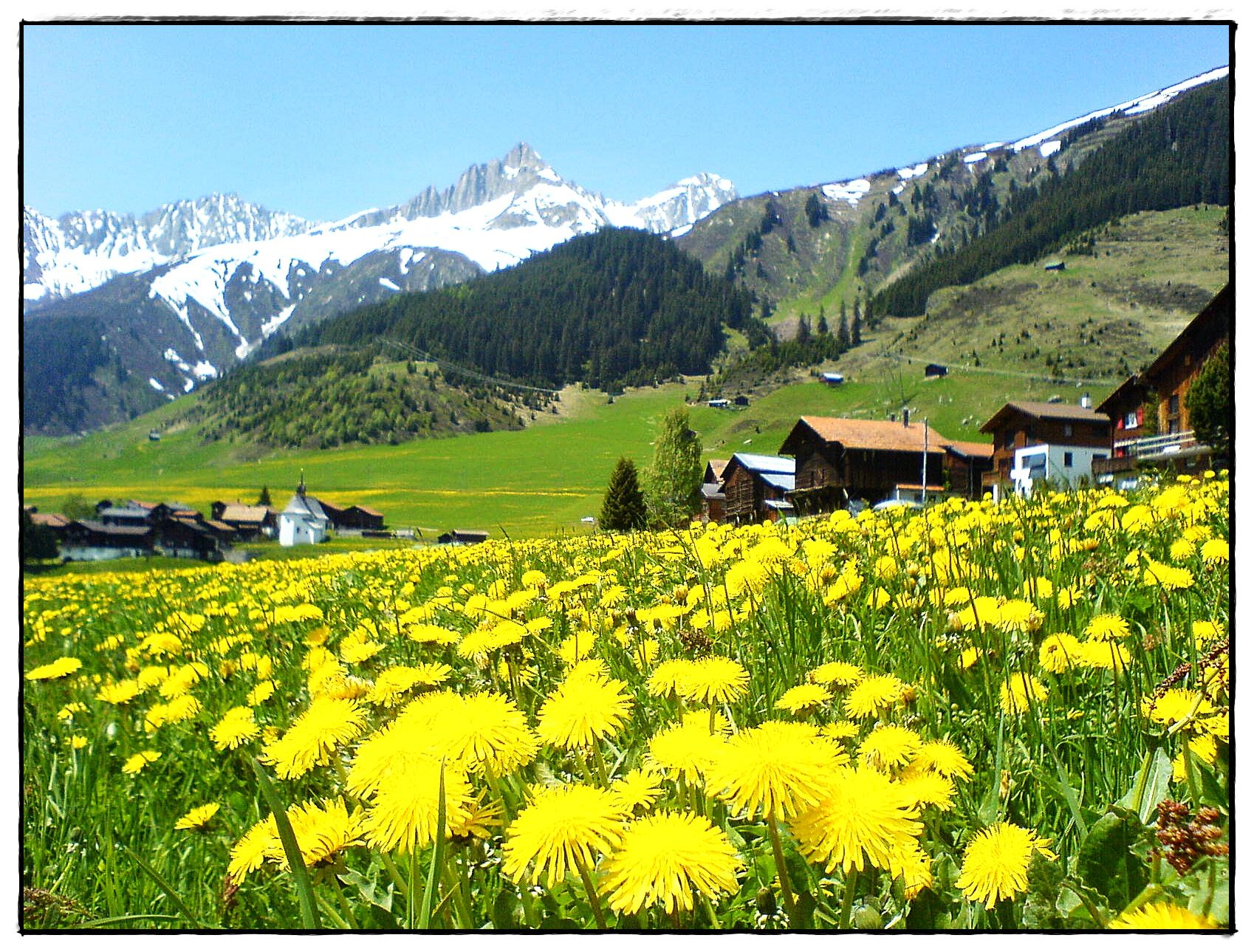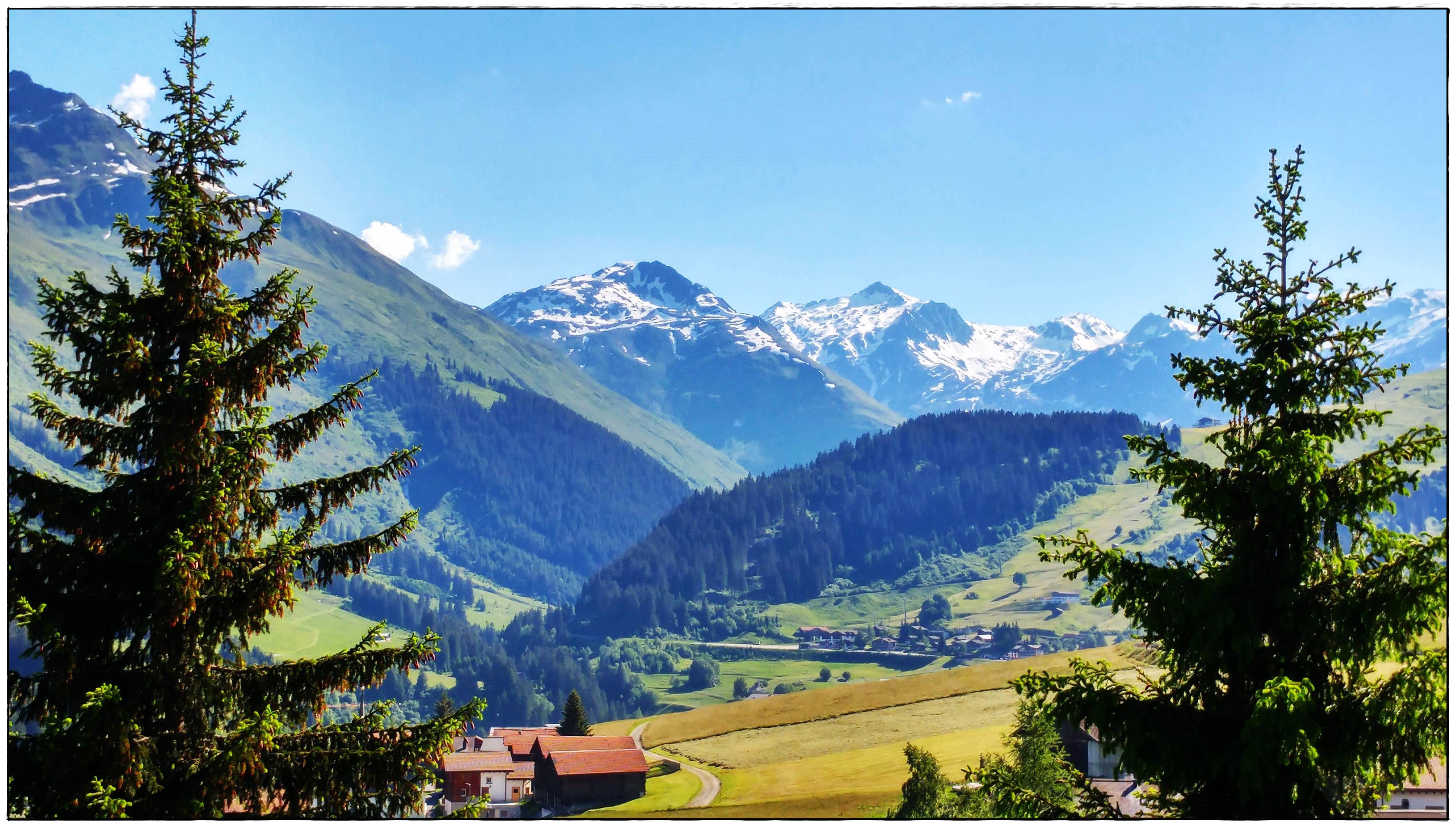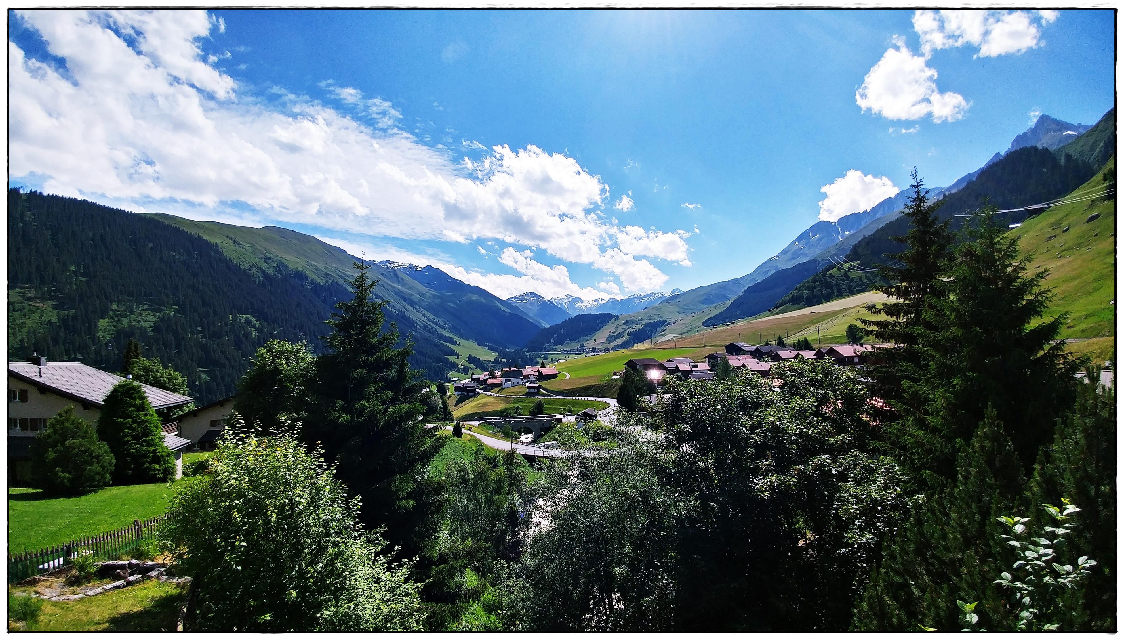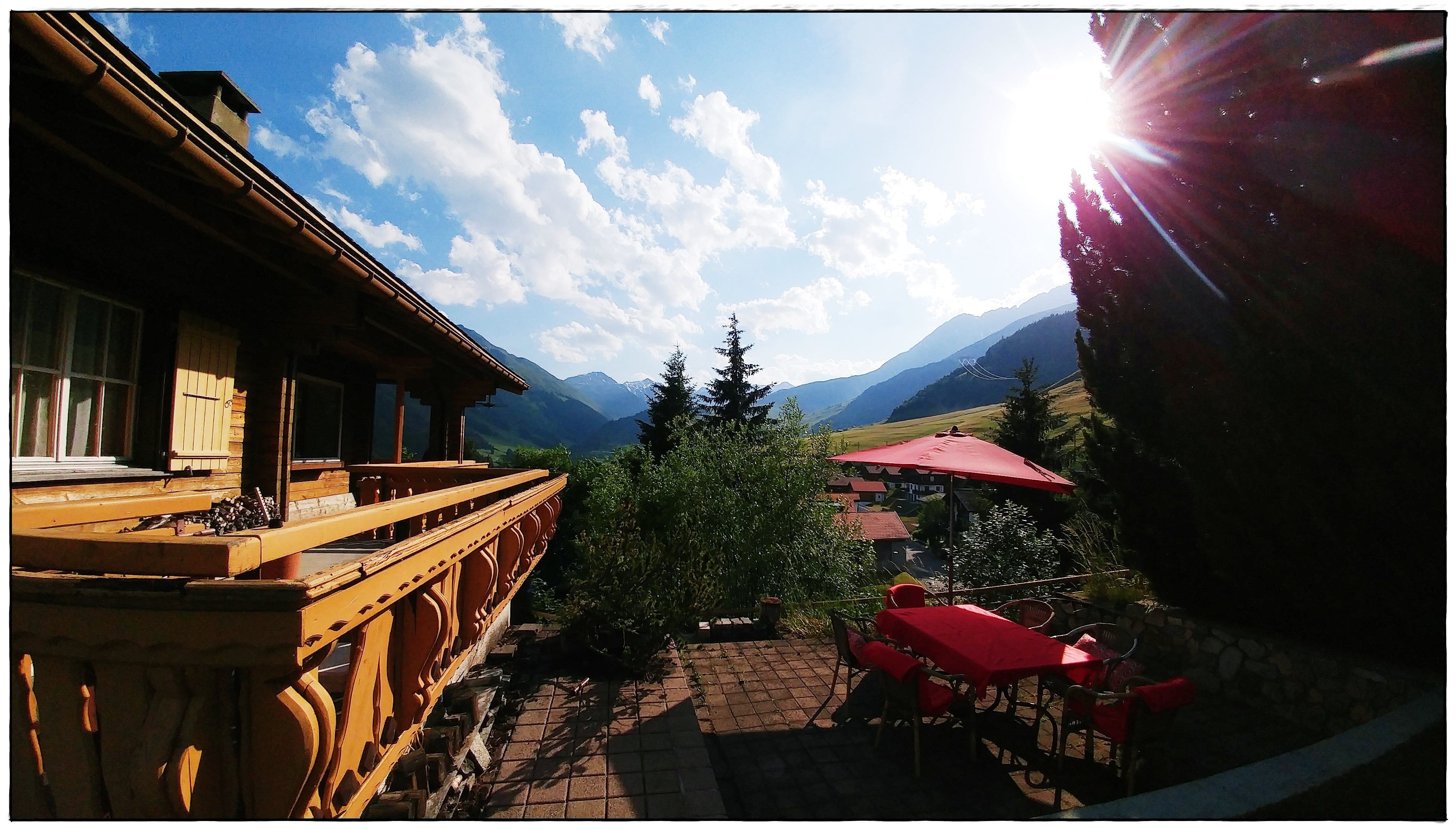 Einzigartige Panoramasicht auf die Berge. Balkon/Terrasse rund ums Haus, seitlich und über die ganze Hausfront, teils gedeckt mit gemütlichen Sitzplätzen. Am Haus angrenzend, Garten zur Mitbenutzung.