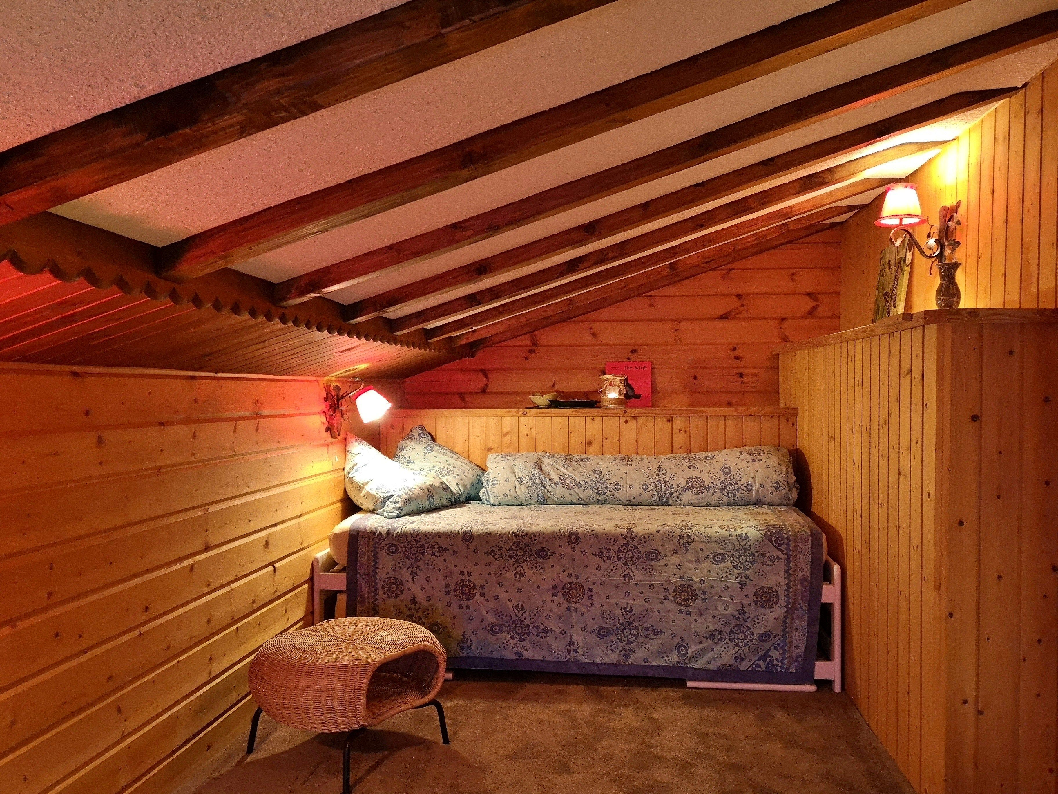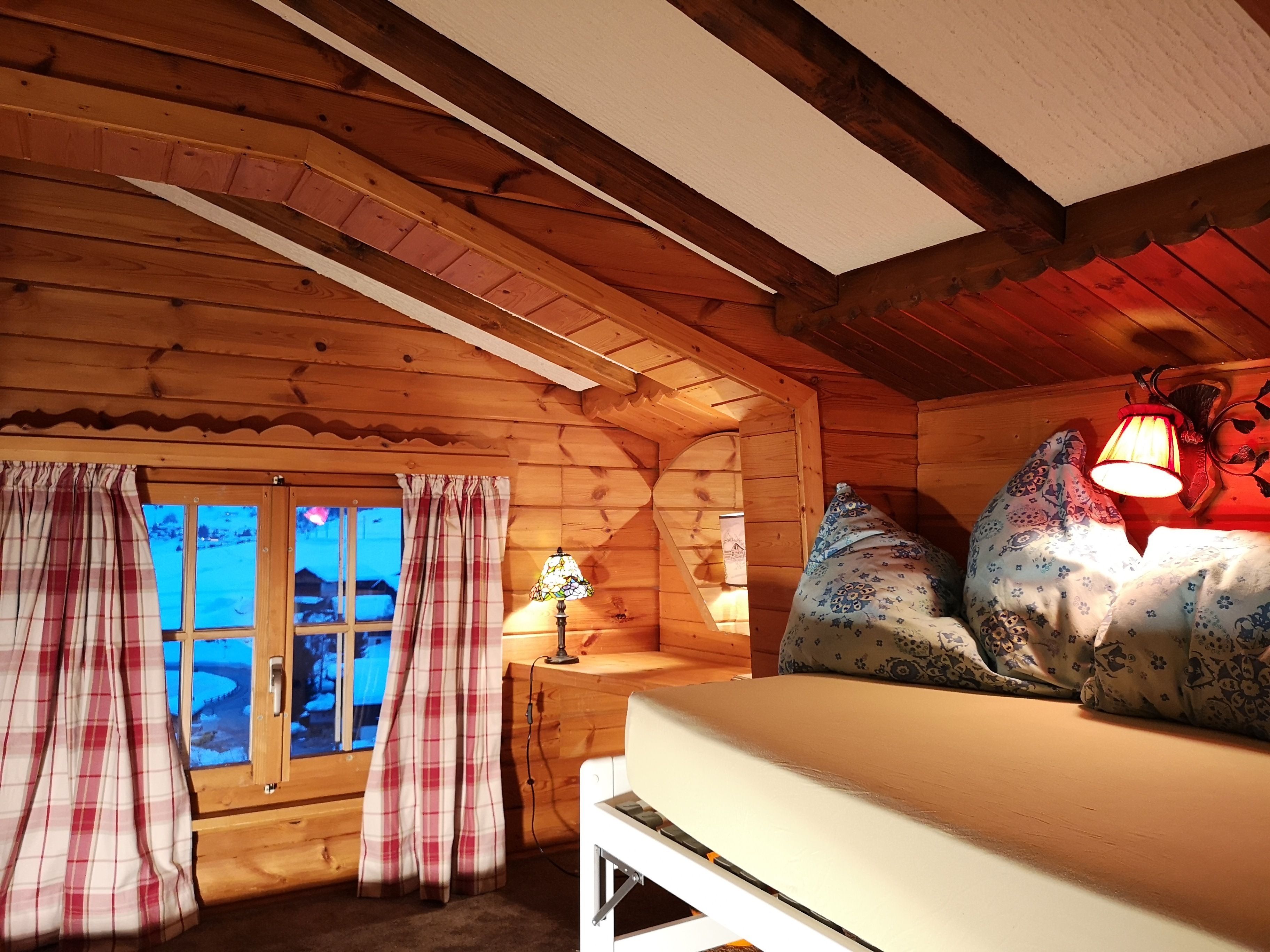 Grundriss ca. ca. 46 m2, 1 Schlafzimmer mit Doppelbett angezogen, 1 Zimmer mit 2 Betten angezogen (Dach abgeschrägt), 1 Wohnzimmer mit integrierter offener Wohnküche, Induktions-Kochherd, Dunstabzug, Geschirrspüler, Kühlschrank, Profi Steam-Backofen mit Dampfgarer, Küchengeräte / Utensilien, Küchentücher vorhanden; Esstisch; Erhöht kuschelige Sitzecke mit Panorama-Aussicht; Exquisit modern konzipiertes Bad/WC, Dach abgeschrägt; Internet, Wi-Fi; Satelliten-TV; am Haus angrenzend gemütlicher Aussensitzplatz und Garten, Waschautomat zur Mitbenützung; Zentrale Ölheizung mit Radiatoren/Heizwänden. Boiler (Aufheizung elektrisch/mit Ölheizung); Stau-Platz für Ski und Skischuhe vorhanden; Parkplatz