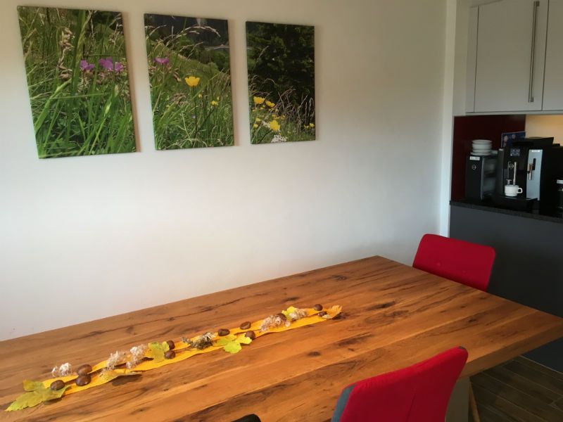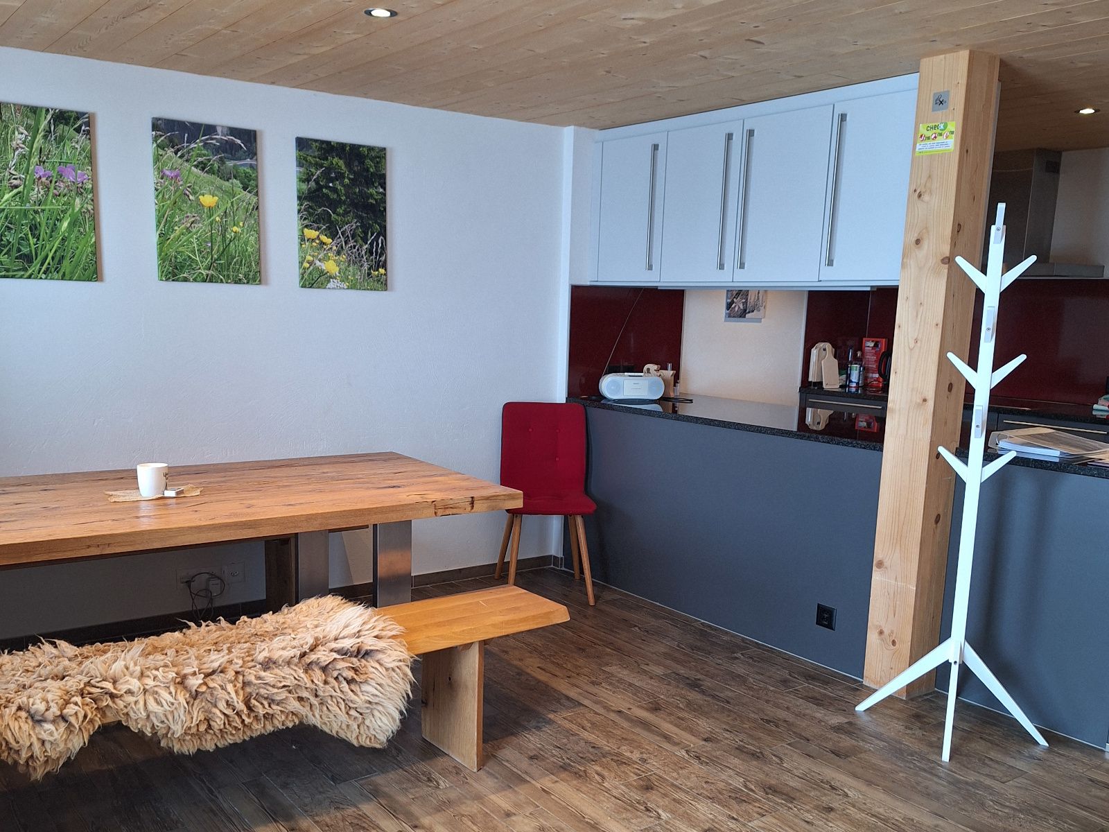 Offener Wohnraum mit Küchen-/Essbereich mit traumhafter Aussicht auf die Berge. Im Wohnbereich befindet sich ein grosser Tisch mit Bank und Stühlen. WLAN in der ganzen Wohnung (Kostenlos,ausschaltbar)Küche: