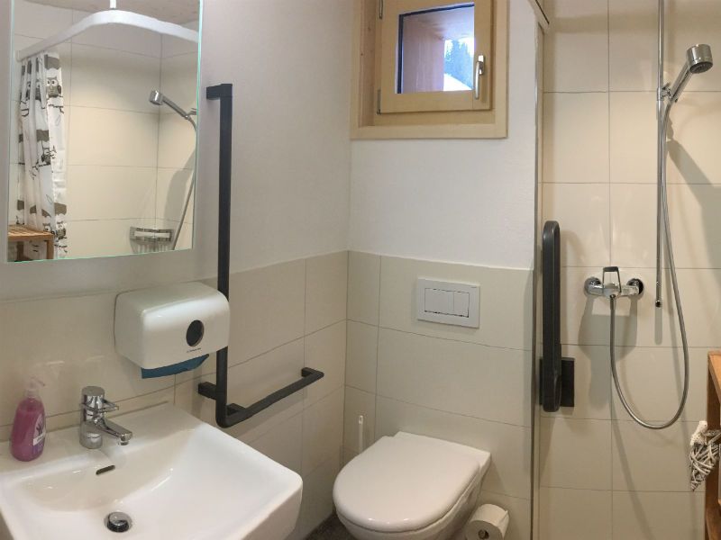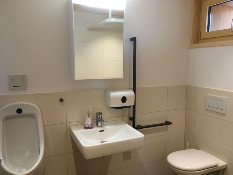 Das Badezimmer verfügt über eine Dusche, Pissoir und behindertengerechte Lavabo und WC. Haartrockner und Badezimmerwäsche achten Sie bitte, dass sich der Heizungsraum im selben Geschoss befindet. Geräusche der Heizung (Ein/Ausschalten, Pumpe) sind nicht zu vermeiden. Die Geräusche sind nicht laut, können aber von sehr lärmsensitiven Leuten als störend empfunden werden!