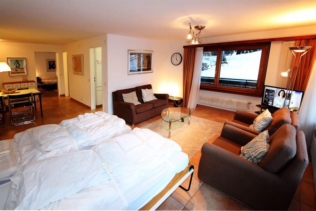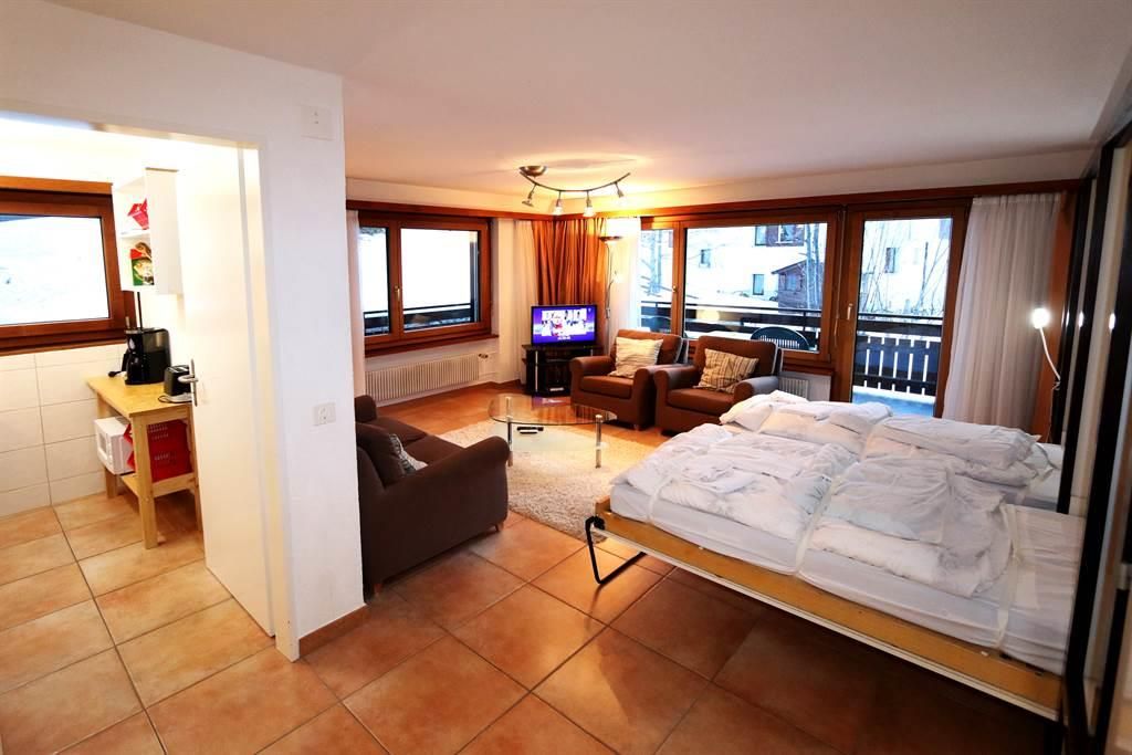 2-Zimmer-Wohnung in ruhiger und sonniger Umgebung, bestehend aus 1 Schlafzimmer, 1 Wohnzimmer mit 2 Schrankbetten, Küche, 1 Bad / WC und Südbalkon mit herrlichem Bergblick. Gratis Wifi ist verfügbar.