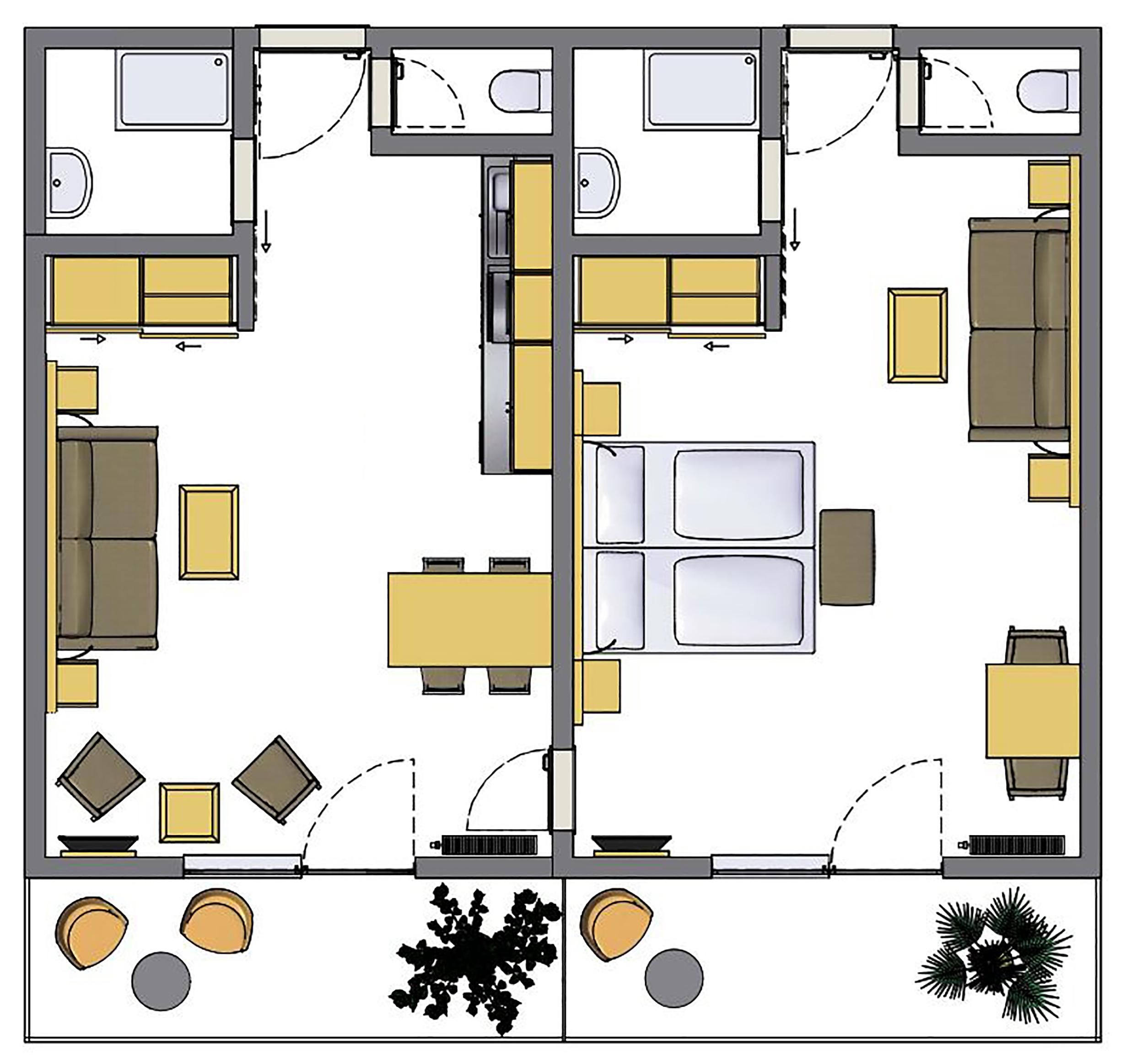 Große, sonnige Ferienwohnung, 60 m² bestehend aus zwei sonnendurfluteten, hellen Zimmern, neu renoviert, 1 Zimmer mit Küchenzeile und Doppelbett, 1 Zimmer mit Doppelbett und Sitzecke, TV, Telefon, 2 x Südbalkon, 2 x Bad, 2 x WC, Küche mit Backofen, Mikrowelle, Kaffeemaschine, Gästewaschmaschine und -Trockner vorhanden