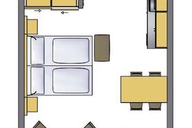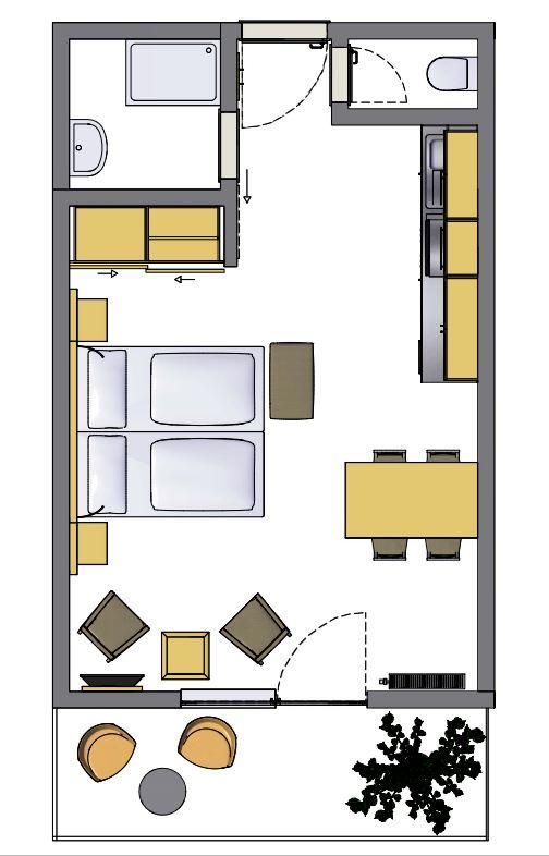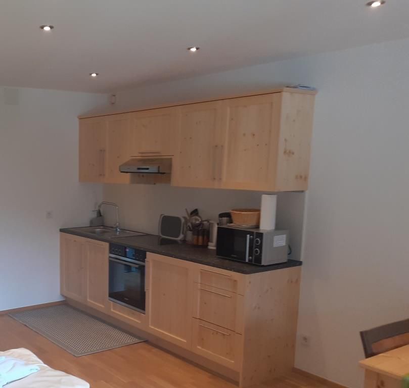 1-Zimmerappartment mit 49m², Südbalkon, herrlichem Ausblick, großer Wohn-Schlafraum mit Sitzecke, Küchenzeile und Doppebett.
