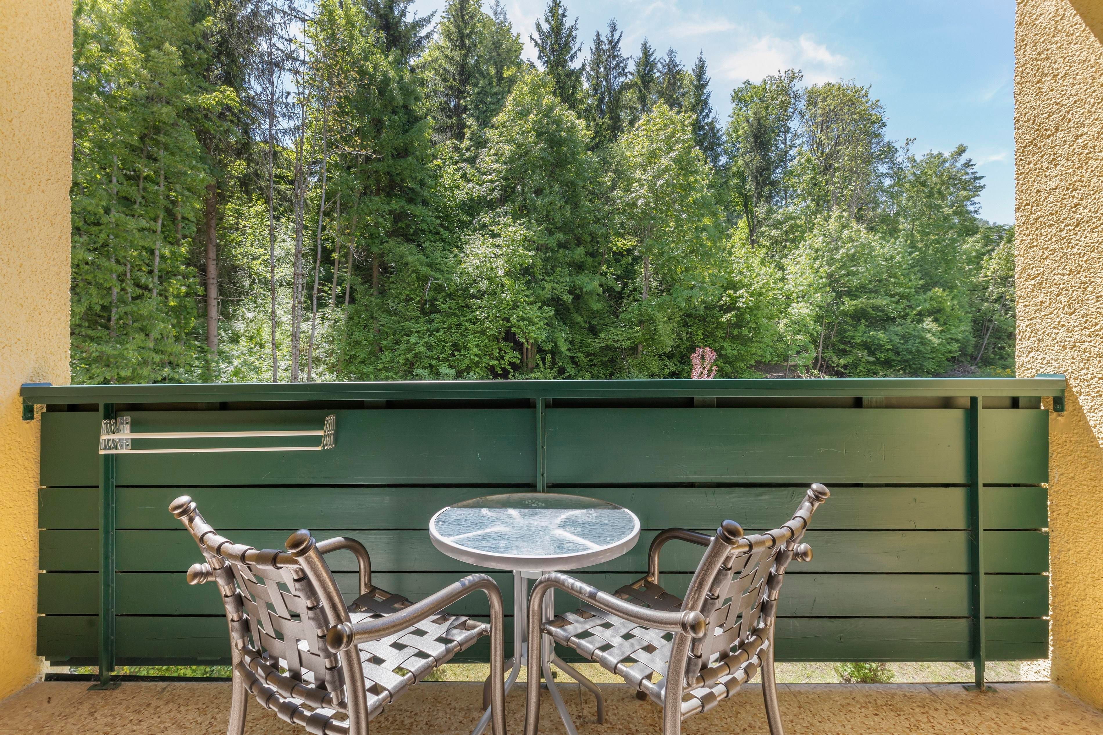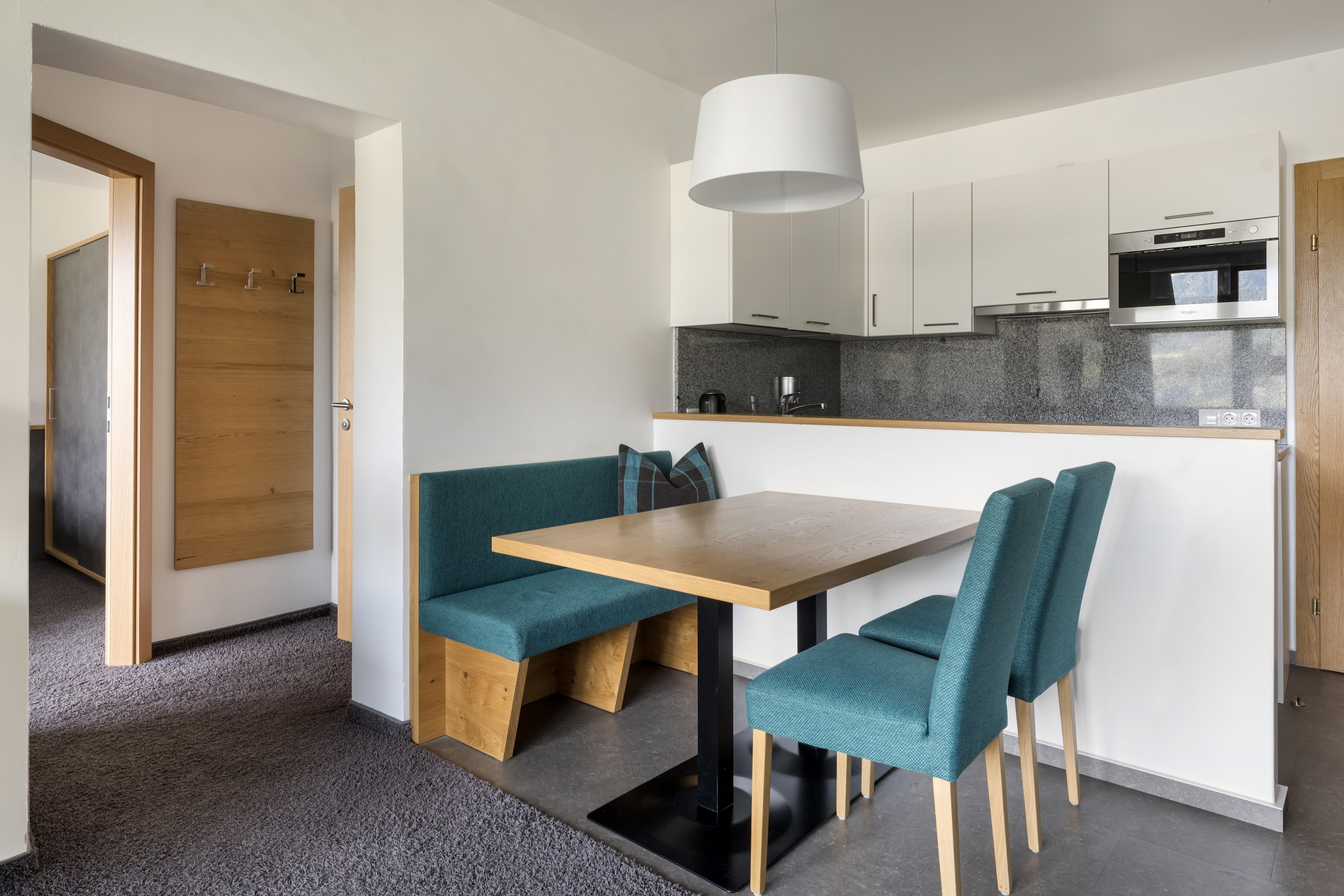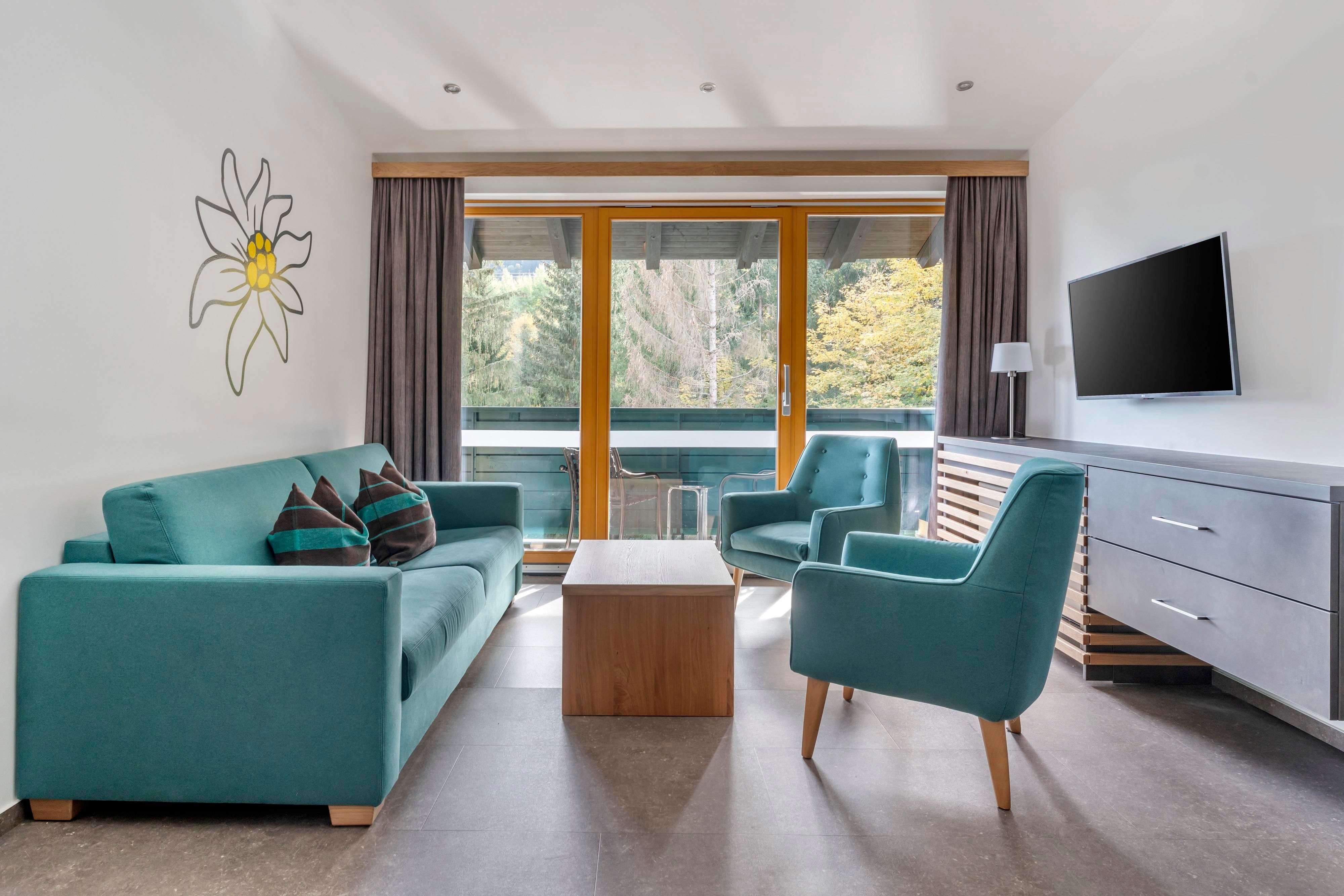 Jedes One bedroom Apartment verfügt über ein Schlafzimmer mit Doppelbett, das mit einer Topmatratze, luxuriöser Bettwäsche und Smart-TV ausgestattet ist, sowie einen offenen Wohnbereich mit Schlafsofa und Smart-TV. In der gut ausgestatteten Küche befinden sich ein Kochfeld, eine Mikrowelle, ein Toaster, Geschirrspüler, Wasserkoche, Kühlschrank, umfangreiche Kochutensilien und Reinigungsmittel. Jedes Appartement hat ein Badezimmer mit Badewanne oder Dusche, einen eigenen Balkon oder eine Terrasse und bietet einen herrlichen Blick auf die Berge oder den Wald.