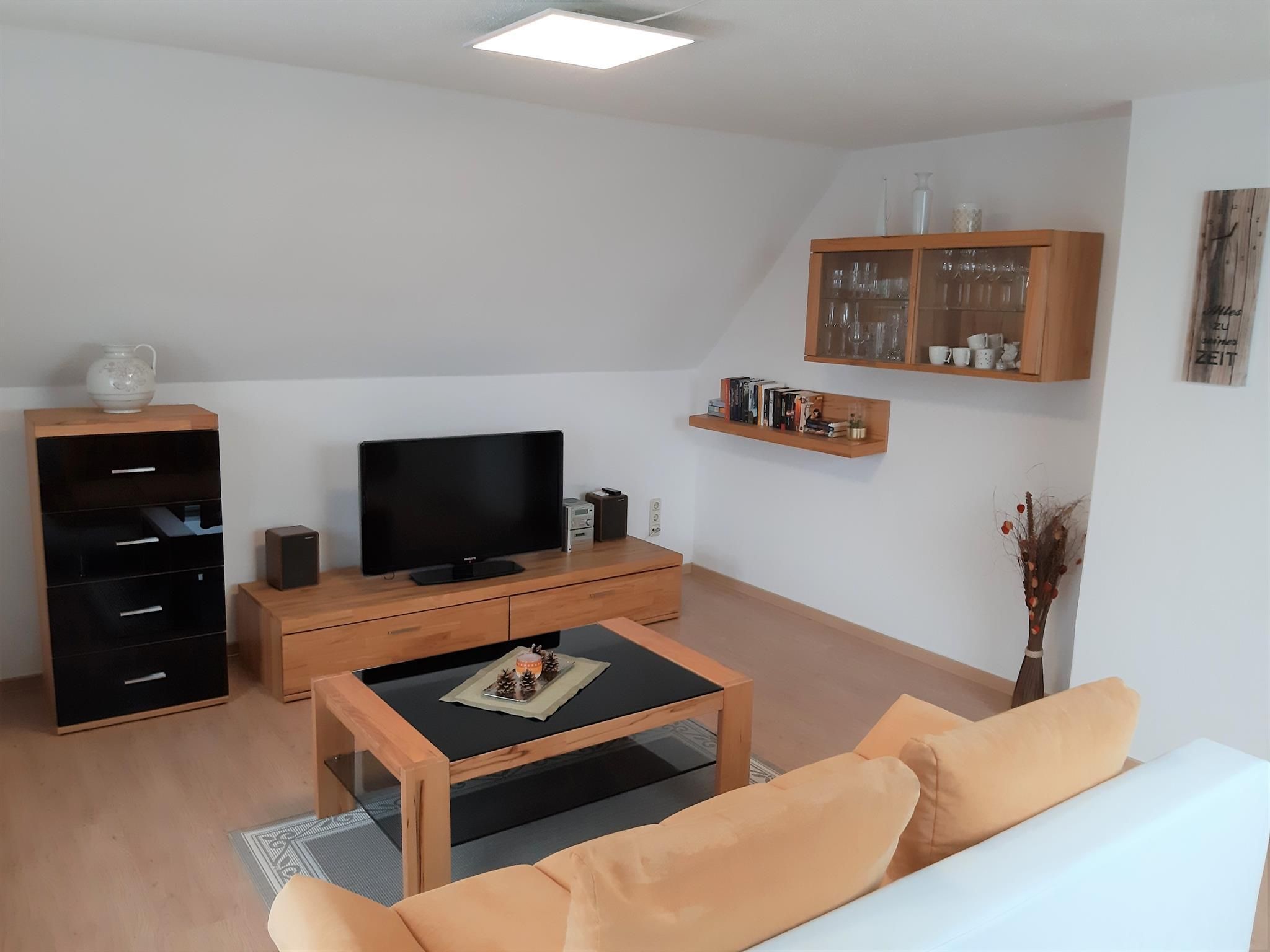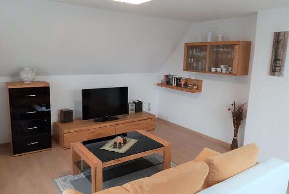 3 - Raum - Ferienwohnung Nr. 3 mit Balkon, ca. 75 m², für 2-4 Personen im Obergeschoss: Wohnraum mit Panoramablick, Schlafraum (Doppelbett), Wohnküche mit Spülmaschine + Backofen, Essecke und 2 x Schlafcouch, Dusche und WC getrennt, Garderobe, inkl. sämtl. Wäsche