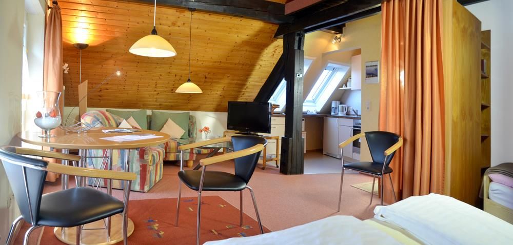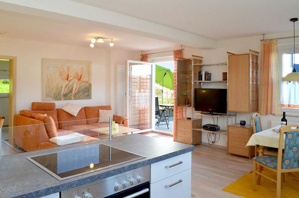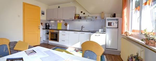 Alle 6 Ferienwohnungen haben eine komplett ausgestattete Wohnküche, Küchenzeile oder Kochnische, inkl. Mikrowelle, Kaffeemasch., Wasserk., Toaster, Backofen, Spülmaschine und Gefrierschrank oder Gefrierfach (Studio ohne Spülmaschine).