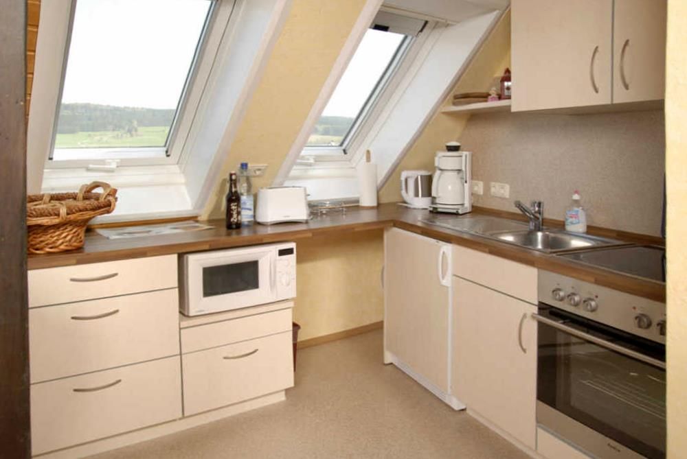 Alle 6 Ferienwohnungen haben eine komplett ausgestattete Wohnküche, Küchenzeile oder Kochnische, inkl. Mikrowelle, Kaffeemasch., Wasserk., Toaster, Backofen, Spülmaschine und Gefrierschrank oder Gefrierfach (Studio ohne Spülmaschine).