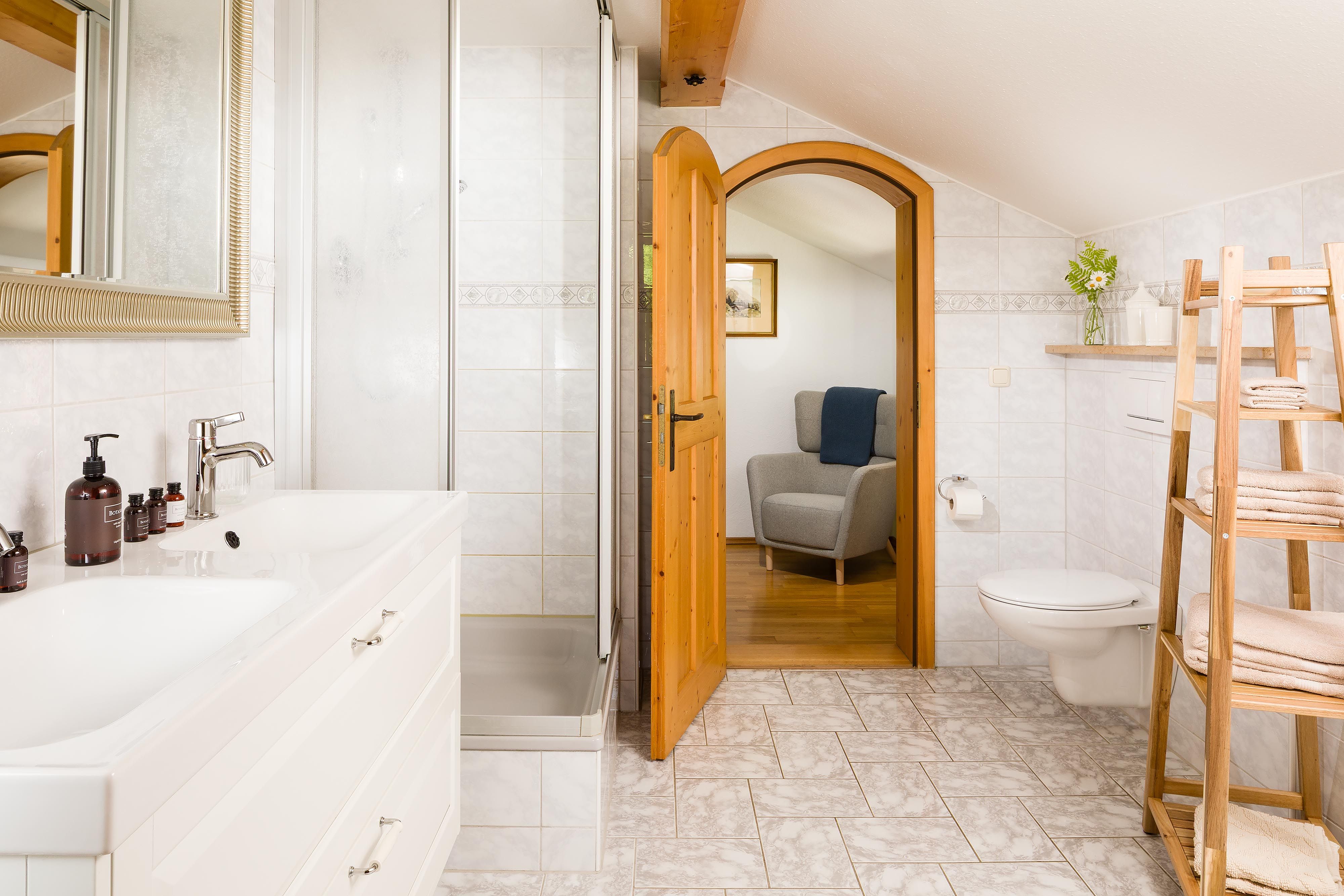 Am großen Doppelwaschbecken und der Eck-Dusche können Sie entspannt und mit Komfort in den Tag starten.