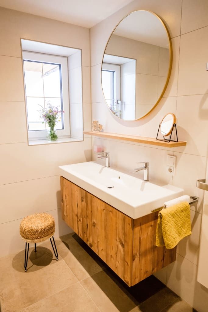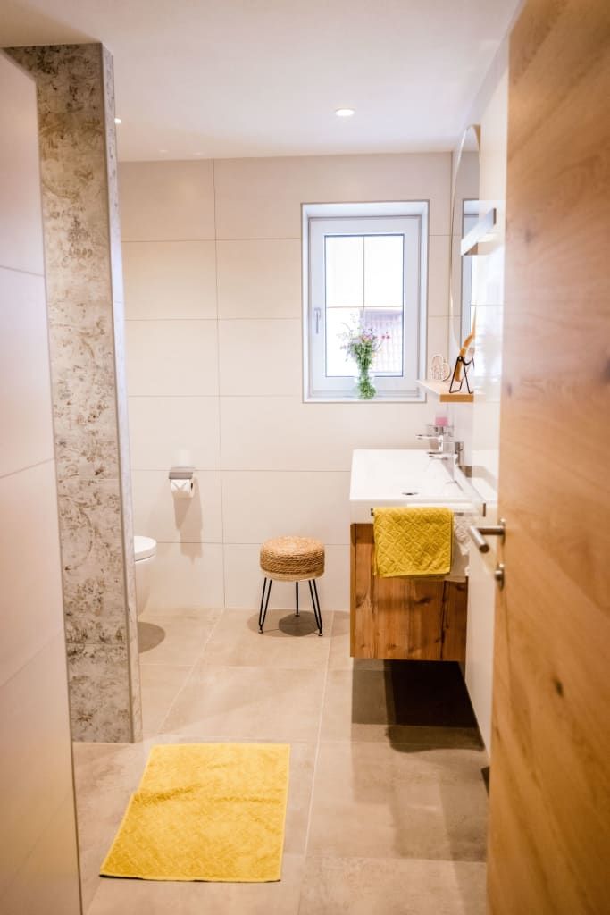 • Eichenholzboden, natürliche Materialien, liebevolles Design in Gelbtönen