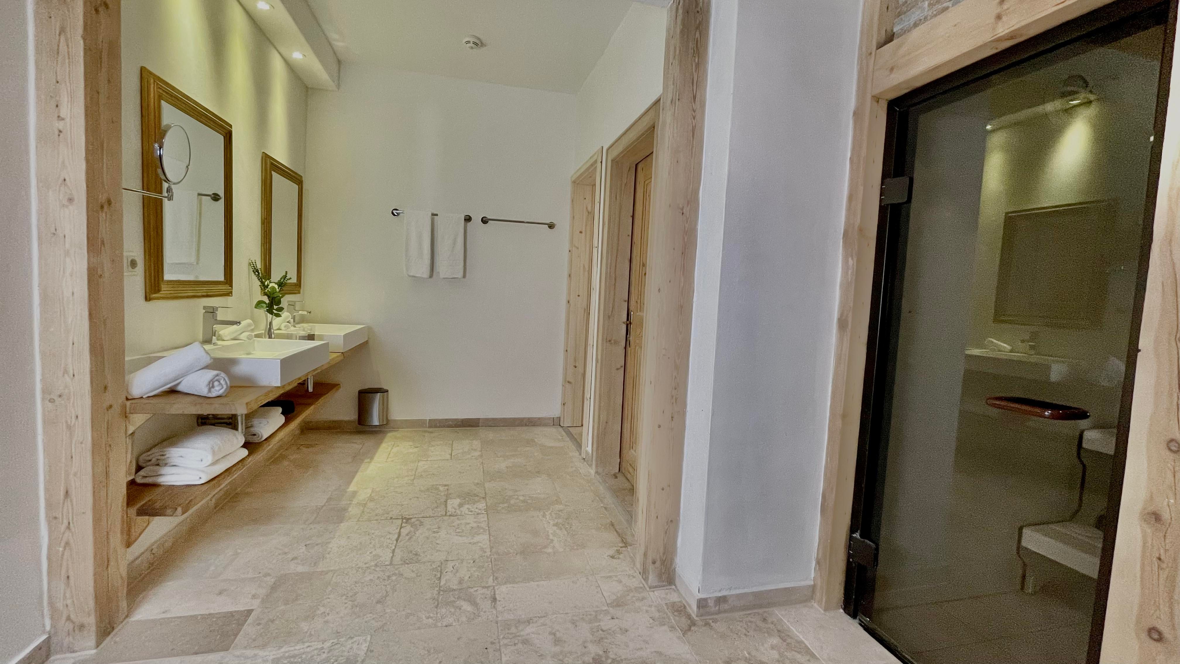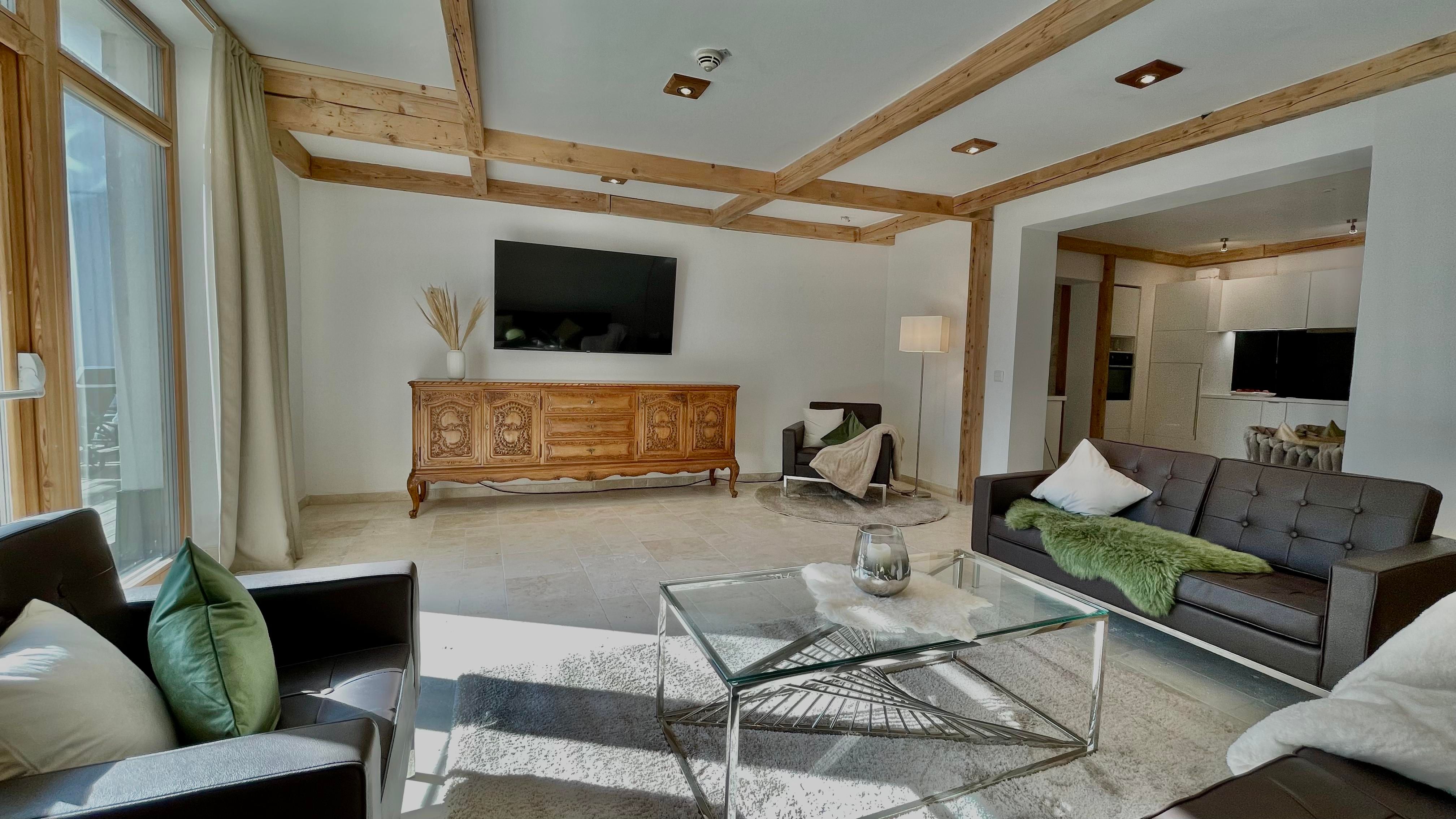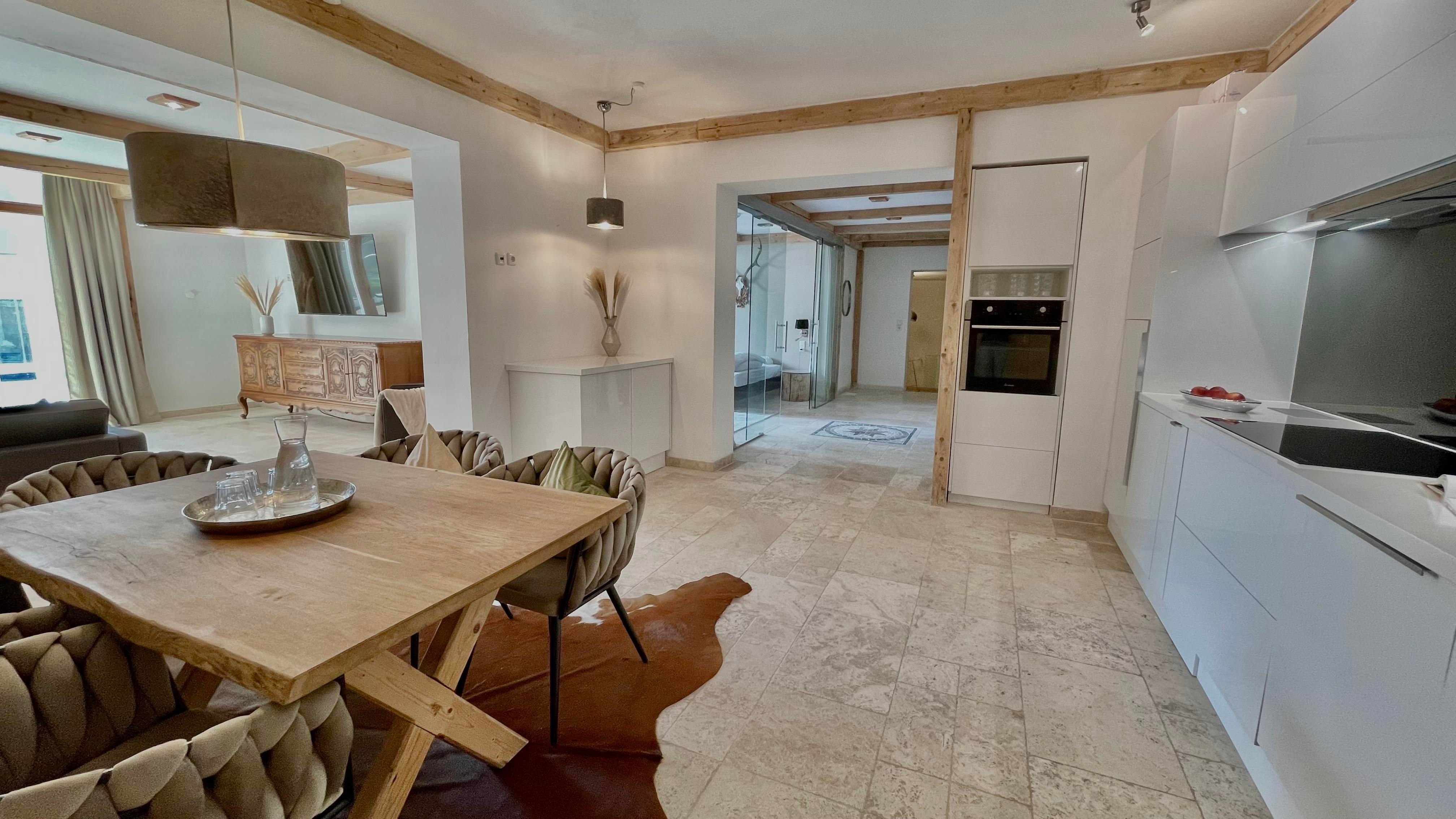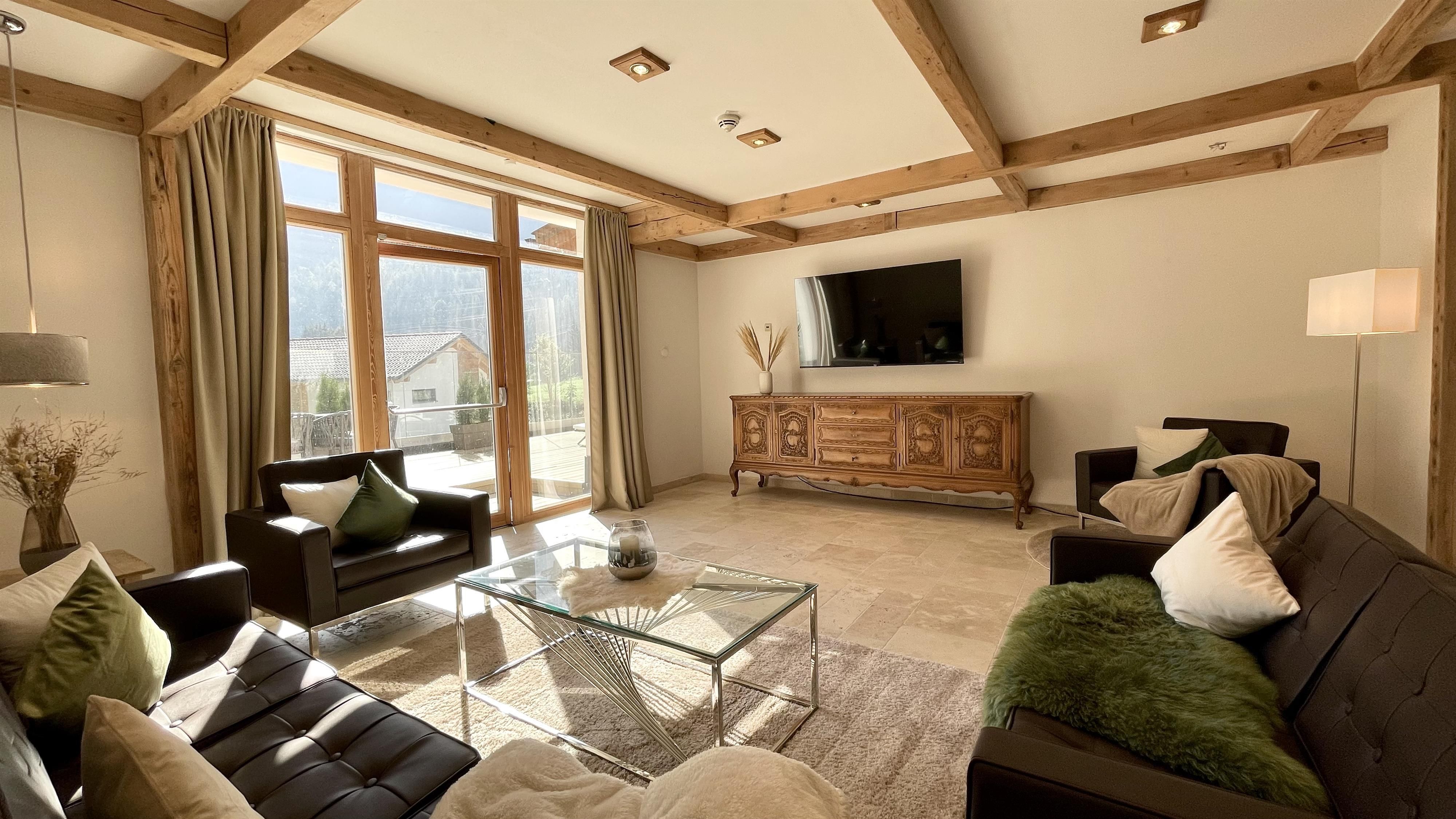 Dieses stilvolle 124 m²-Apartment für bis zu 4 Personen vereint Komfort und Luxus. Es bietet einen offenen Wohn- und Essbereich mit voll ausgestatteter Küche, ein Schlafzimmer mit Zugang zur Terrasse, ein abgetrenntes Kinderzimmer, sowie ein luxuriöses Bad mit Dusche, Badewanne, Sauna, Dampfbad und separatem WC – ideal für entspannte Urlaubstage mit traumhaftem Bergblick.