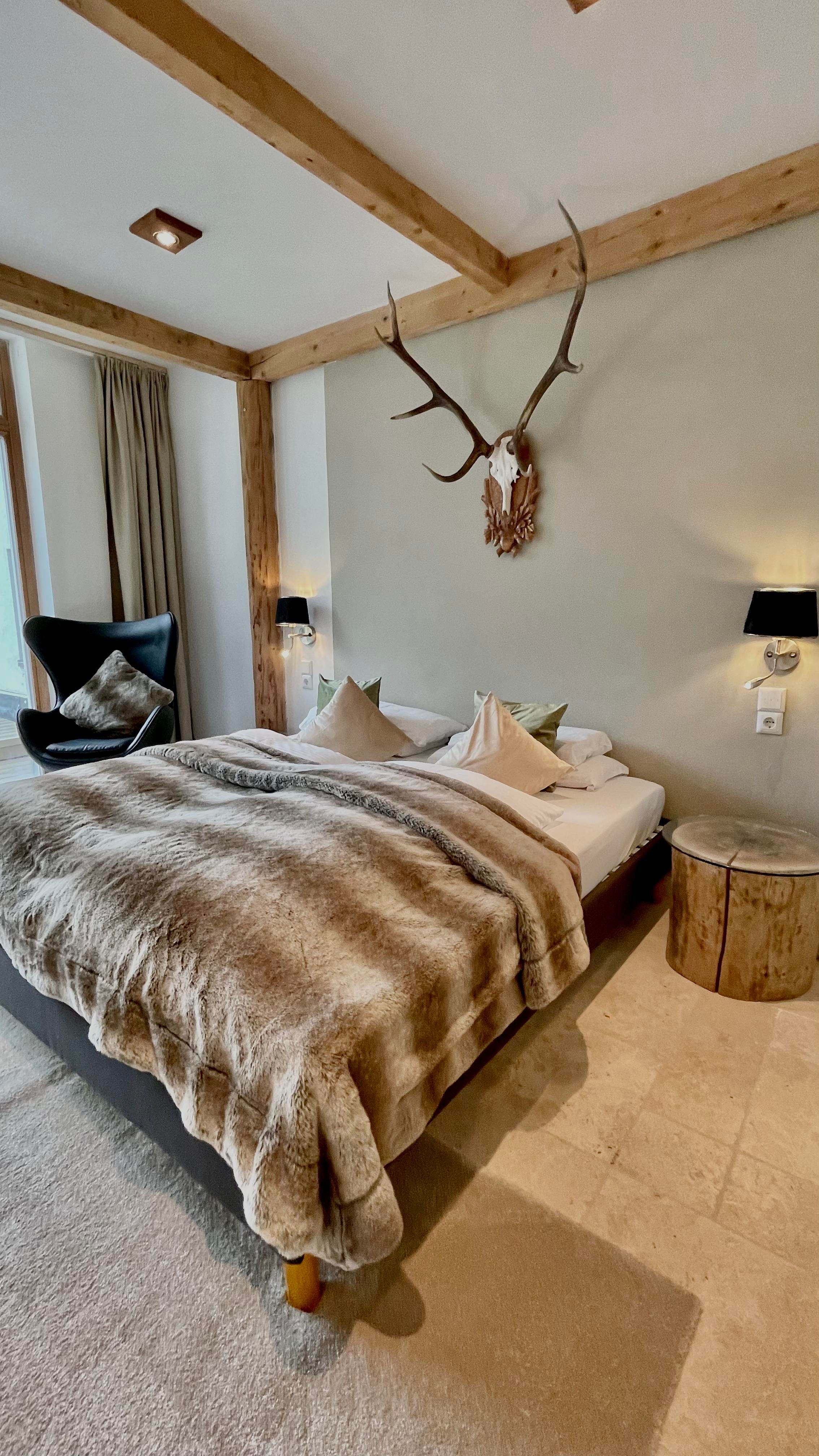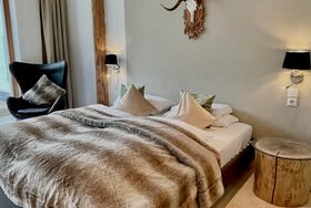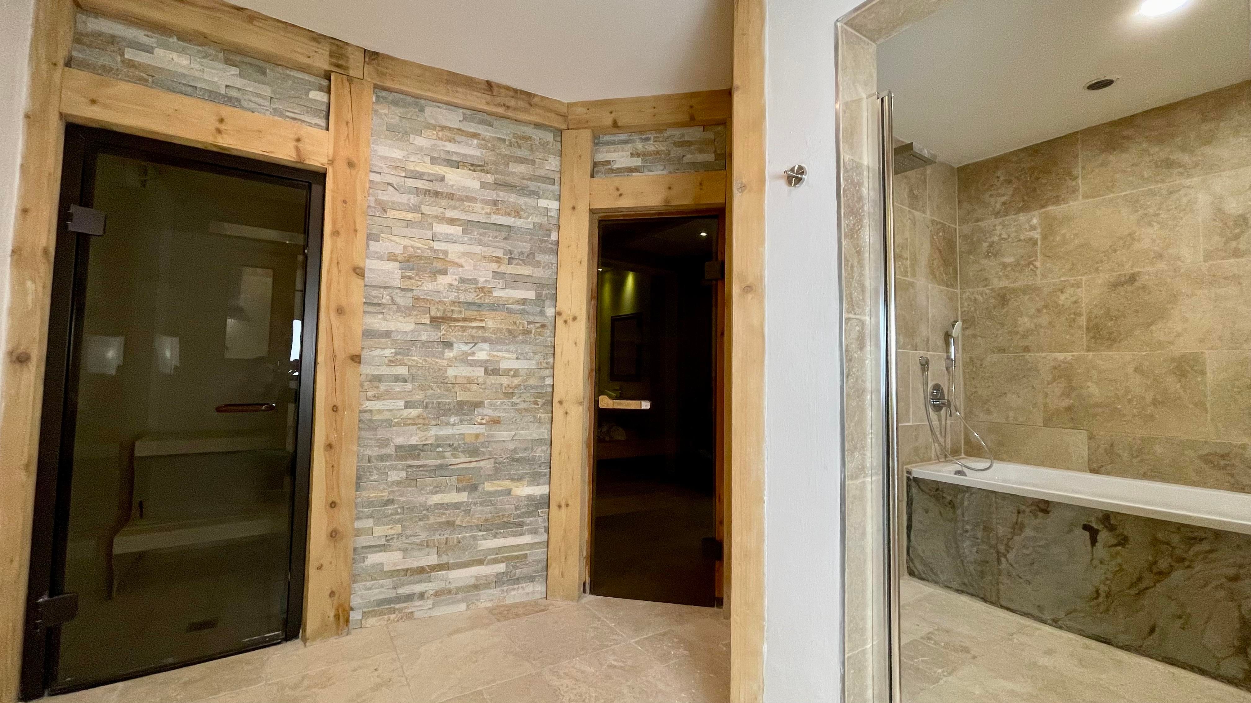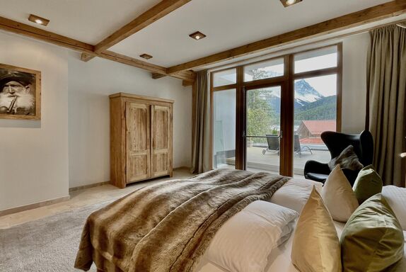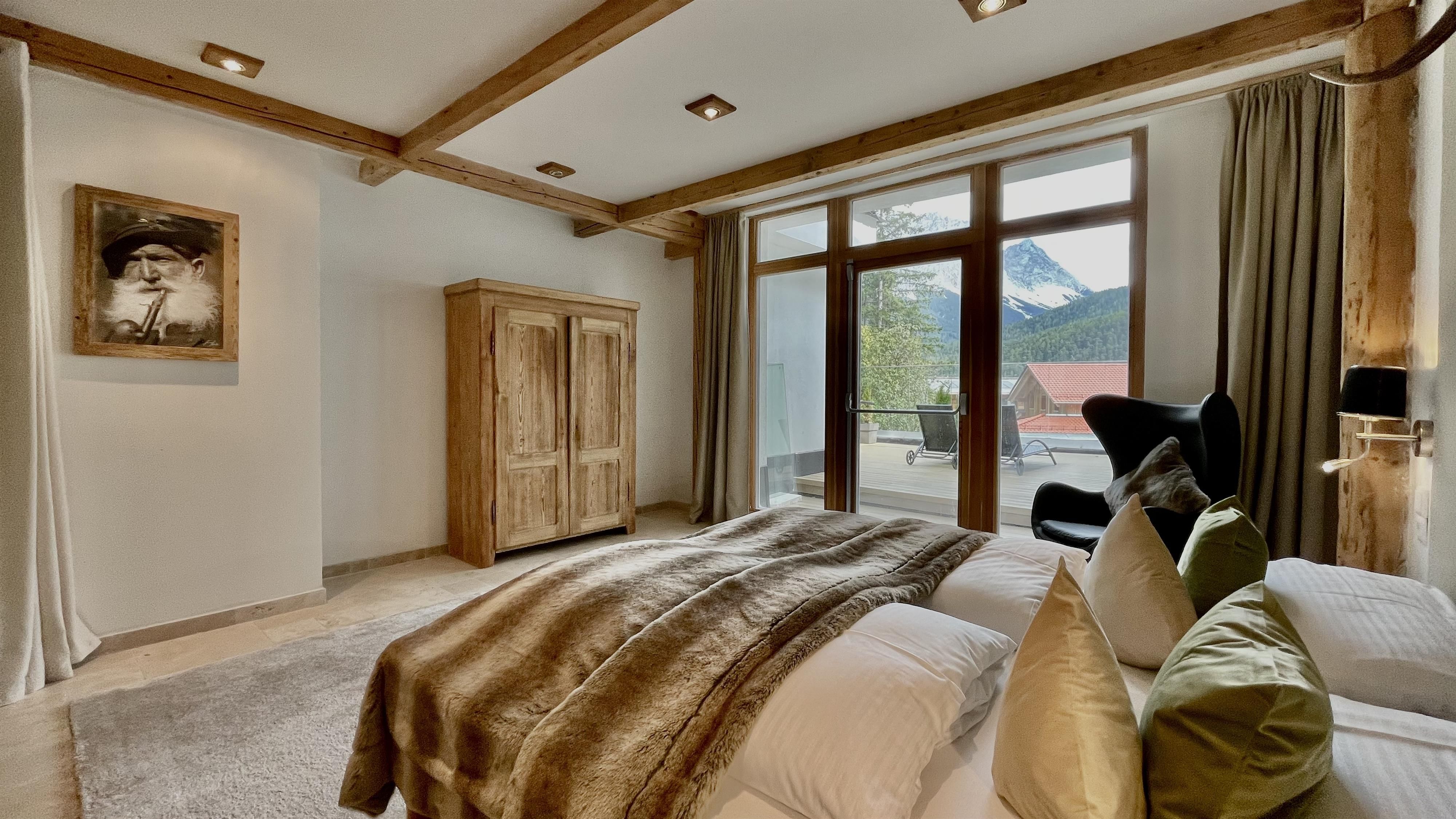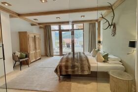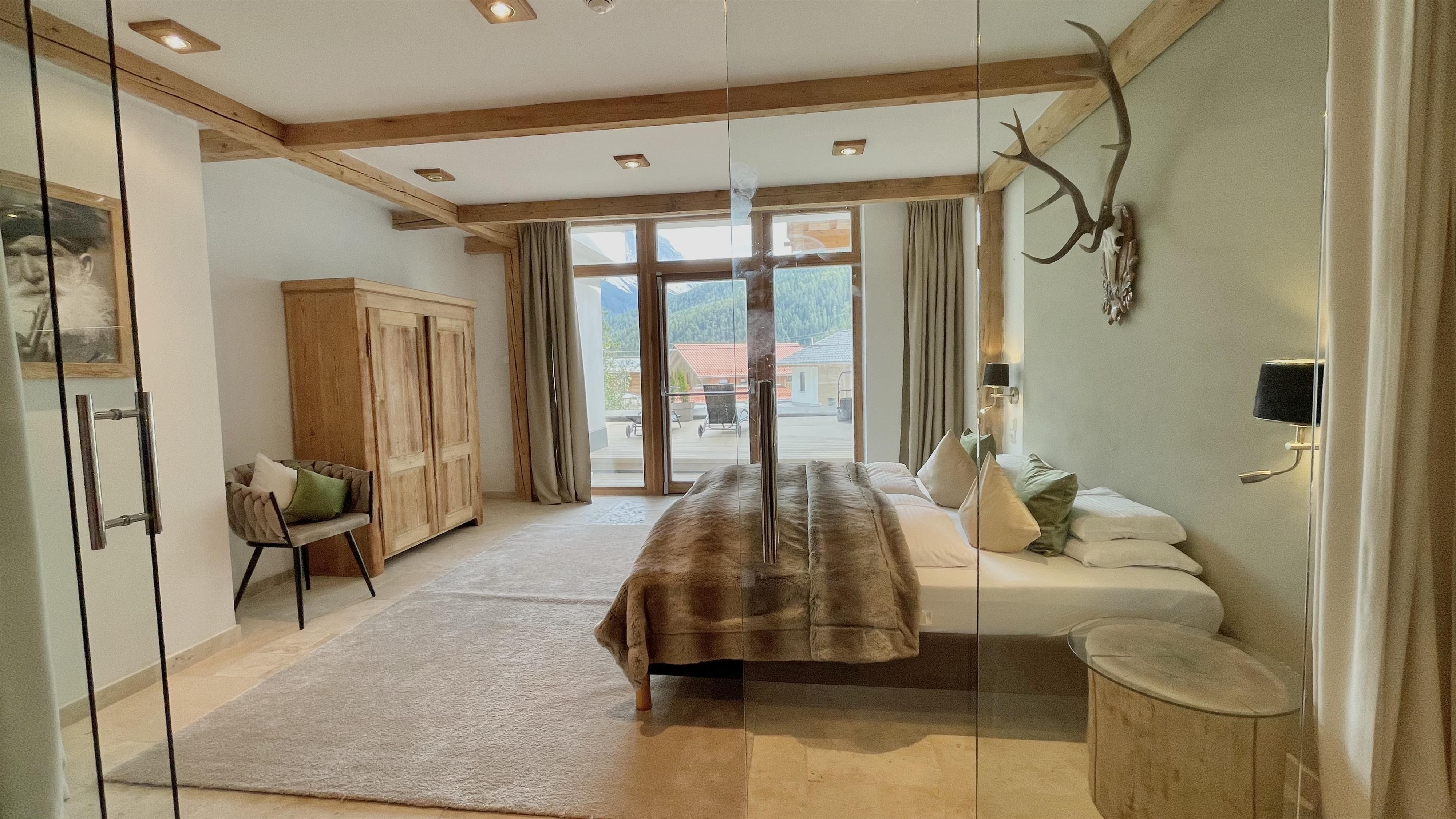 Dieses stilvolle 124 m²-Apartment für bis zu 4 Personen vereint Komfort und Luxus. Es bietet einen offenen Wohn- und Essbereich mit voll ausgestatteter Küche, ein Schlafzimmer mit Zugang zur Terrasse, ein abgetrenntes Kinderzimmer, sowie ein luxuriöses Bad mit Dusche, Badewanne, Sauna, Dampfbad und separatem WC – ideal für entspannte Urlaubstage mit traumhaftem Bergblick.
