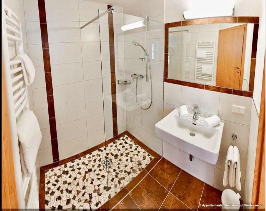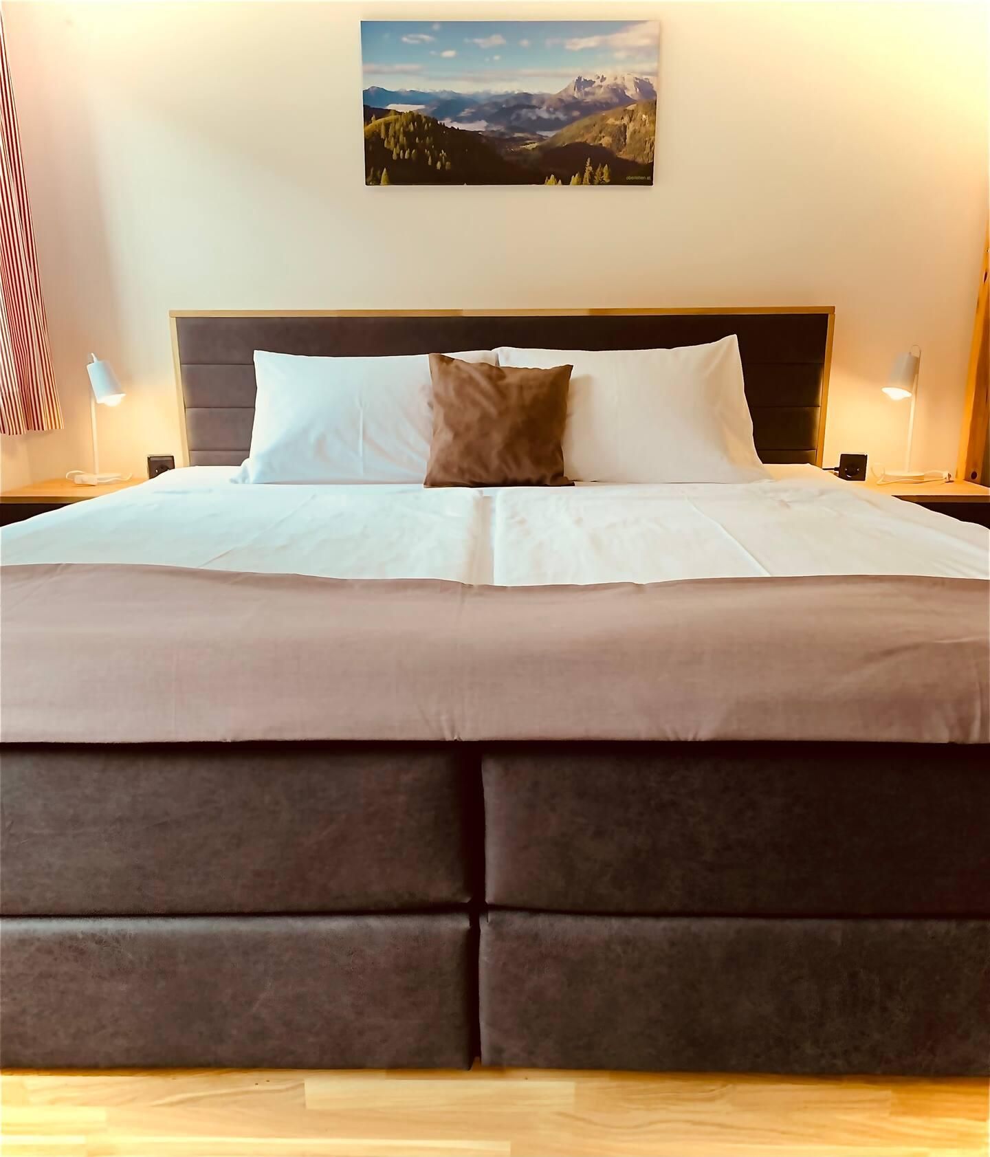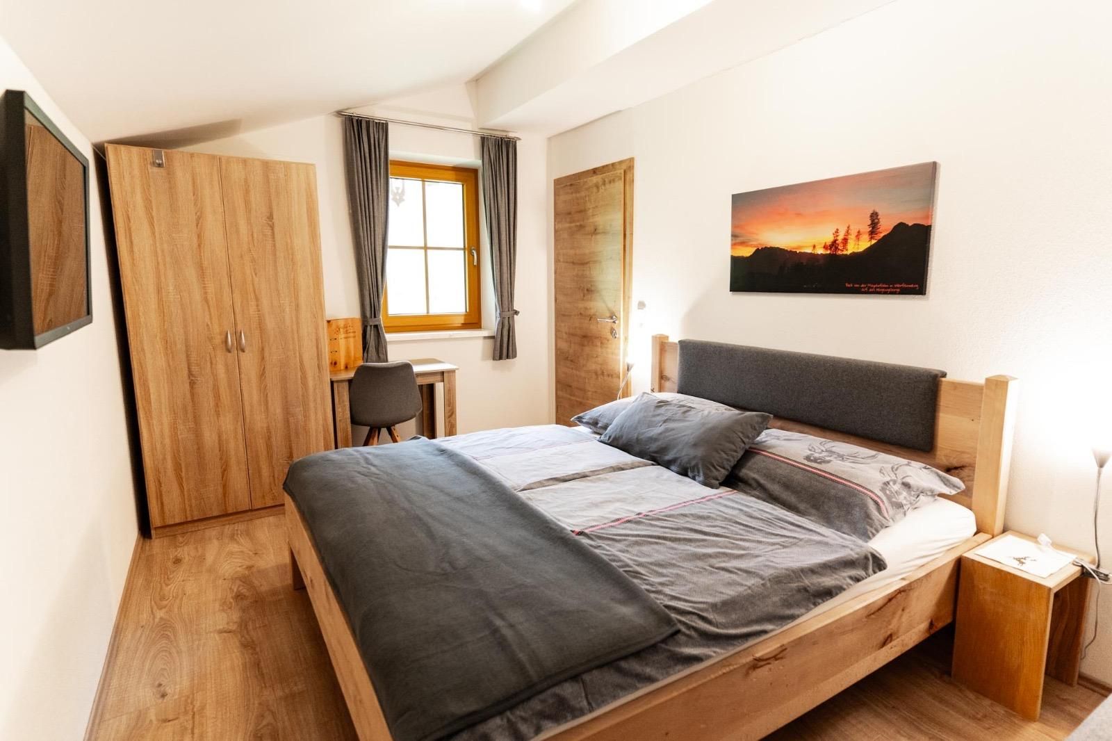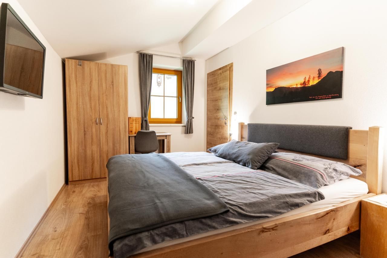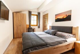 Unser sehr schönes Appartement Bergromantik ist mit komfortabler Wohnküche, bequemer Couch, Esstischgruppe und 2 Doppelzimmern, Bad mit Dusche und Handtuchtrockner, Haartrockner, Seife und Handtücher und Duschtücher, WC extra, und Balkon ausgestattet.